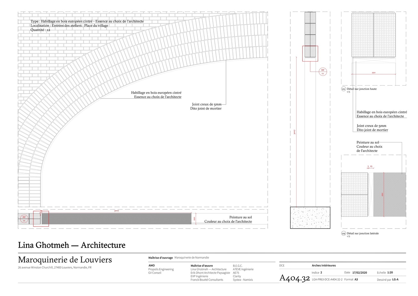 The lines lead to the entrance where one is embraced by an open courtyard. An oak tree centers the space and leads into the internal square: a meeting point, a gathering place of dialogue between artisans under the wooden spanning beams. Here the space is magnificently dressed by the work of the artist Emmanuel Saulnier seen suspended in this “plaza” with large needles interlacing in mouvement and tracing the galops of horses in a similar way to the arches dressing this building’s architecture. This movement also echoes the gestures of the hands at work, as crafts makers handle colors, under the light bathing the large volumes of the different workshops.