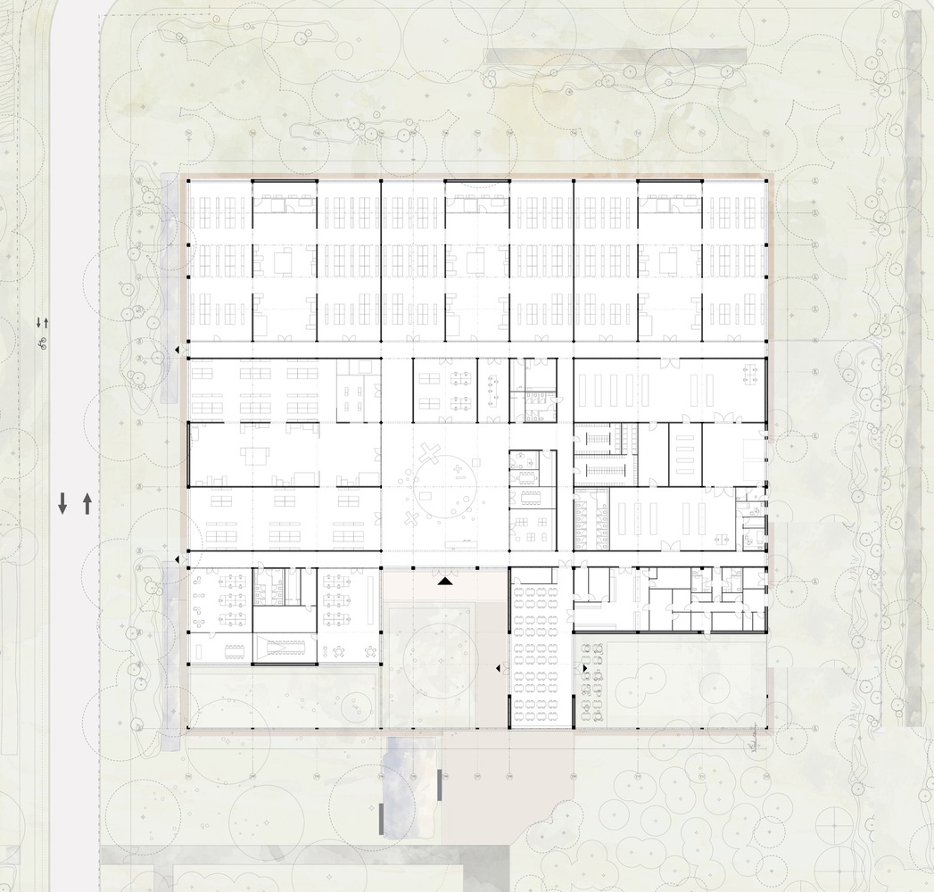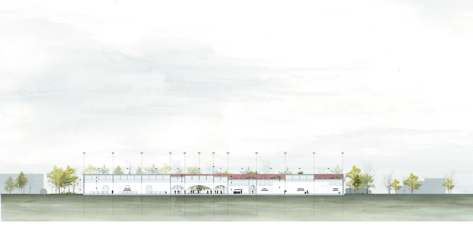 Structural, Fine, and coupled, these bricks gallop along the building’s envelope, from span to span, they are orchestrated at 9-meter-long intervals drawing a perfect square from face to face: the plan of this factory. Like "an archeology of the future", this building literally emerges from the memory of its place, on the remains of a Magdalenian hearth attesting to the relationship between humans and their tools. It invites nature at its heart, drawing time between the lines of architecture and the sinuous landscape remodeled by the excavated earth of the site.