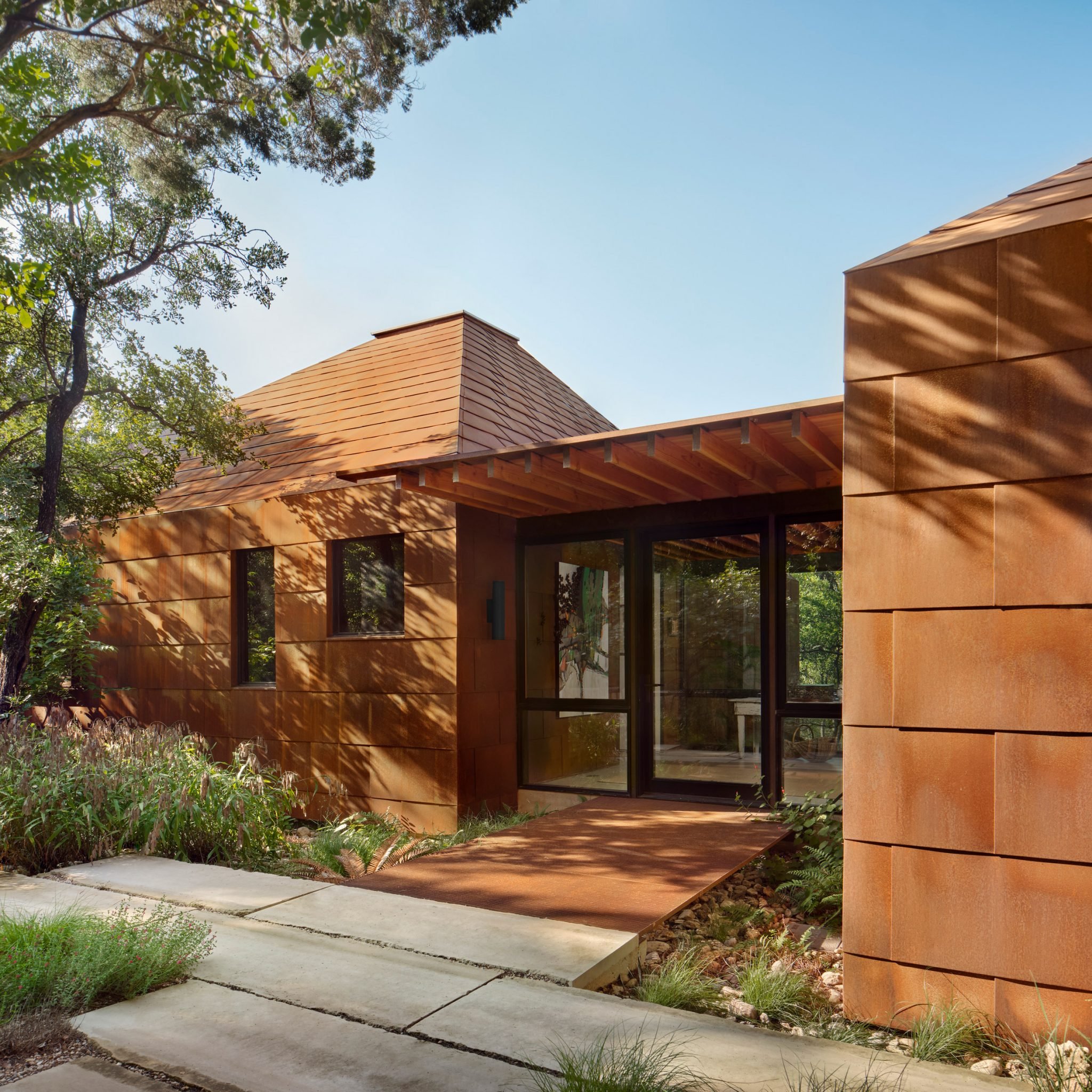 4개로 나누어진 텍사스에 위치한 하우스는 주변 자연환경과 밀착된 거주공간을 완성한다. 건물과 건물사이 자연스레 외부공간이 형성되고, 이 공간은 다시 내부로 공간으로 유입된다. 이렇게 동기화된 자연은 박공지붕의 형태를 따라 사선형태로 이루어진 지붕의 천창을 통해 확장된다. 코르텐스틸강 또한 자연스레 녹슬어 가면 함께 에이징처리 된다.