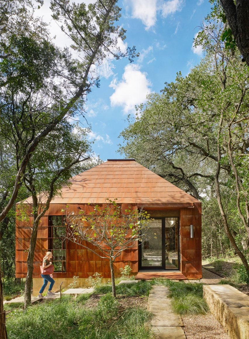 Shingle like panels made of weathering steel clad the pyramidal forms at the River Bend Residence, a project designed by Texan studio Lake Flato Architects to "sit lightly upon the land".