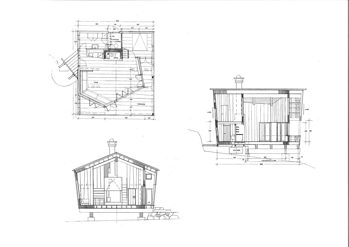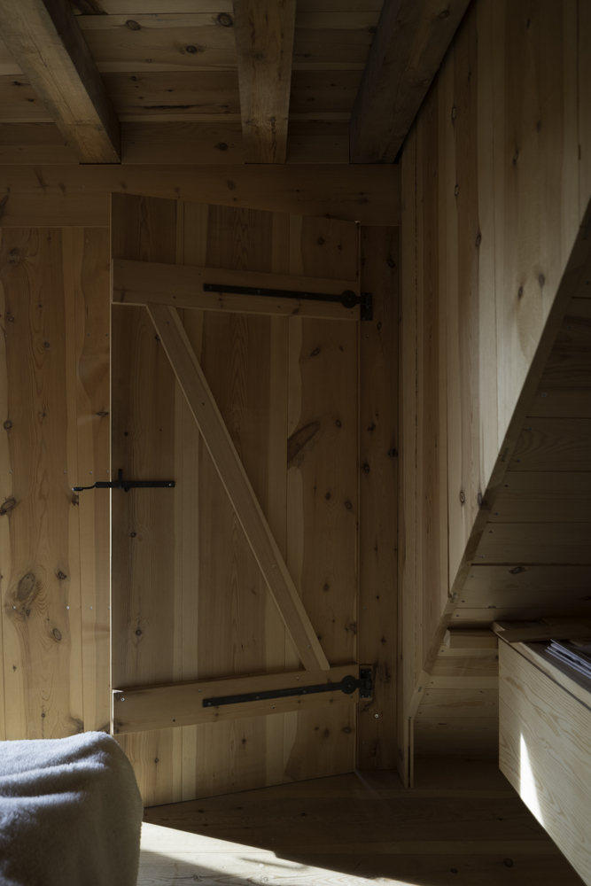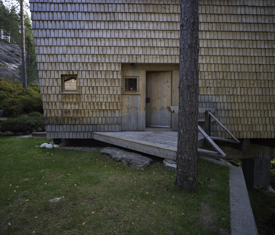 Bedrooms and storage rooms located at the back. The sloping walls protect the shingle cladding from weather stress and keep the terrace dry throughout the year. On the outside, both the roof and walls are clad with heartwood pine shingles. Inside is used pine planks which are cut to the entire thickness of the log.