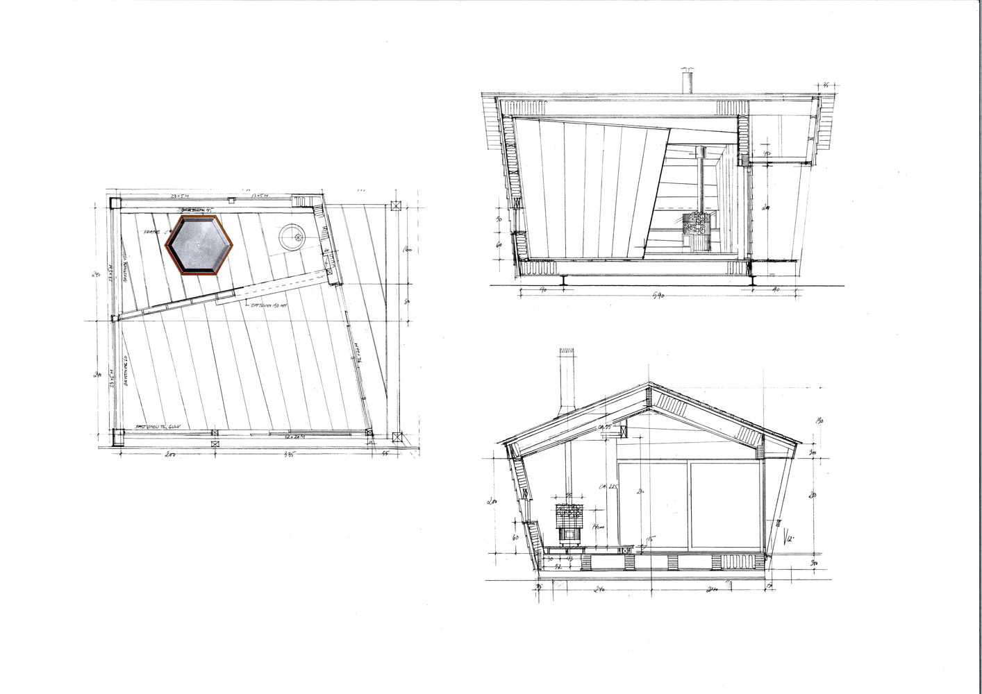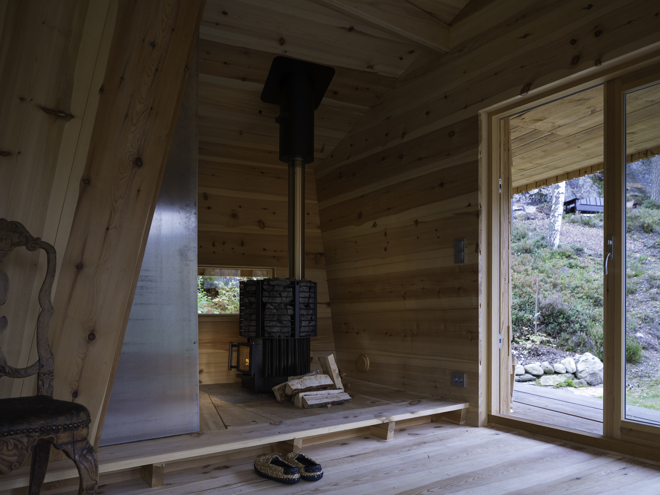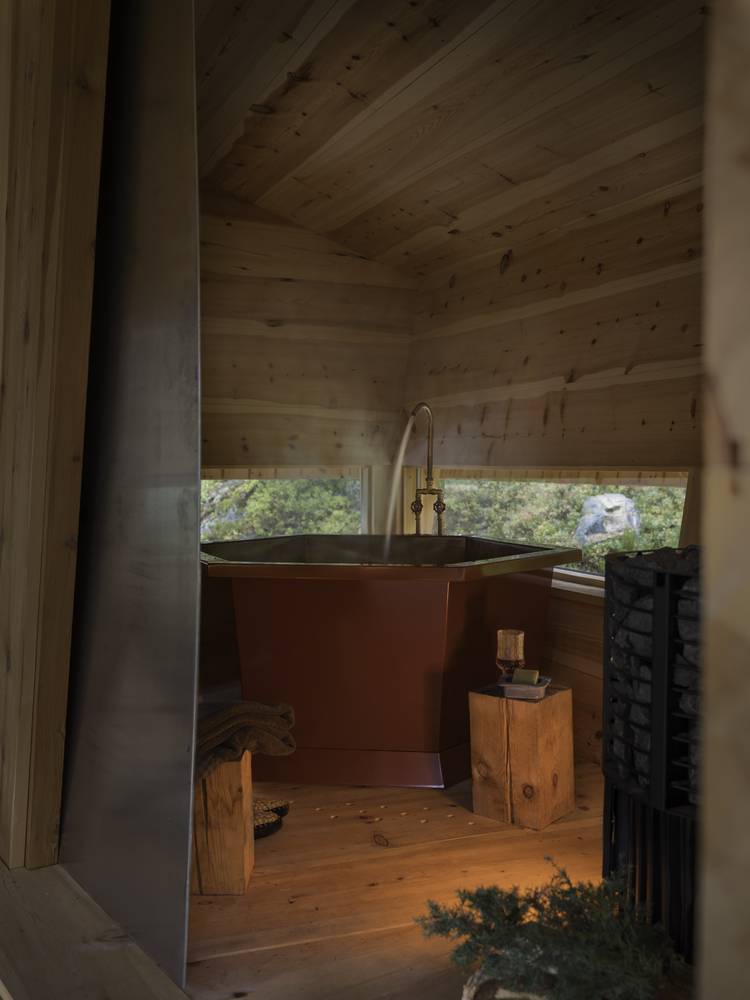 The planks, therefore, have a tapered thickness which provides an extra challenge for the carpenter during laying. The sauna annex consists of a sauna with a self-designed aluminum bathtub and a wood stove.