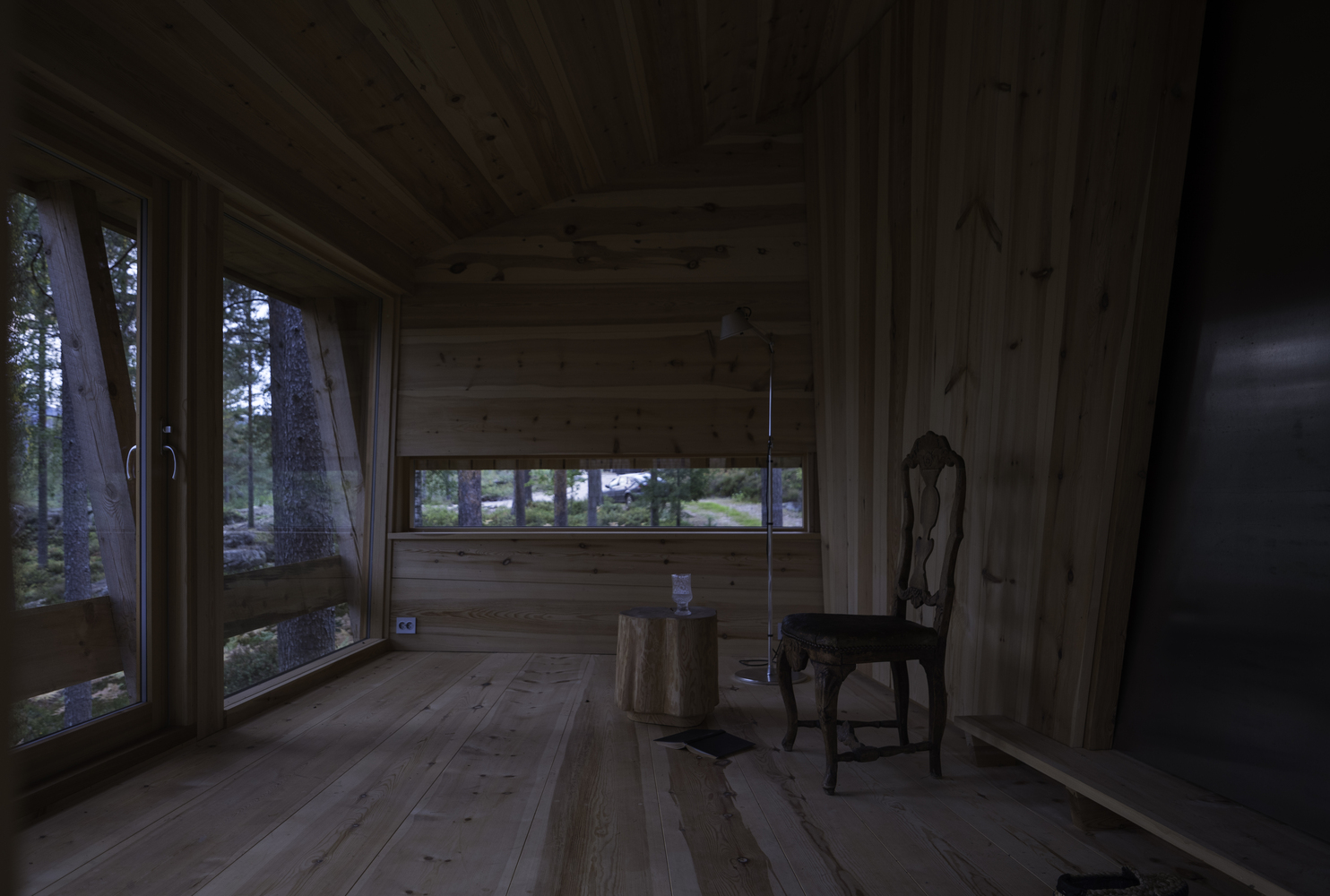 In addition, is a restroom with sliding glass doors that can be opened to the forest and lake. Both the cabin and sauna are set on poles so that the whole construction is lifted above the ground. It causes all surface water from both rain and melting snow to easily drains away. All fixed furnishing, including doors and sofas, are made on-site.