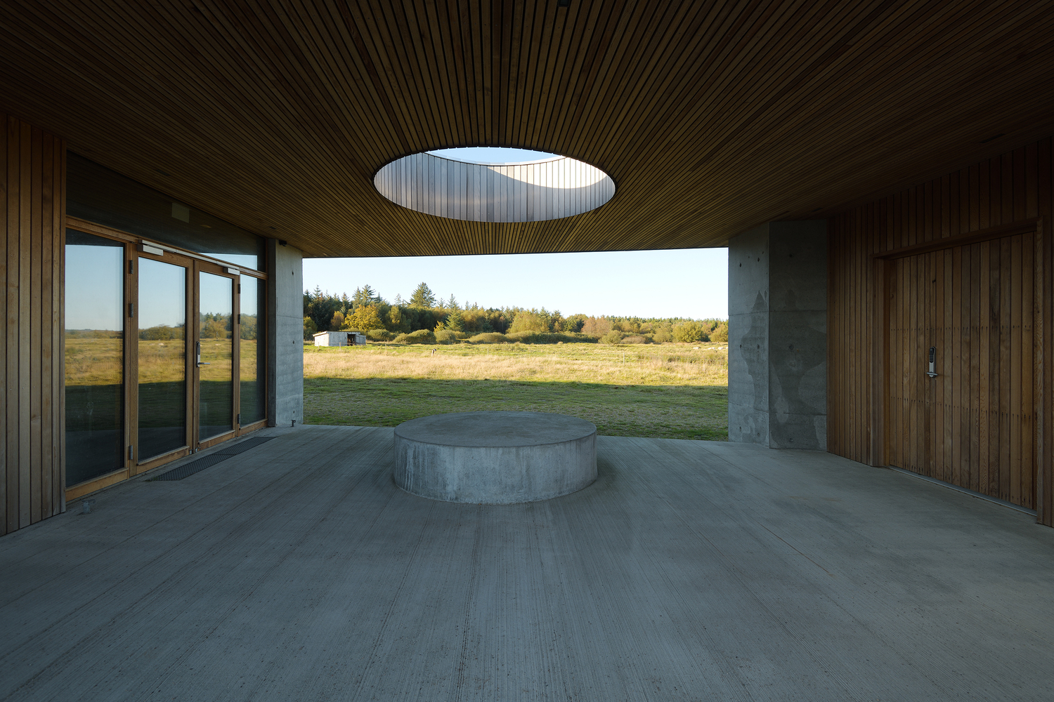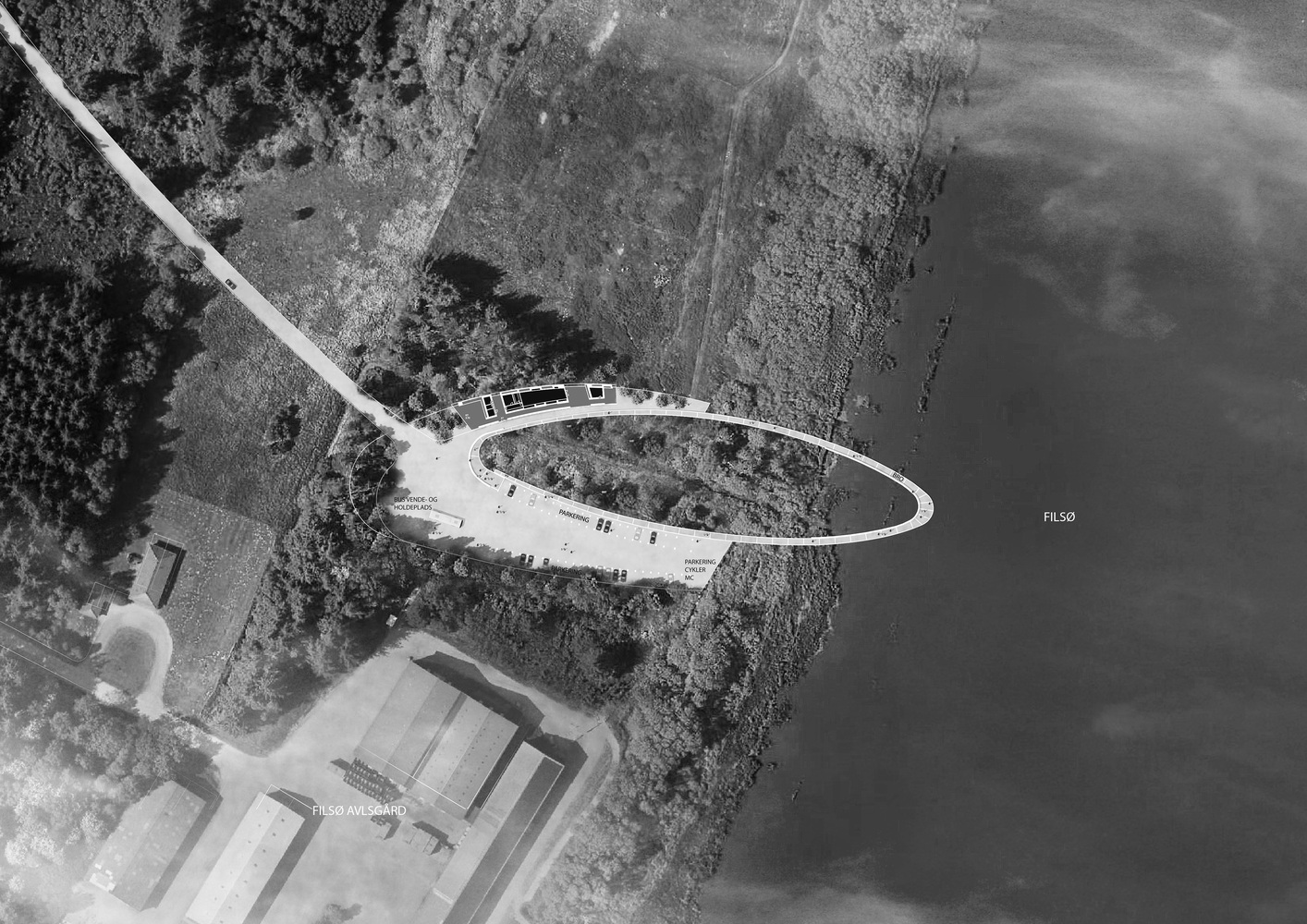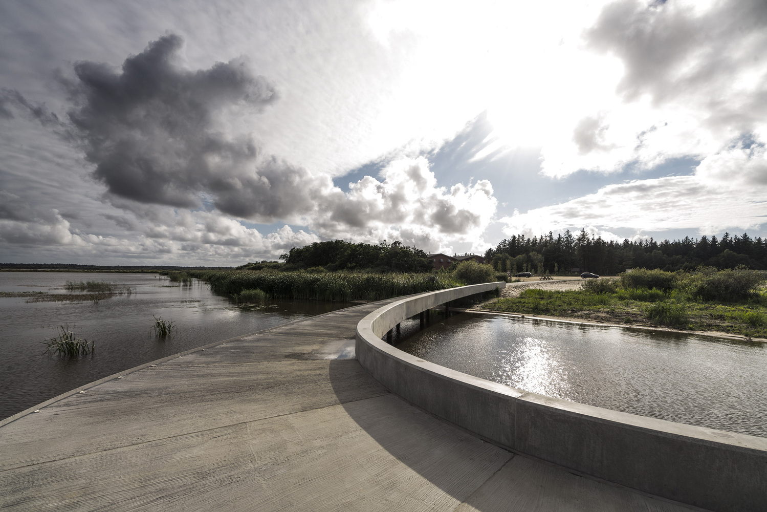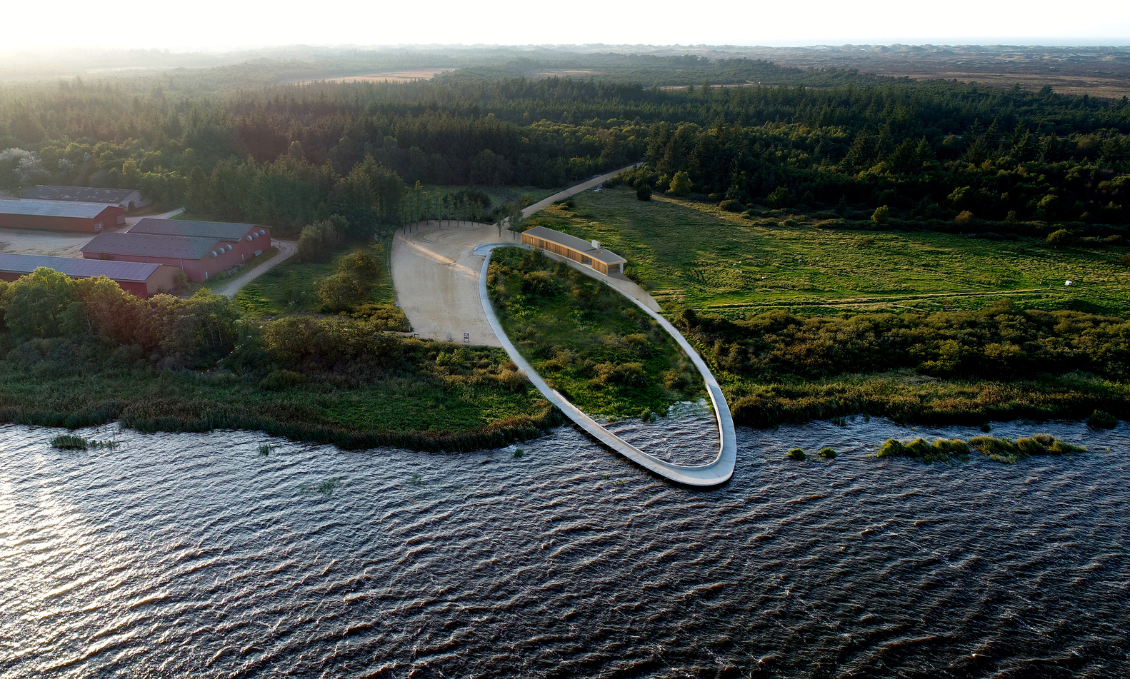 The visitor’s center consists of an access road, educational facilities, a landscape bridge, and a parking lot for visitors. The access road winds its way through a spectacular and protected landscape towards the parking lot and the large ellipse-shaped bridge, which in a single gesture anchors the building and unfolds the large horizon, created by the reflection in the water. From the bridge, it is possible to experience Filsø and the vast and spacious landscape. In a single, panning movement, visitors can get very close to the water's surface and the unique nature of the area. The ellipse shape accentuates the continuous movement through the area from arrival to departure. The bridge is designed with a solid seating edge, which offers visitors the possibility to take a break, sit down and enjoy the view. The school building, which functions as an anchor for the ellipse and counterpoint to the lake, follows the curved structure of the visitor’s center and thus becomes a natural part of the unity –and the movement in the landscape. The vertical shutters of the building mirror the nearby forest.
