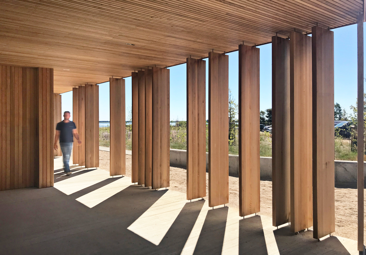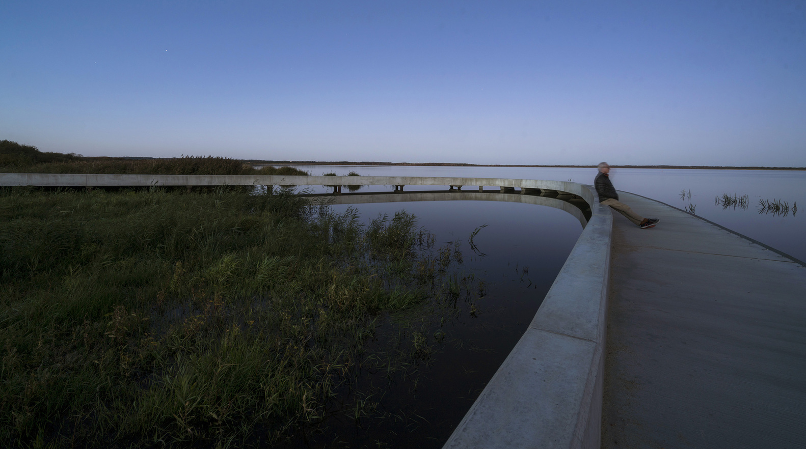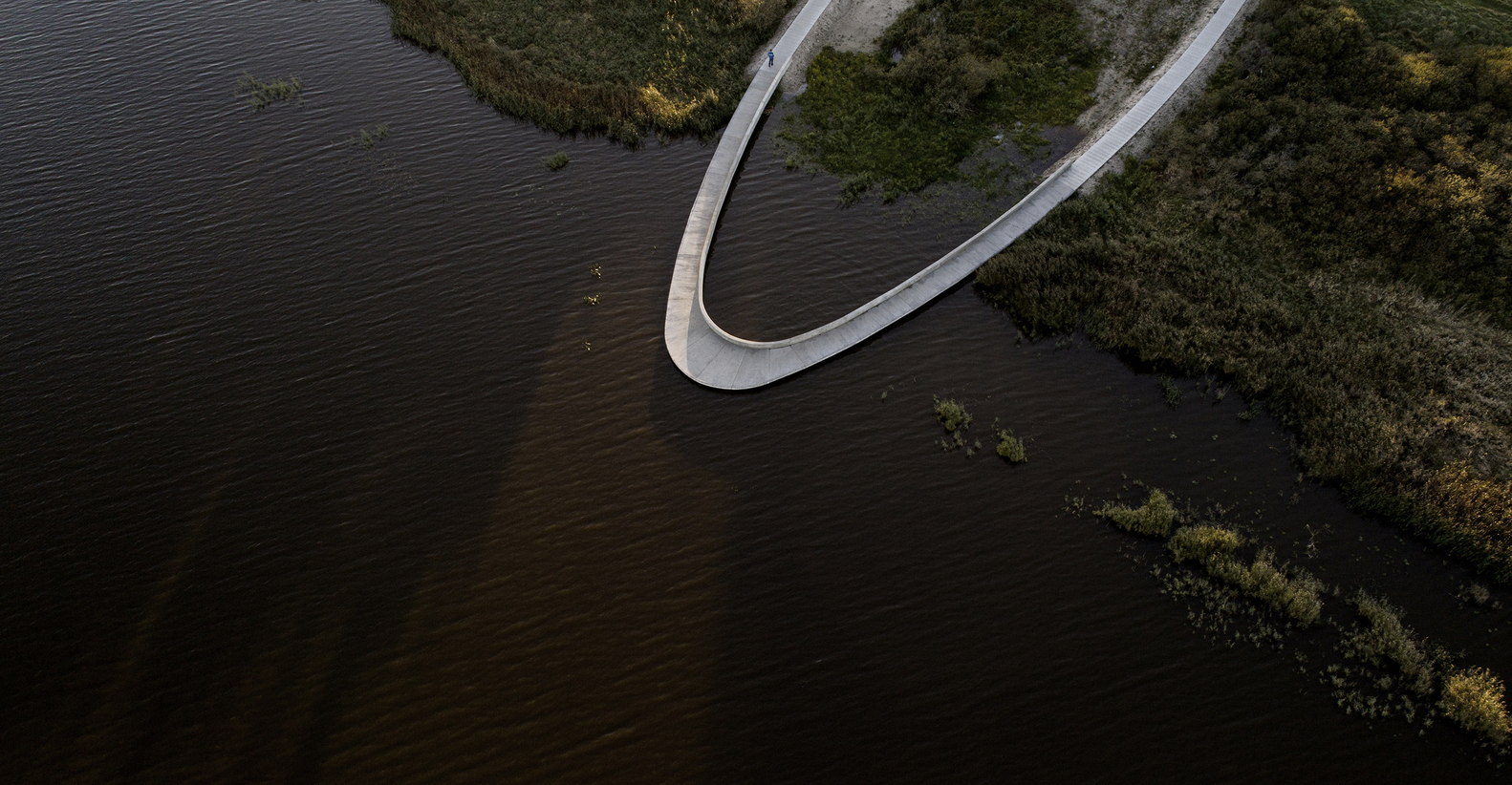 The visitor’s center consists of an access road, educational facilities, a landscape bridge, and a parking lot for visitors. The access road winds its way through a spectacular and protected landscape towards the parking lot and the large ellipse-shaped bridge, which in a single gesture anchors the building and unfolds the large horizon, created by the reflection in the water. From the bridge, it is possible to experience Filsø and the vast and spacious landscape. In a single, panning movement, visitors can get very close to the water's surface and the unique nature of the area. The ellipse shape accentuates the continuous movement through the area from arrival to departure. The bridge is designed with a solid seating edge, which offers visitors the possibility to take a break, sit down and enjoy the view. The school building, which functions as an anchor for the ellipse and counterpoint to the lake, follows the curved structure of the visitor’s center and thus becomes a natural part of the unity –and the movement in the landscape. The vertical shutters of the building mirror the nearby forest.