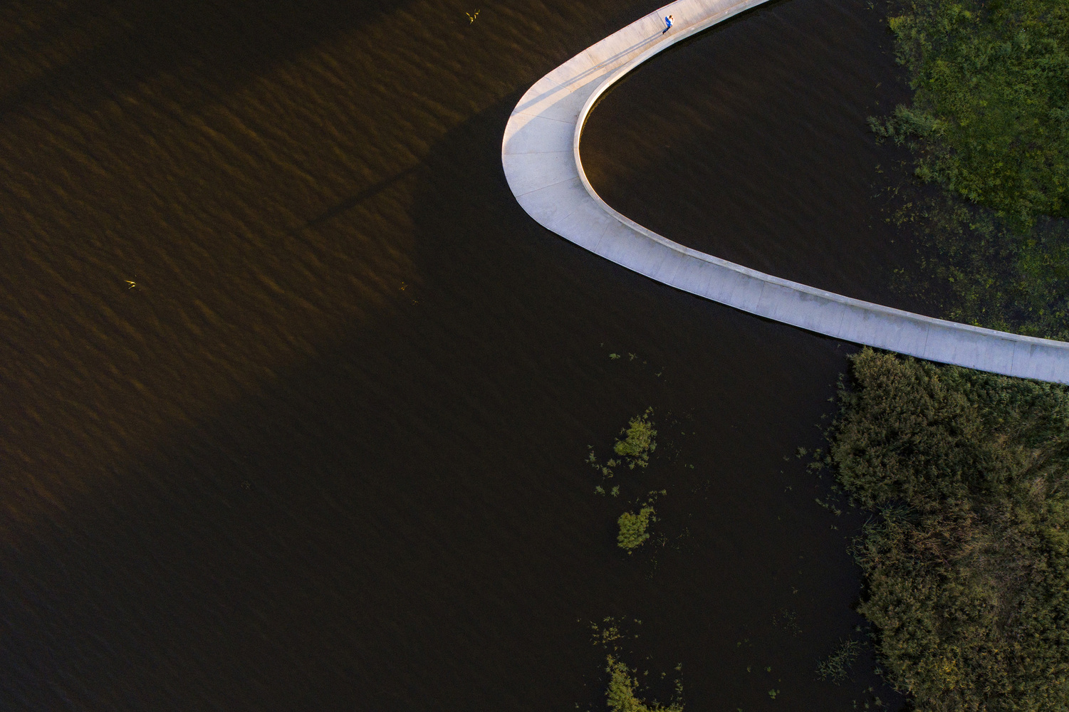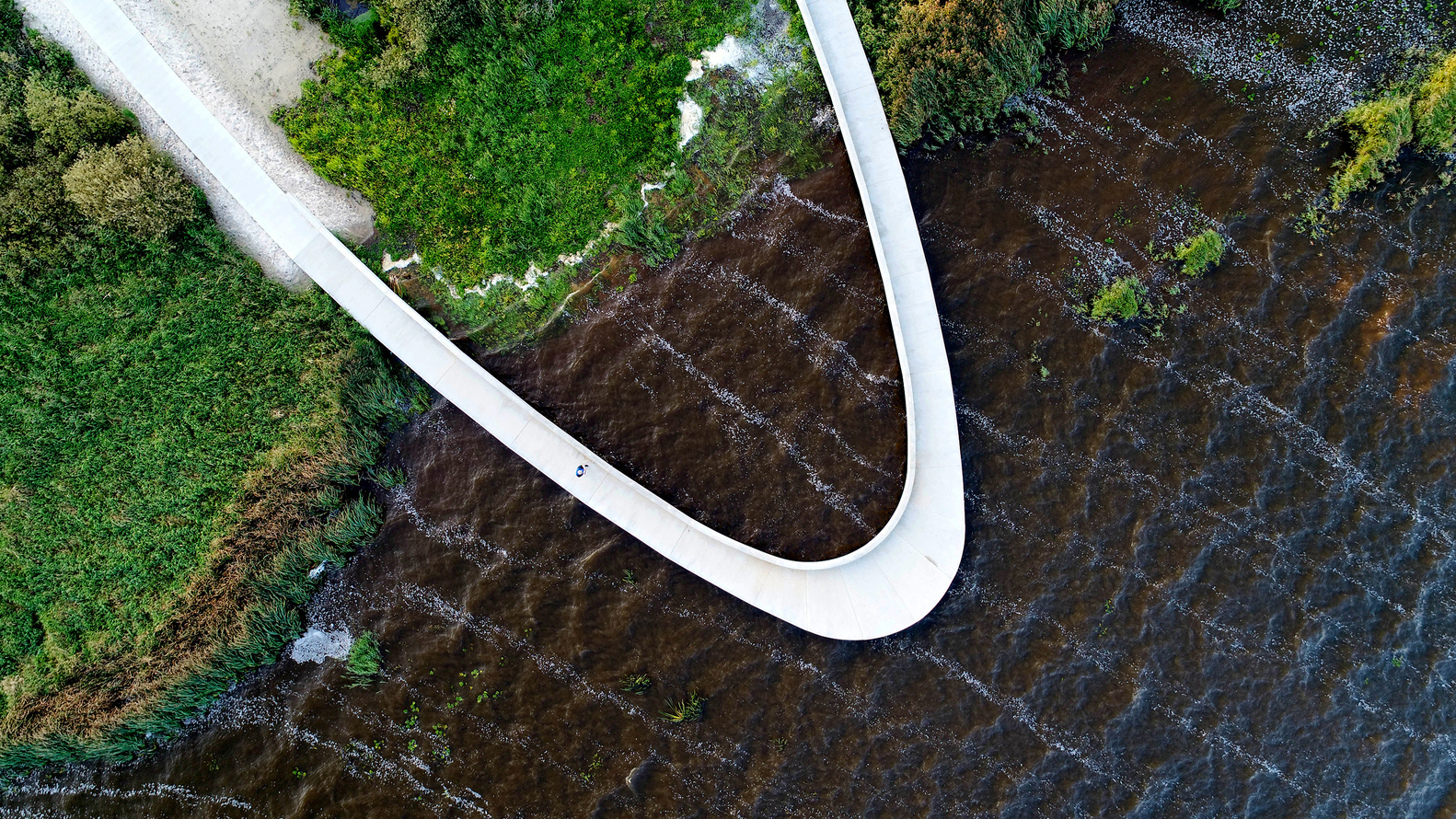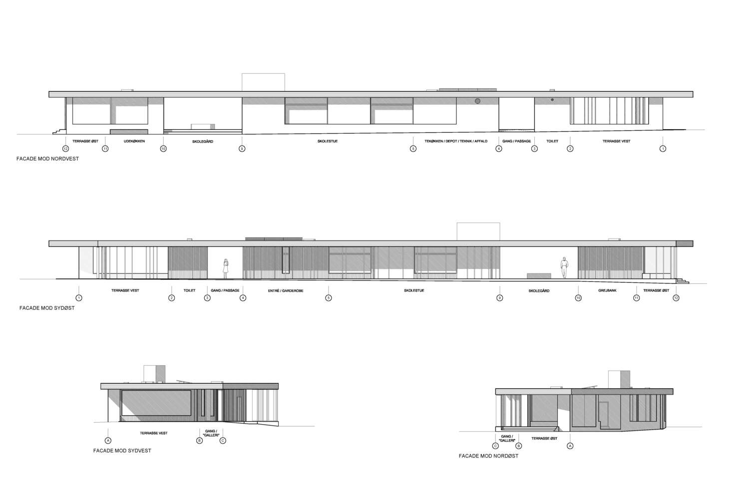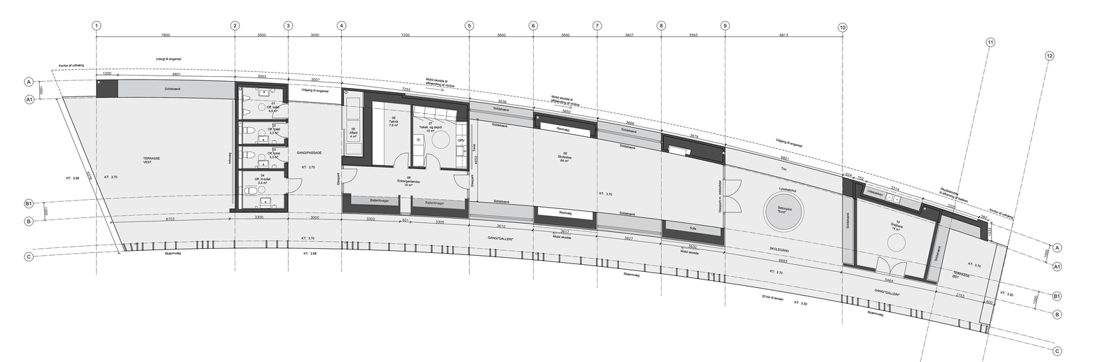The visitor’s center consists of an access road, educational facilities, a landscape bridge, and a parking lot for visitors. The access road winds its way through a spectacular and protected landscape towards the parking lot and the large ellipse-shaped bridge, which in a single gesture anchors the building and unfolds the large horizon, created by the reflection in the water. From the bridge, it is possible to experience Filsø and the vast and spacious landscape. In a single, panning movement, visitors can get very close to the water's surface and the unique nature of the area. The ellipse shape accentuates the continuous movement through the area from arrival to departure. The bridge is designed with a solid seating edge, which offers visitors the possibility to take a break, sit down and enjoy the view. The school building, which functions as an anchor for the ellipse and counterpoint to the lake, follows the curved structure of the visitor’s center and thus becomes a natural part of the unity –and the movement in the landscape. The vertical shutters of the building mirror the nearby forest.
