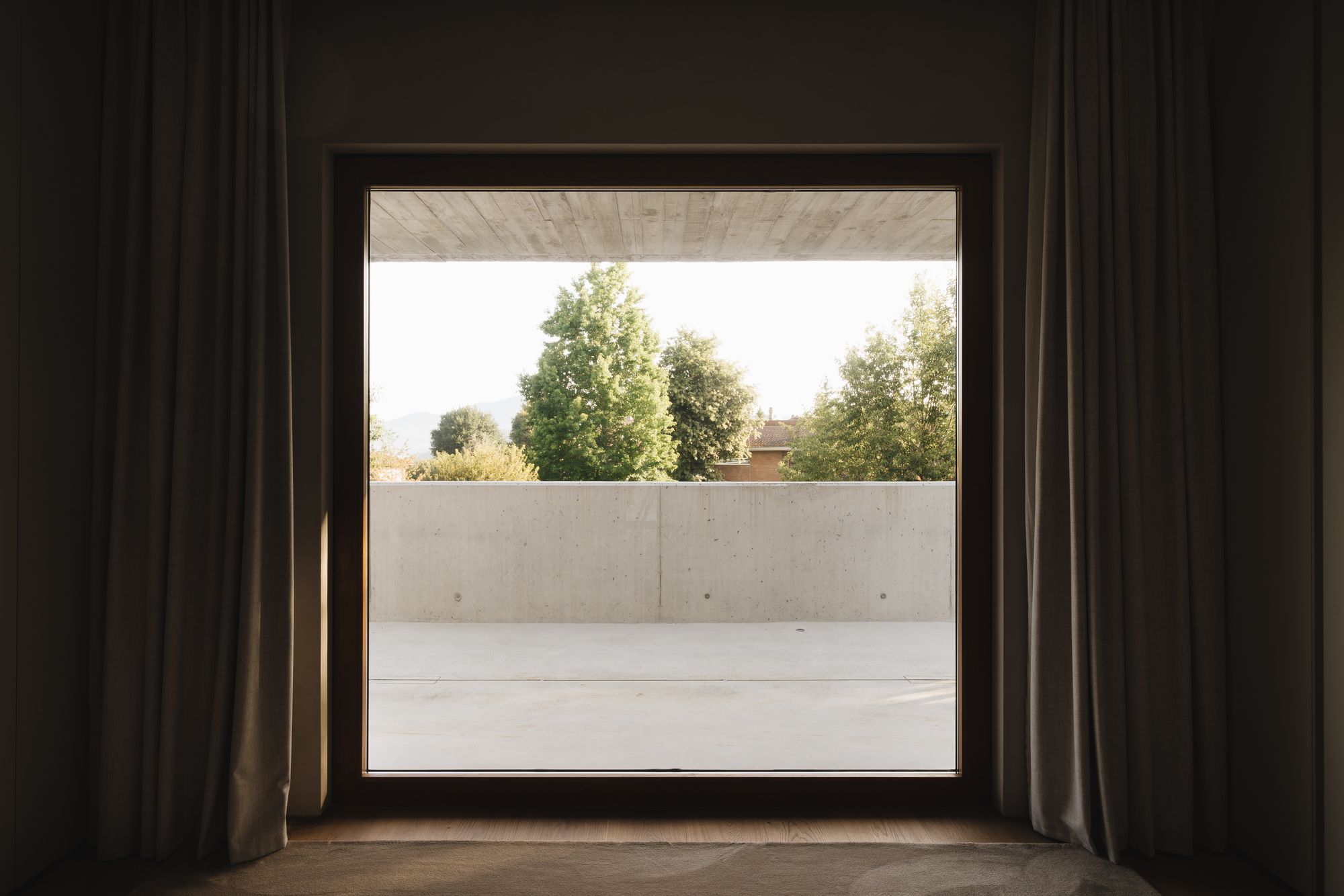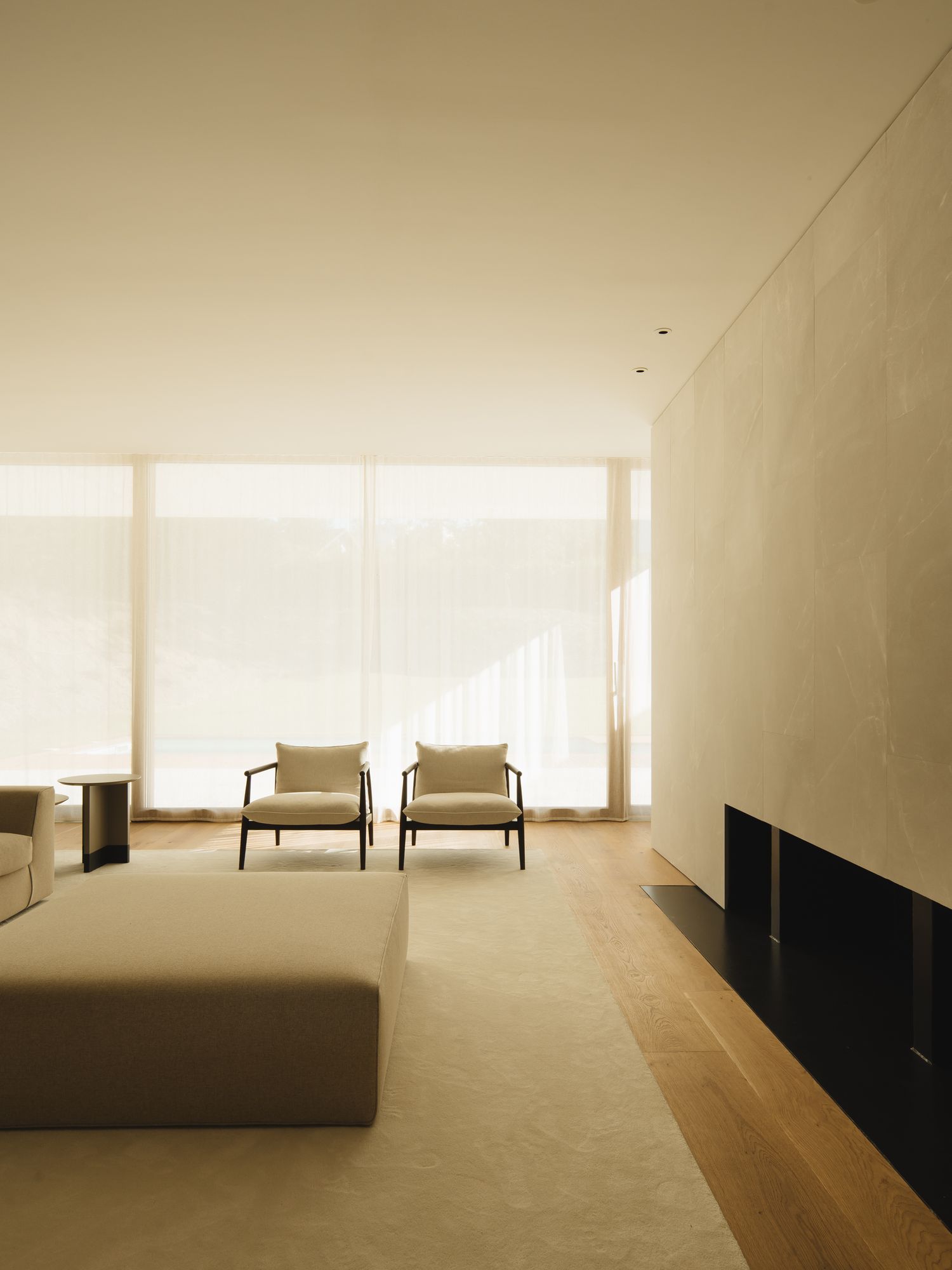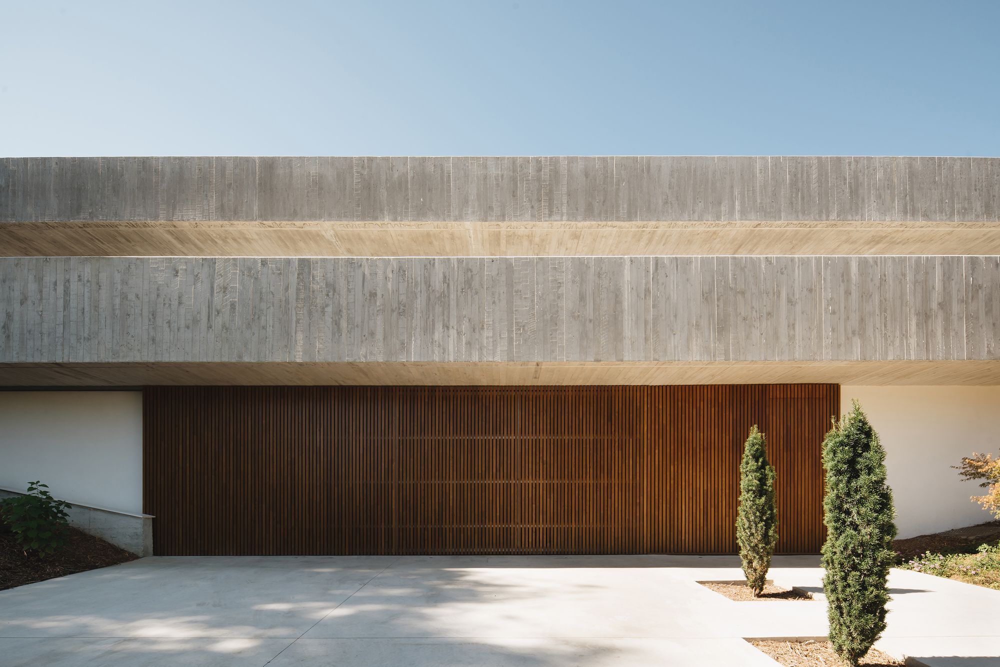 Predominantly, the use of concrete is smartly juxtaposed with wooden textures, evident in the finishes on the cantilevers and the facade cladding. This design decision harmonizes the concrete with wooden elements found throughout the home, such as the north facing garage door and the south facade’s chestnut wood slats. In other areas, white lime mortar finishes are employed, ensuring these portions recede visually. Inside, the home champions natural elements. Beige clay plaster and oak wood dominate, while grayish limestone envelopes the central fireplace, demarcating living spaces.