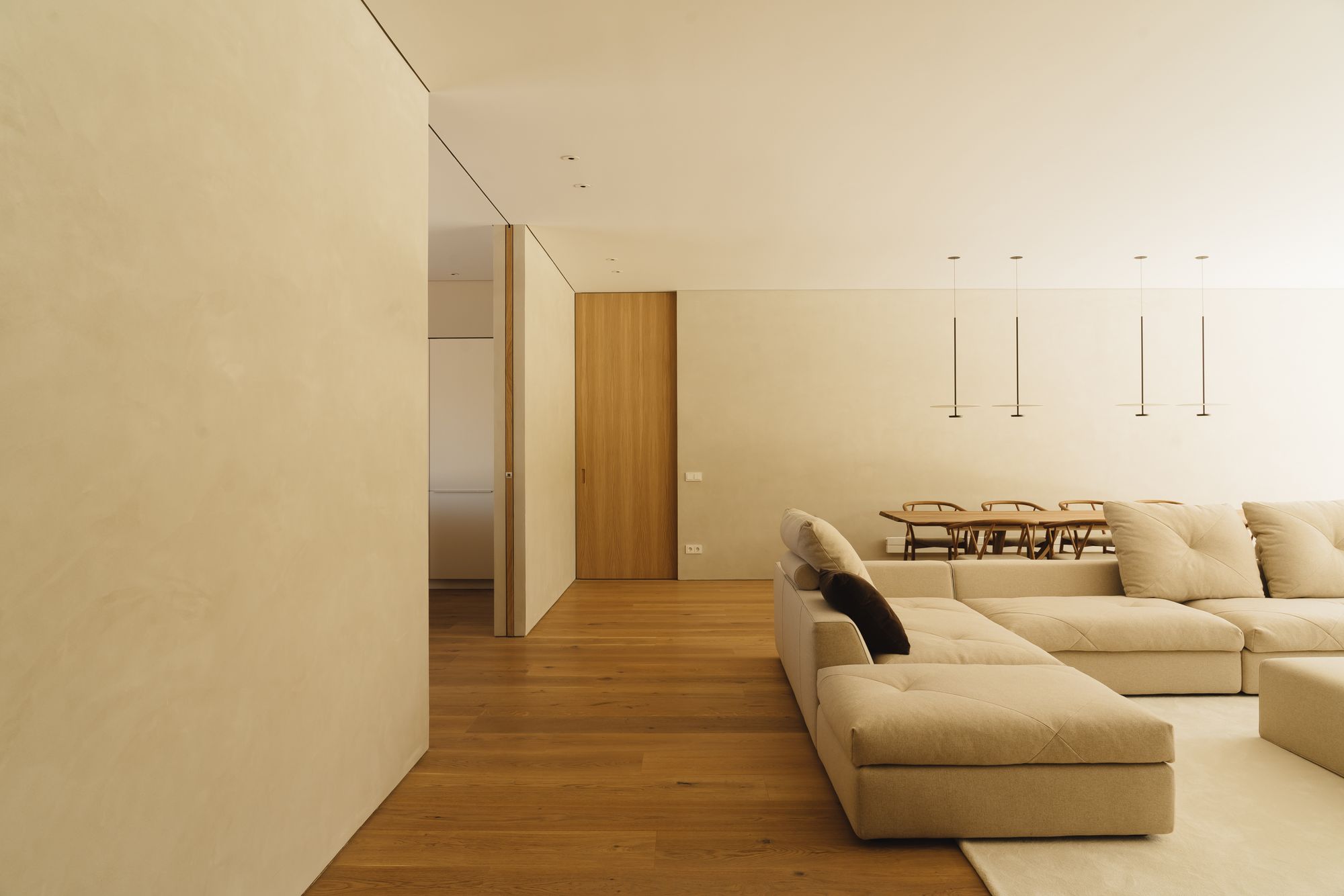 Central to the home is the kitchen and living-dining expanse, oriented along the north south axis. A notable feature here is a vast wooden sliding door in the kitchen, bridging the northern terrace and southern porch both visually and functionally. The eastern segment of the house hosts the master bedroom, designed with a dual-aspect view. Conversely, the west wing is reserved for additional bedrooms, each complete with an ensuite. A conscious selection of materials elevates the Casa Hara, ensuring it resonates with its surroundings.
