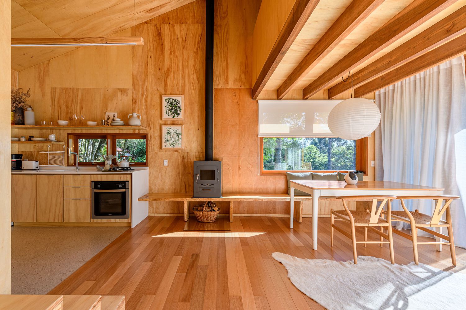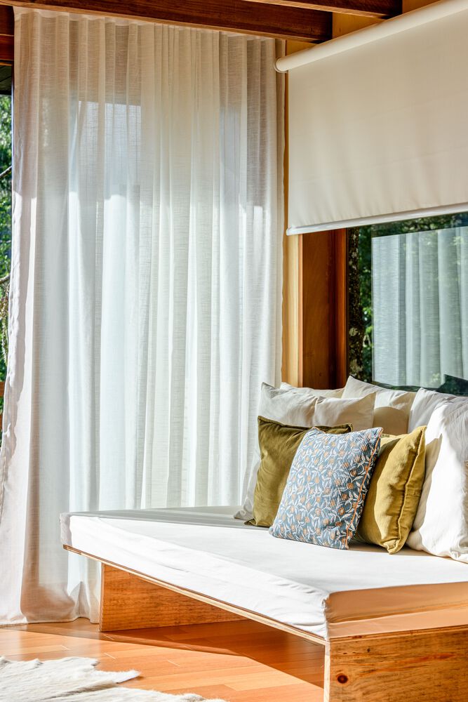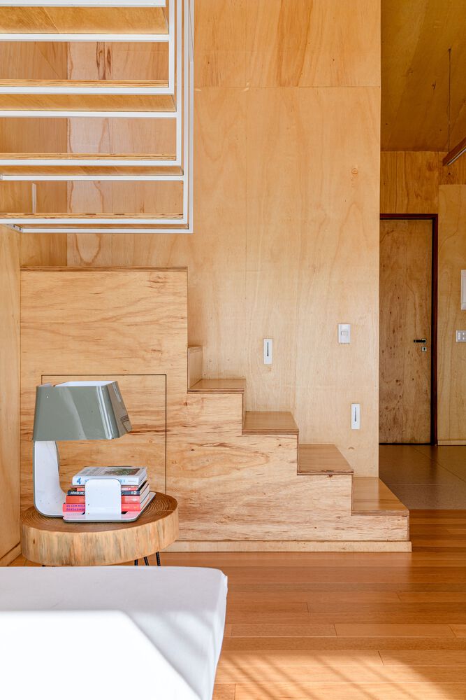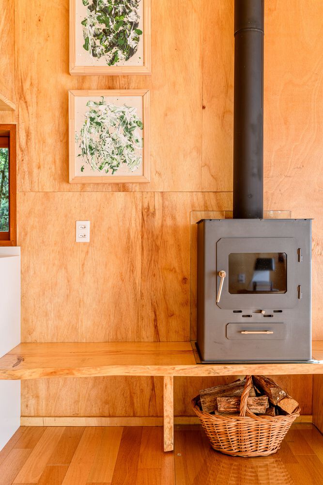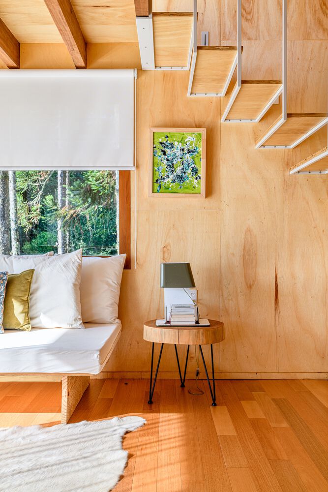 The entire external part of the house is covered with cider eucalyptus wood painted with a black stain, which despite being heavier, is a color that makes the house very integrated with nature, contrasting with the internal part of the house. house, which is very light, and soft. The internal lining material is marine plywood, a pine that recalls minimalist Scandinavian architecture. An environment built with little diversity of materials. The contrast of the dark outside and the light inside is a very pleasant surprise for guests.