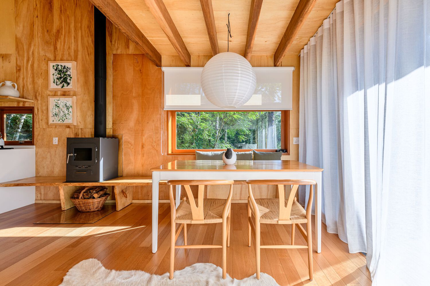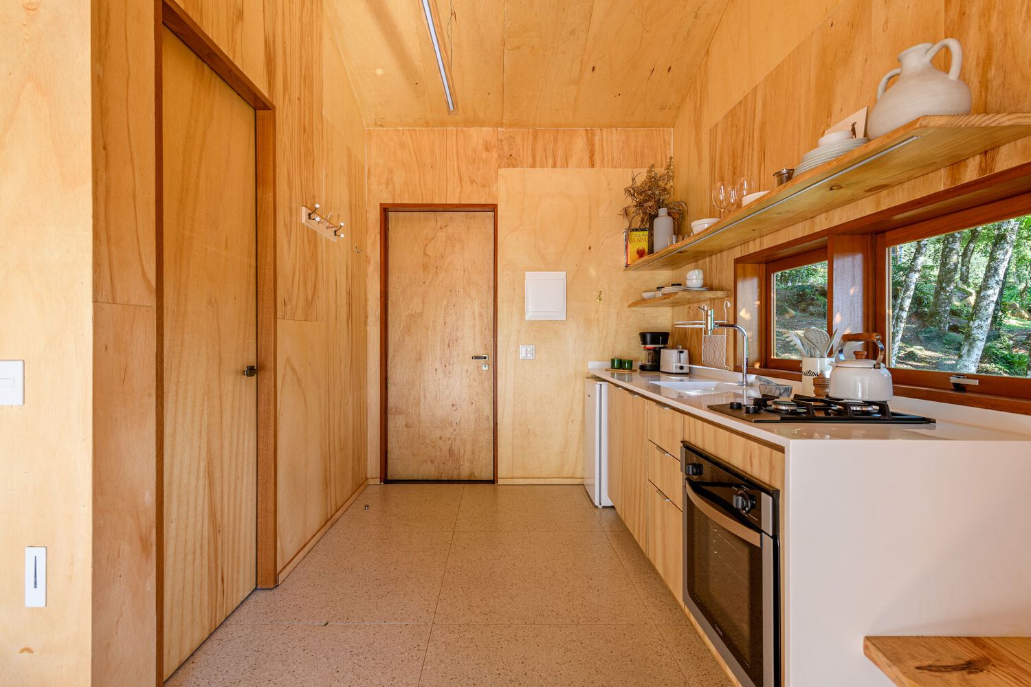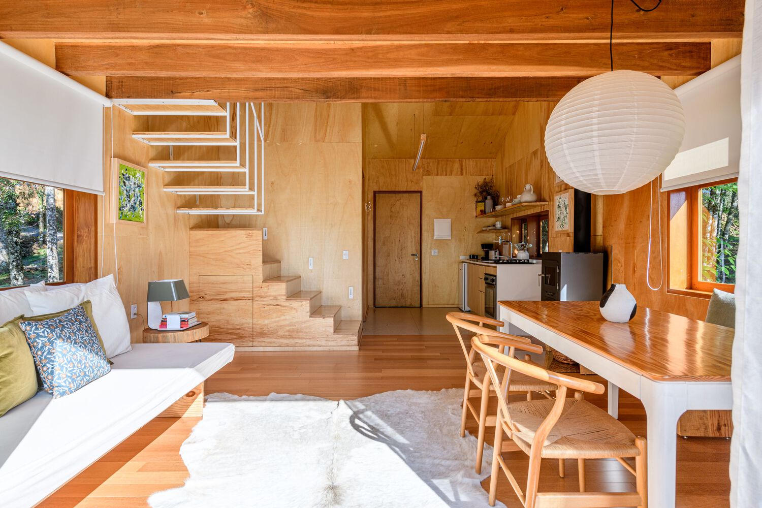 The entire external part of the house is covered with cider eucalyptus wood painted with a black stain, which despite being heavier, is a color that makes the house very integrated with nature, contrasting with the internal part of the house. house, which is very light, and soft. The internal lining material is marine plywood, a pine that recalls minimalist Scandinavian architecture. An environment built with little diversity of materials. The contrast of the dark outside and the light inside is a very pleasant surprise for guests.