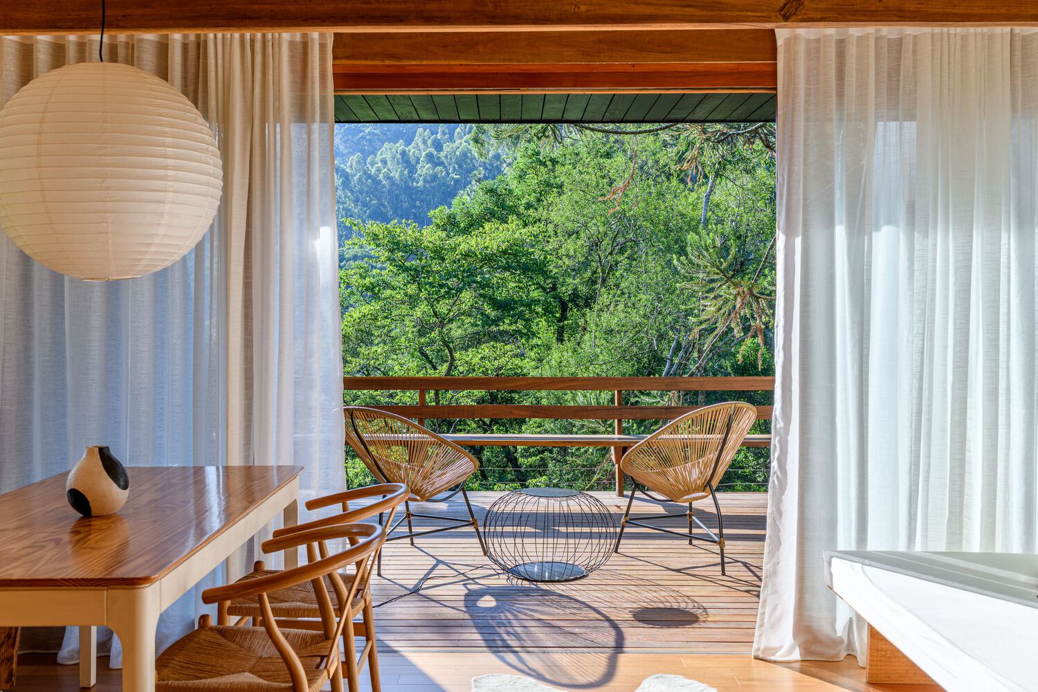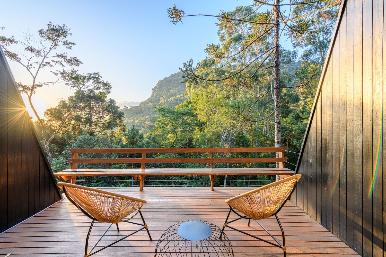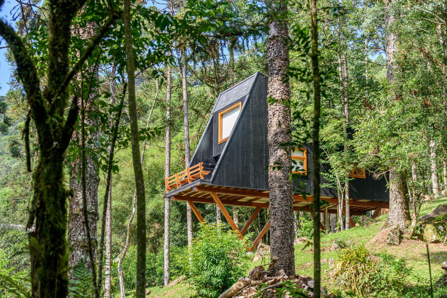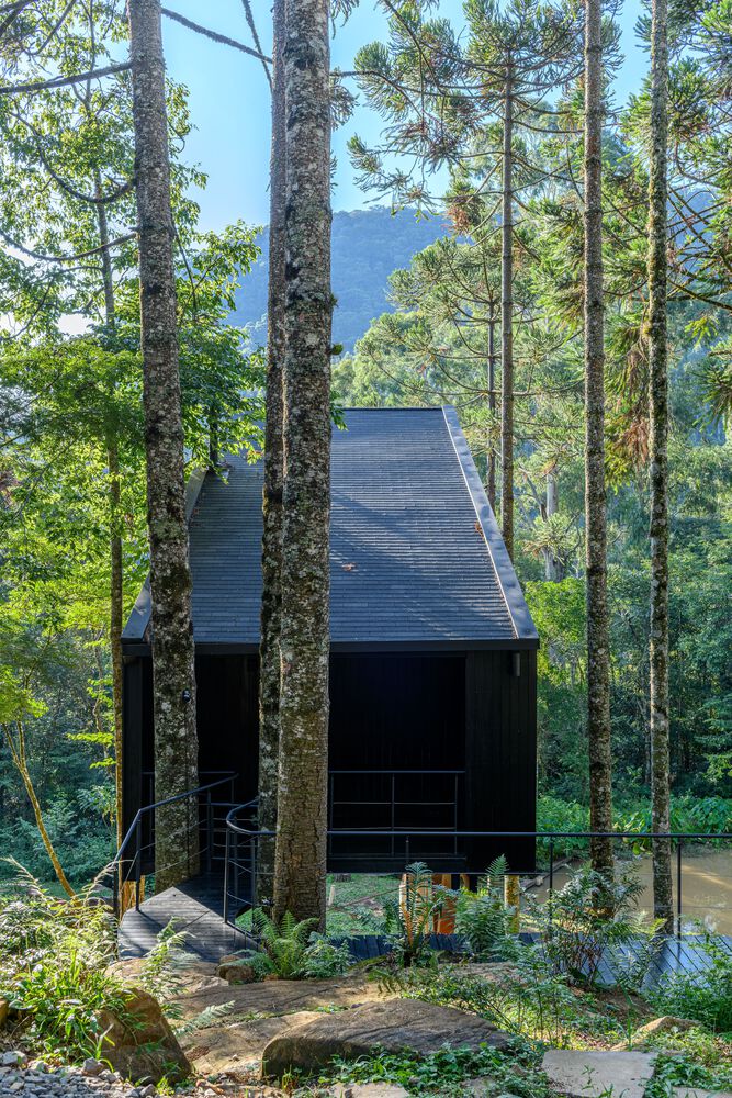 Built in 2022, we call it Tree House because it is fully integrated with the imposing Araucaria trees typical of the Rio Grande do Sul mountains. The feeling is of floating inside the forest.