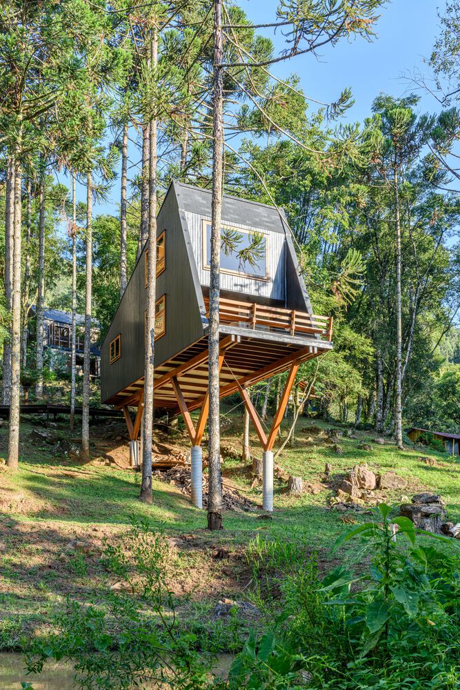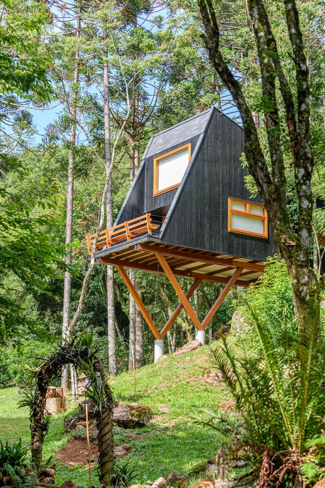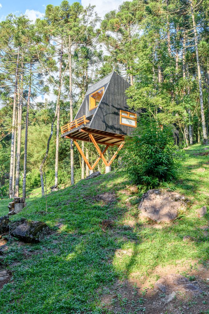 Tree House, with an area of 50m2 that floats among the trees, is one of the three houses in the @NaCarapina accommodation complex, located in São Francisco de Paula, in the Campos de Clima Serra region, in the state of Rio Grande. do Sul. The region is mainly made up of fields, but NaCarapina is located on a mountain slope where the field meets the Atlantic Forest. The location was chosen by the owner for its diversity, richness in different species, and because it is a region very rich in water.
