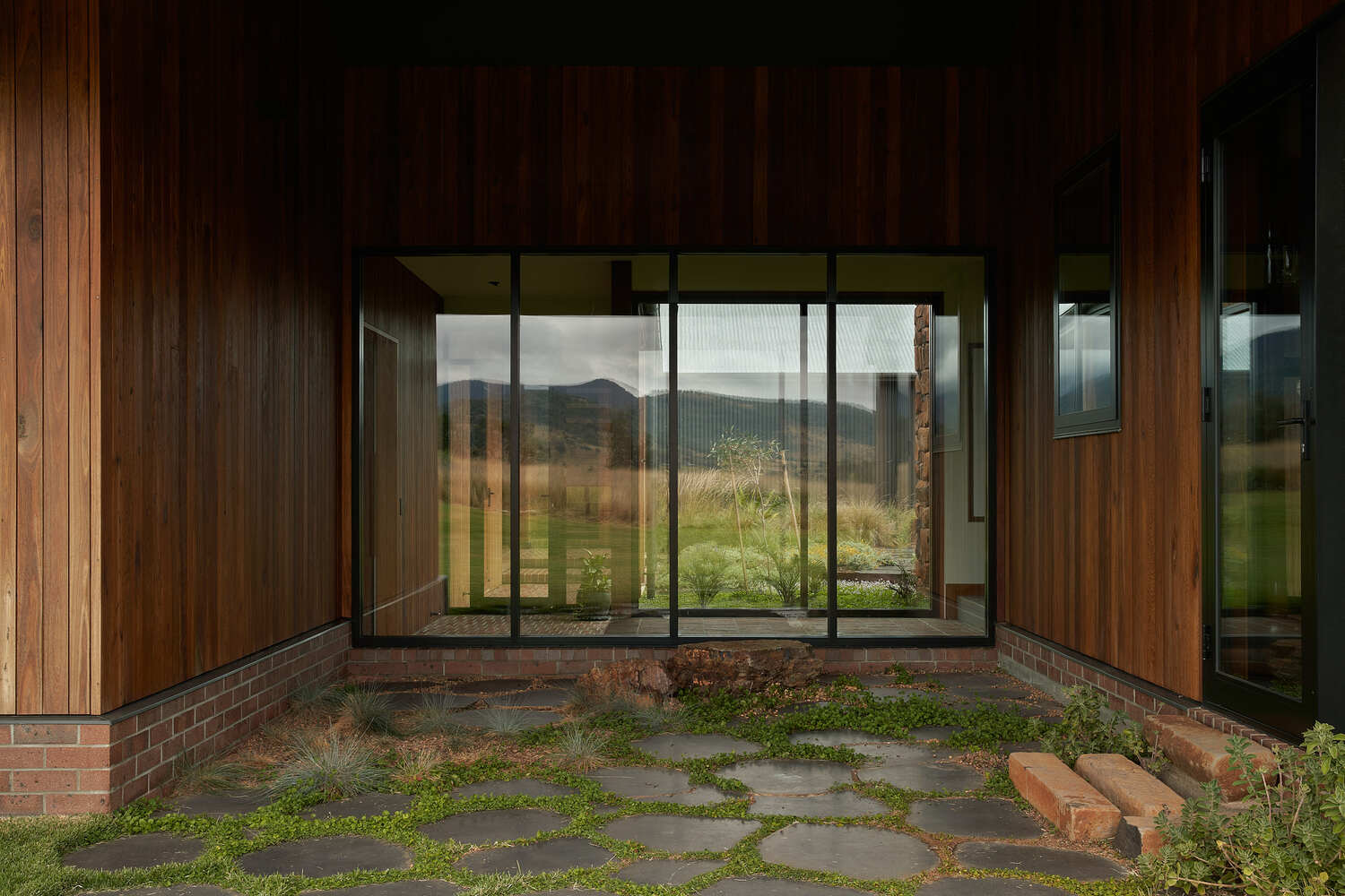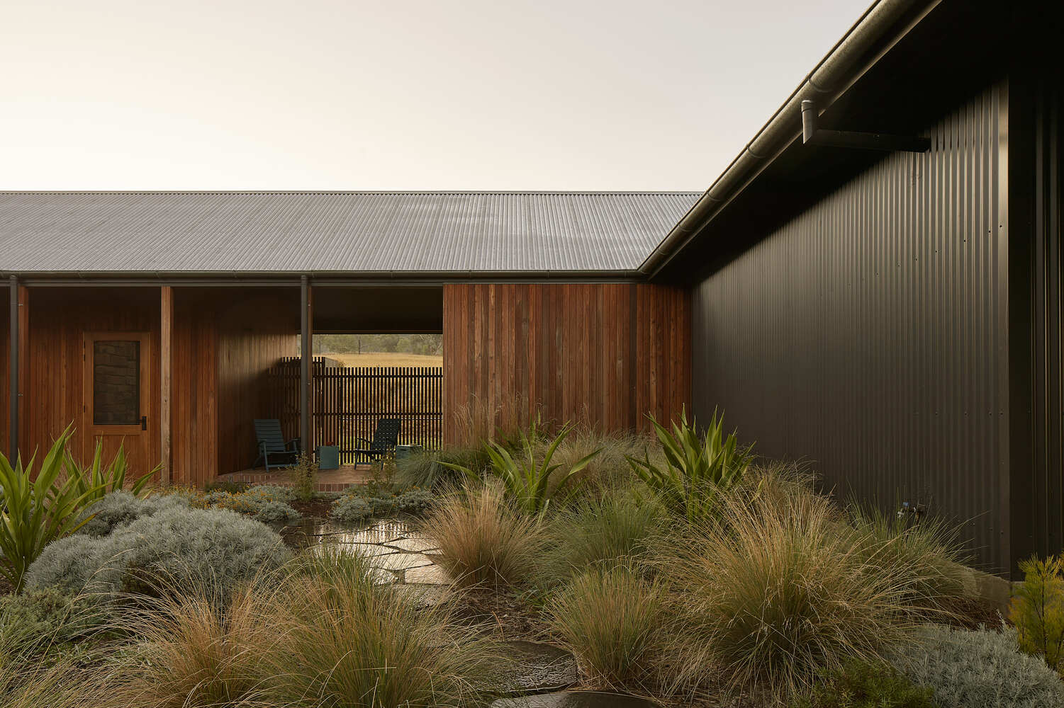This part of Australia is prone to drought, and it was during drought that we first visited the site, which was dry and dusty, with only a few yellow plants clinging to life. This meant that the design of the house was focused not only on regenerating the land and creating a garden but also on resisting drought conditions in the future. The creation of an almost totally enclosed courtyard garden in the center of the house was one way of dealing with this. At the front of the properties, two sheds connected by a roof also connect to the house on either side, forming a square around this central courtyard.