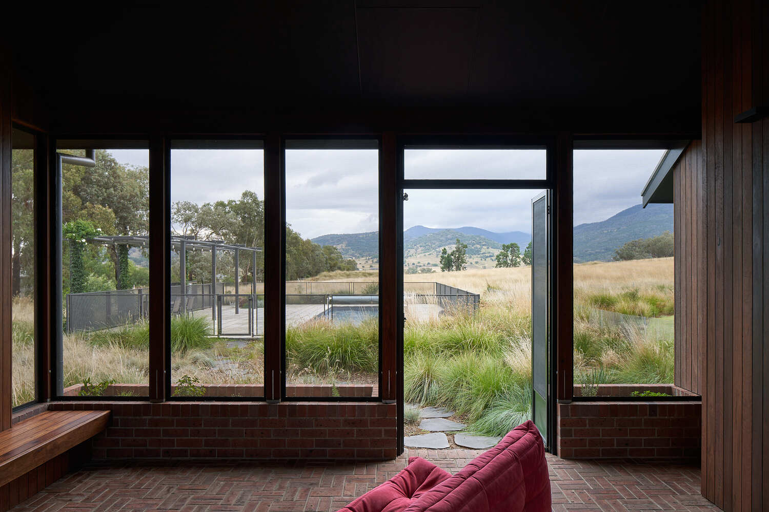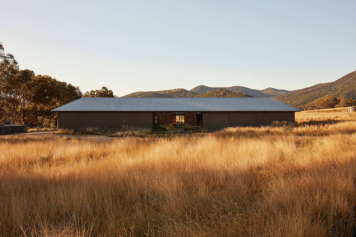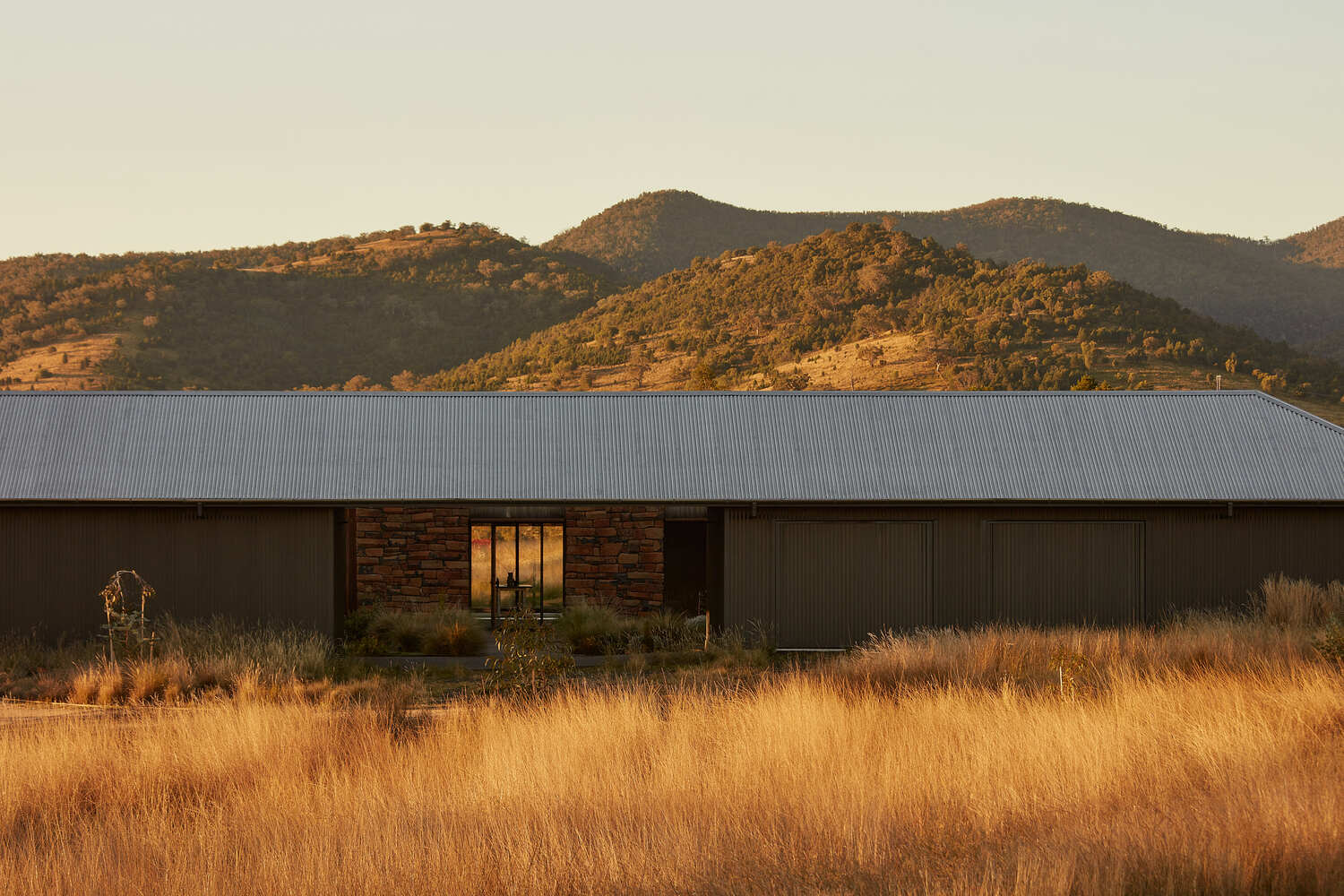 The aesthetics and materials of the house are designed with an agricultural aesthetic, eschewing the brick and tile of the ubiquitous suburban typology, with a metal roof and walls made of metal, timber, and stone. The materials were also chosen to be recessive including a dull silver roof, black sheets, and ironbark timber. Inside, rooms that are considered “interior” are finished in painted plasterboard, plus timber in the kitchen and tiles in the bathroom, while “outdoor” spaces are finished in brick, timber, and stone.
