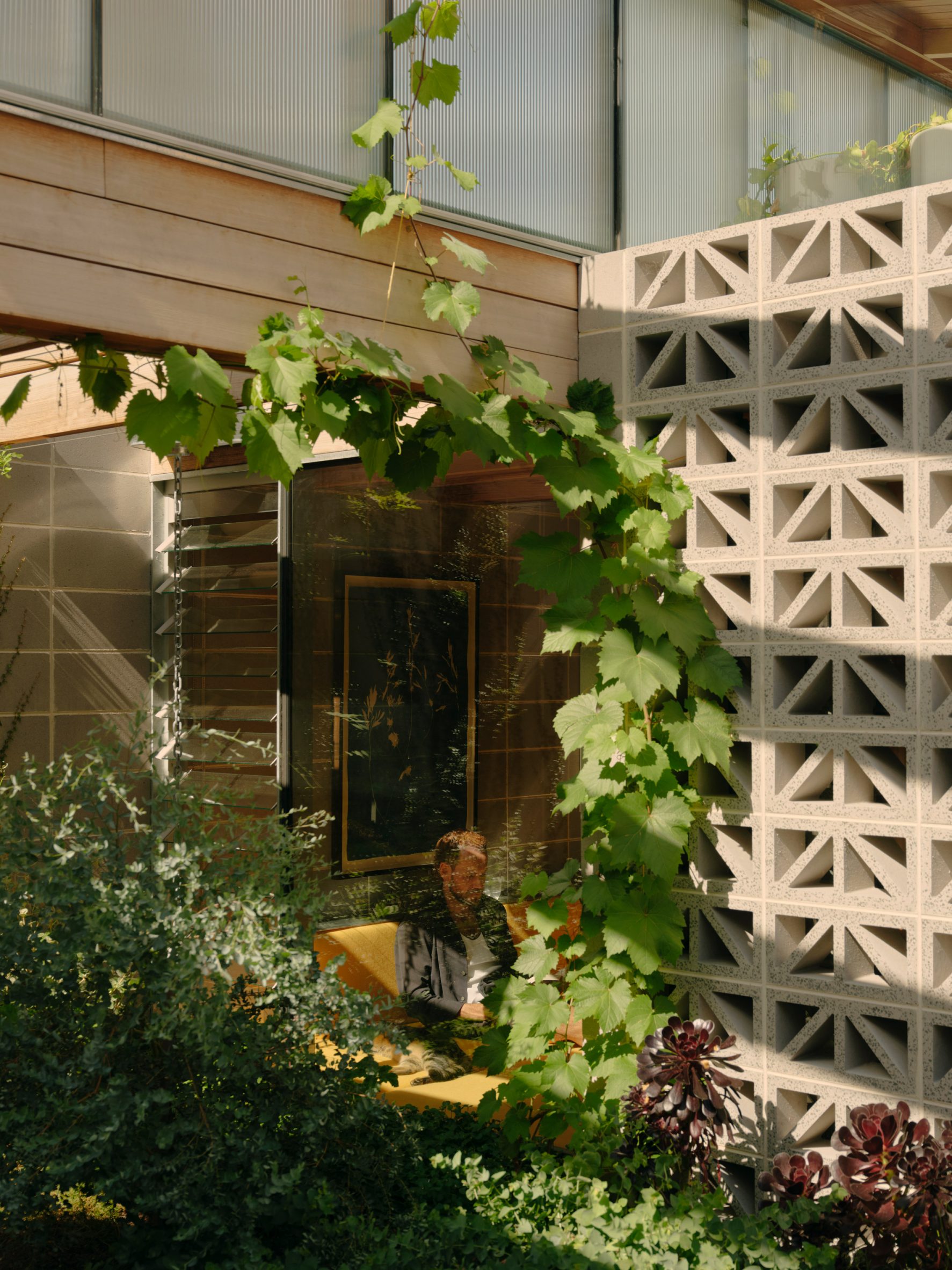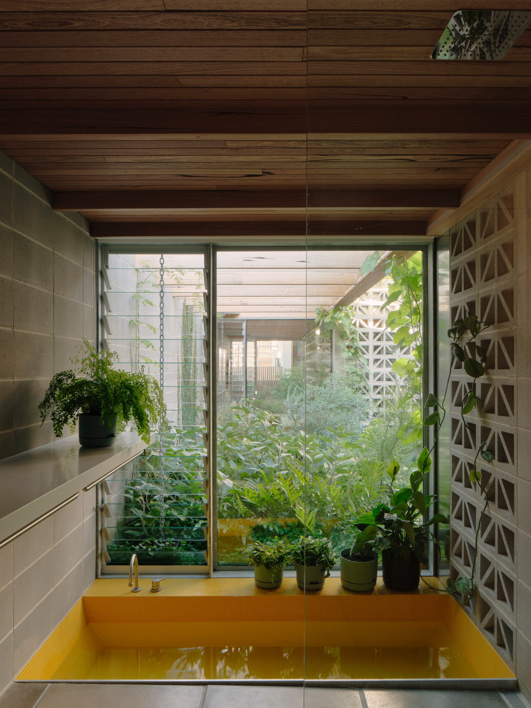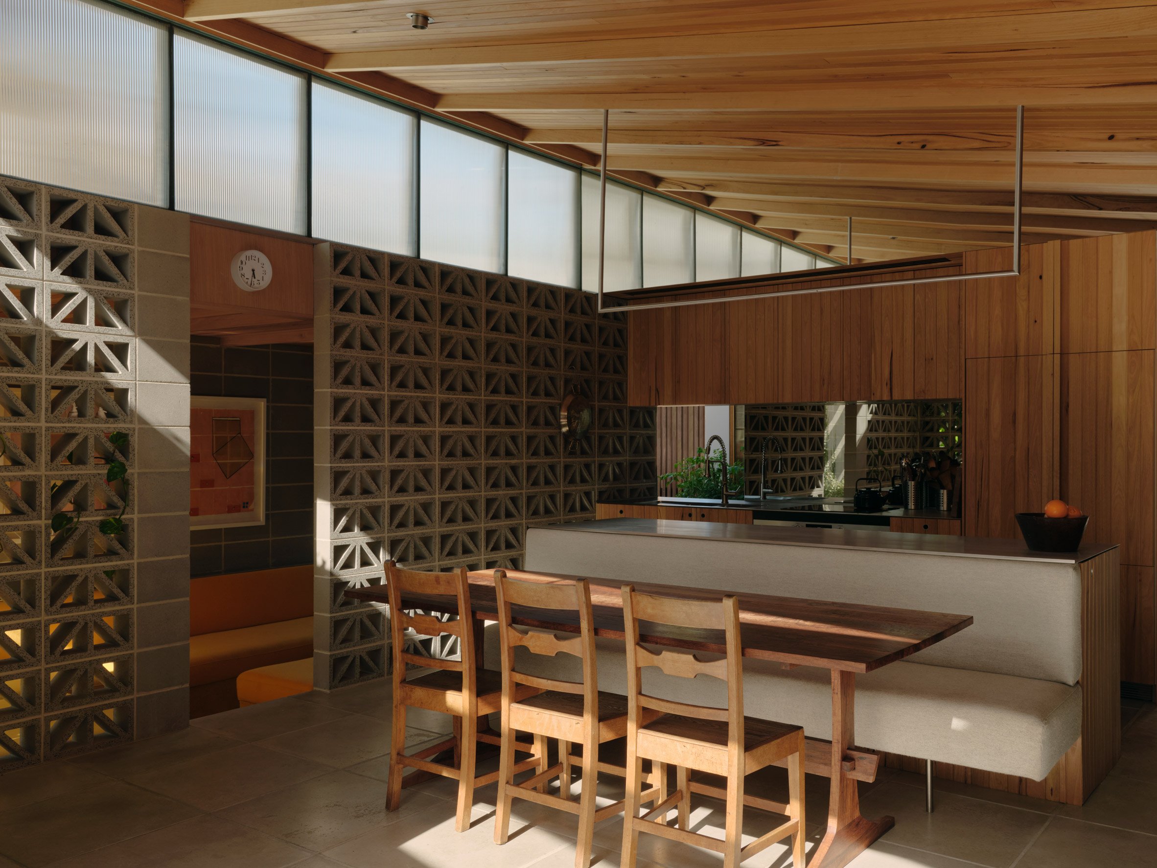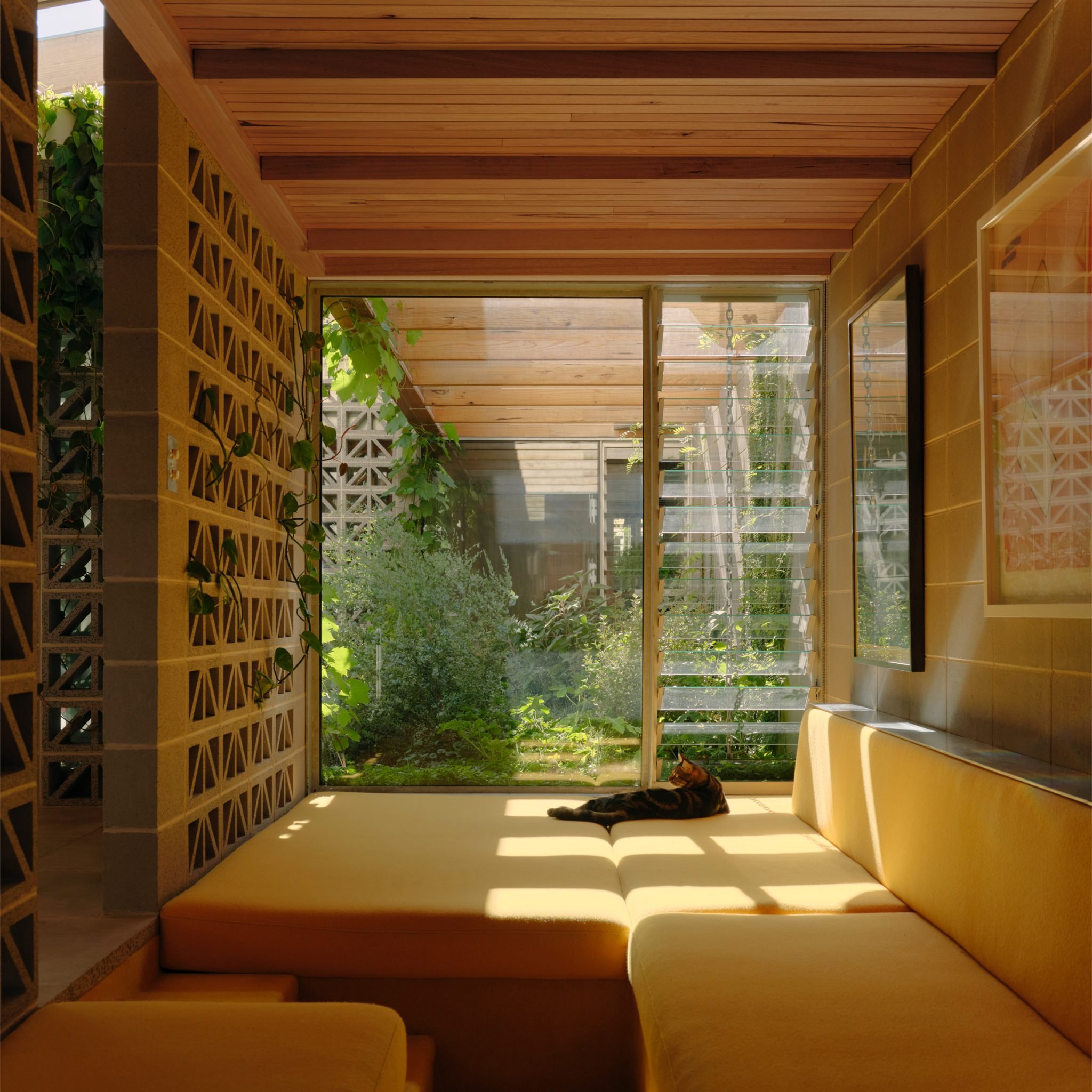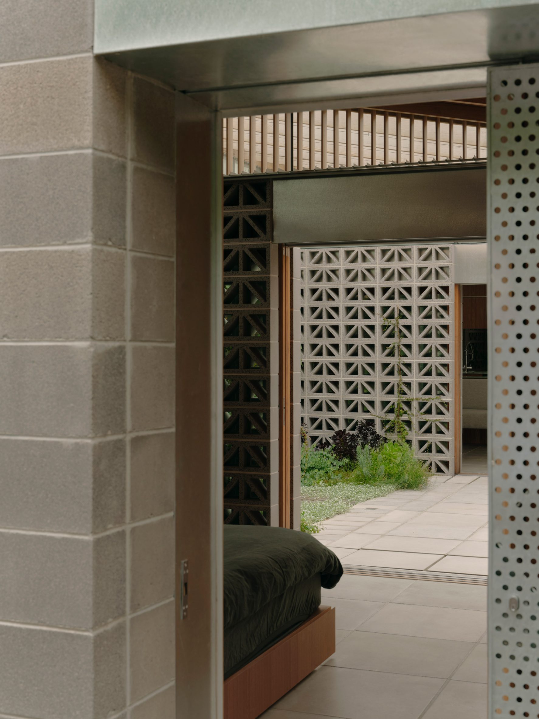 Walls of breeze blocks punctured by small triangular openings and sliding wooden doors separate each of these areas, allowing for views, sunlight and air to easily pass between rooms and a central courtyard and garden.