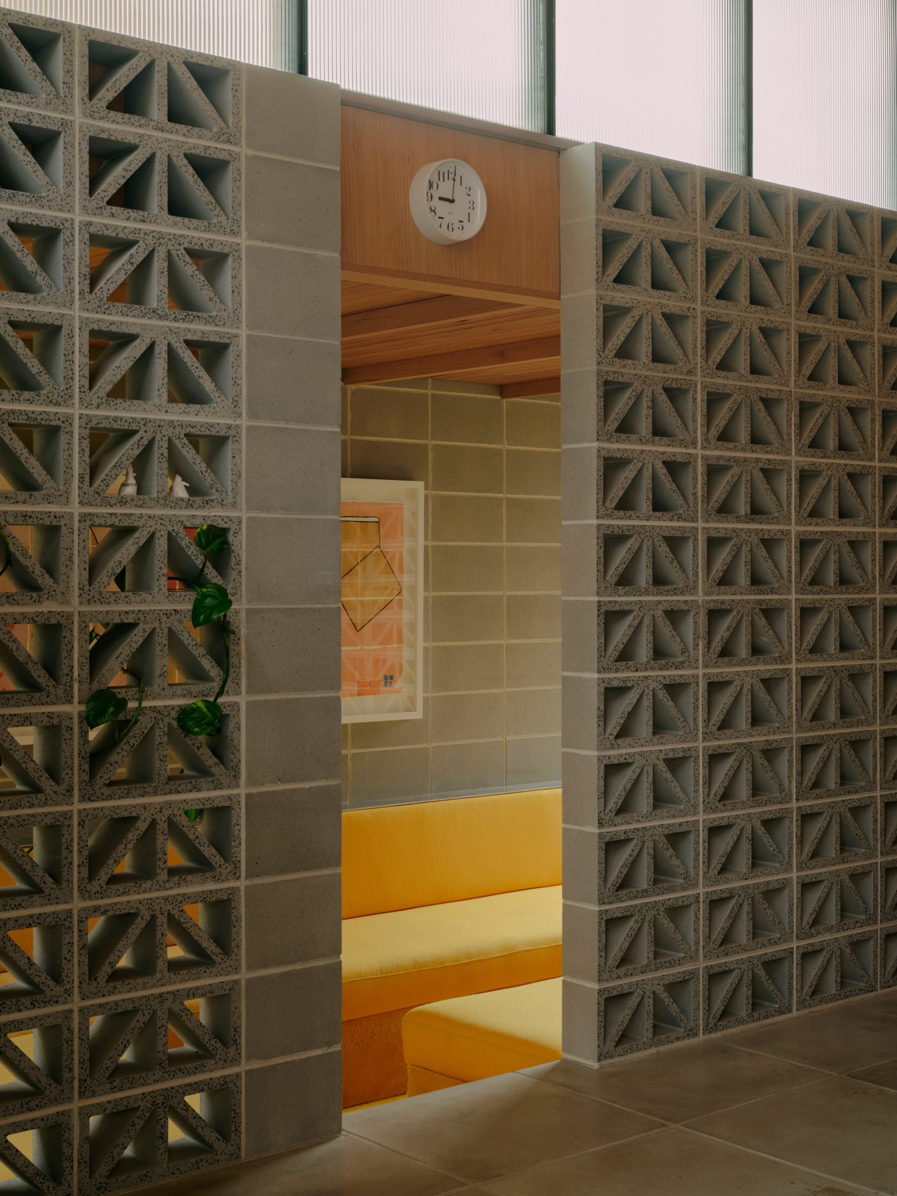 아키텍쳐 아키텍쳐는 브리즈 블럭을 이용하여 호주 멜버른에 위치한 전형적인 전원주택을 내외부가 연속된 거주공간으로 리노베이션 하였다. 기존 건물의 정면과 베란다는 그대로 유지하며, 다양한 구성을 통하여 각기 다른 공간감을 느낄 수 있도록 제안하였다. 작은 삼각형 구멍이 뚫린 브리즈블럭은 목재와 함께 내부공간을 구분하는 파티션 역활과 채광과 환기를 연속시키는 연결자 역활을 함께 수행한다.