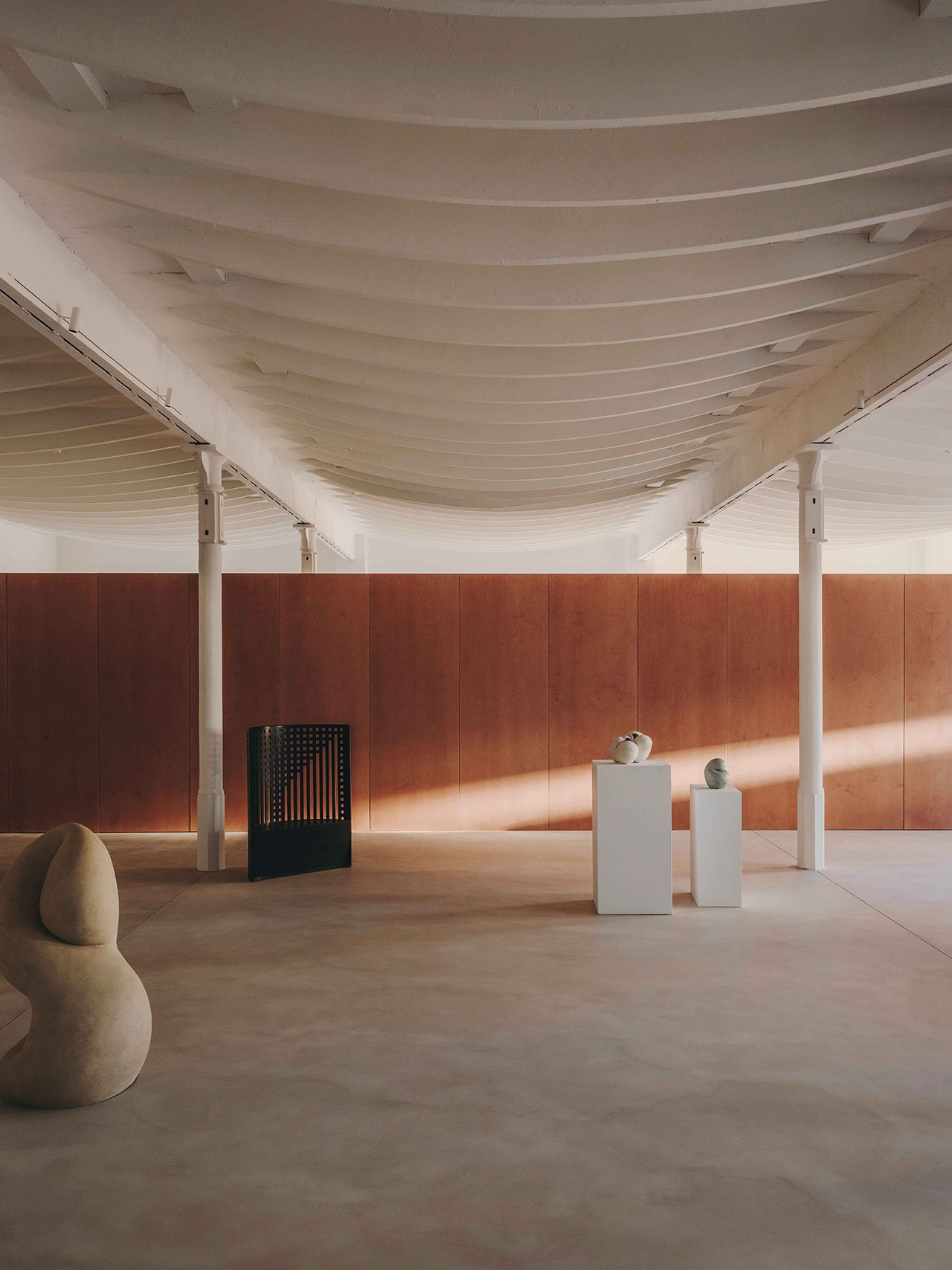 The gallery is located in one of the city’s coolest neighbourhoods, Poblenou, a former industrial area turned creative hub, home to tech offices, creative studios and design showrooms. Housed in a converted factory, the property’s greatest asset is its structural configuration: two rows of slender steel columns that support a ribbed ceiling structure, an unusual building feature whose vaulted form imitates local 19th-century architect Joan Torras’ construction techniques.