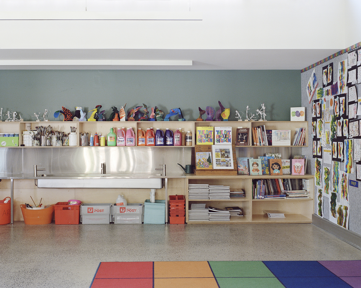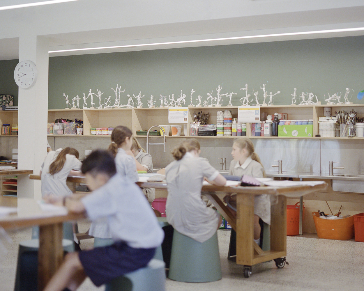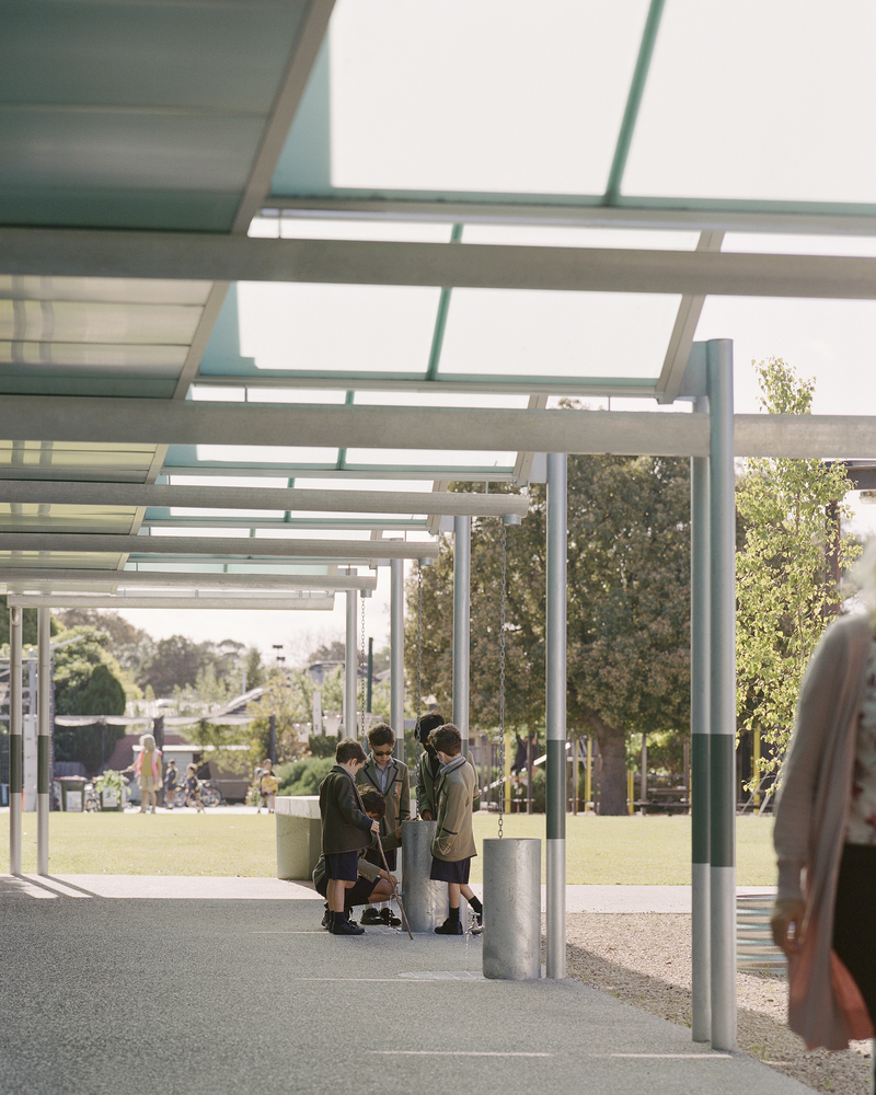 The design response was to achieve more with less by implementing a series of modest and precise interventions to the existing buildings, improving their overall performance and programmatic function. The key new element was a canopy structure that unified the previously disparate buildings into a cohesive, identifiable precinct with increased permeability and improved connections between indoor and outdoor learning spaces. Carefully considered extractions and additions defined the project scope in order to meet tight budgetary constraints. Interior walls were removed to provide large, flexible classrooms with access to resources that could be customized to suit the particular needs of each class. An under utilized toilet block was replaced by two small group rooms, activating the previously blank facade that connects the new STEAM precinct to the existing campus while facilitating a variety of learning group sizes and abilities. Interiors were lined with acoustic panels to improve acoustic performance.