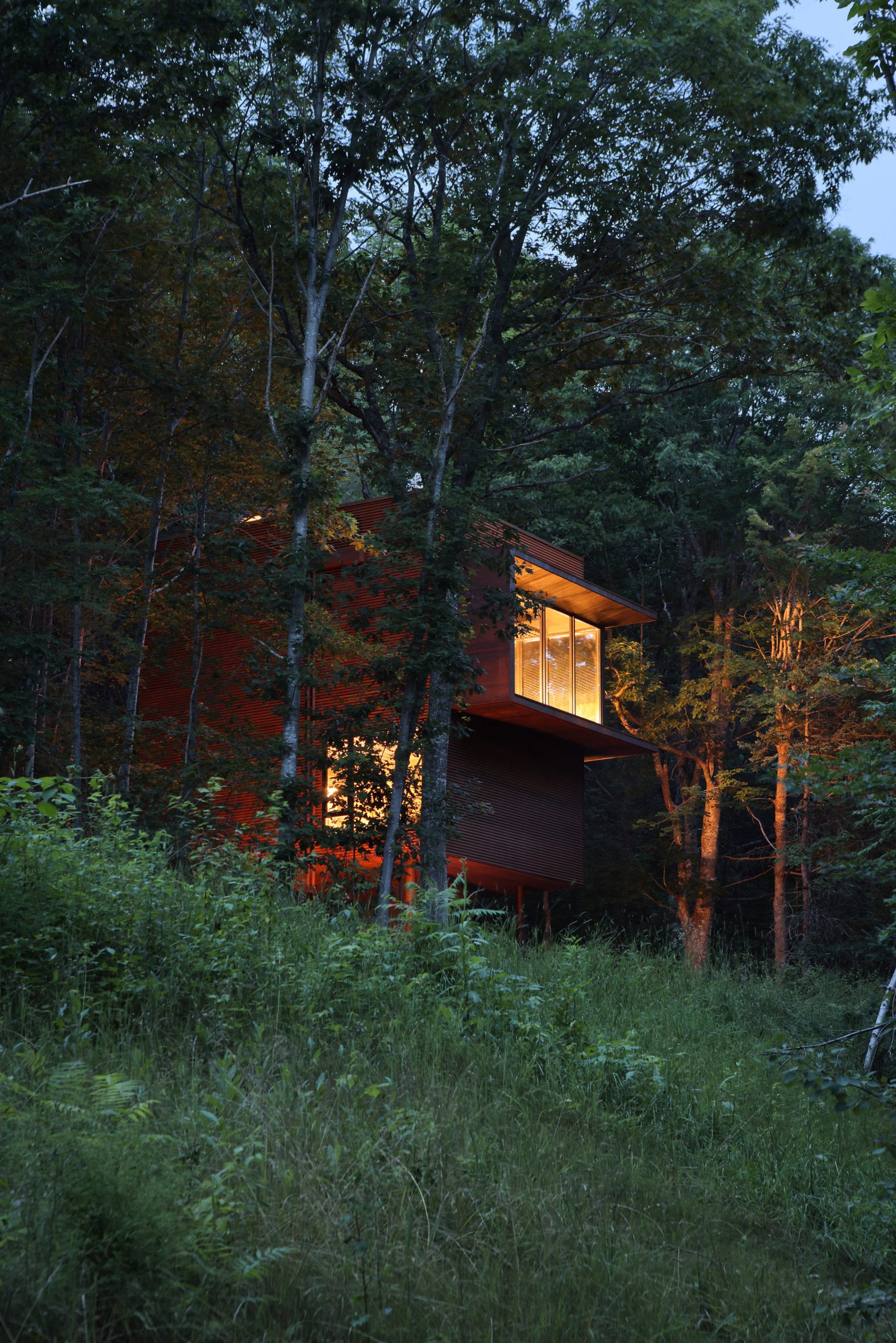 Canadian studio Omar Gandhi Architects has wrapped an elevated cabin in Corten steel on a forested hillside in Nova Scotia.
