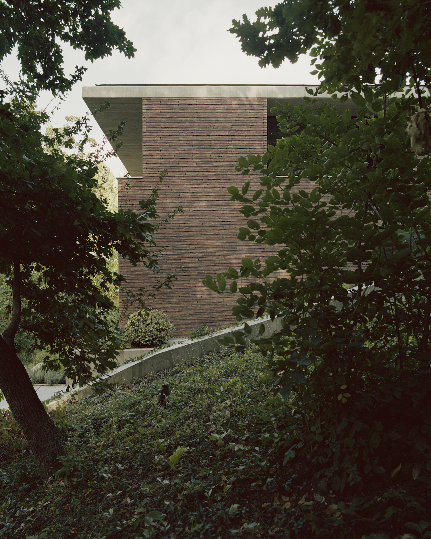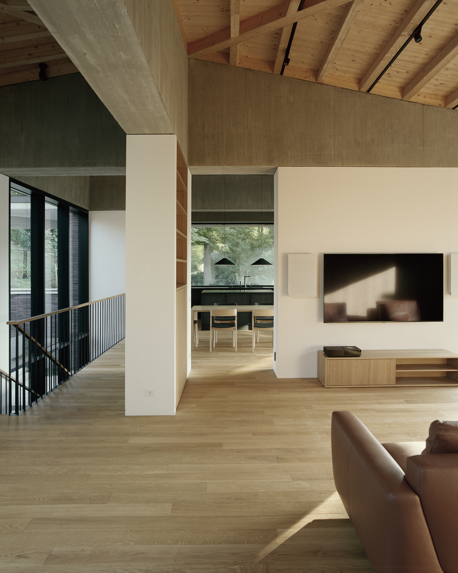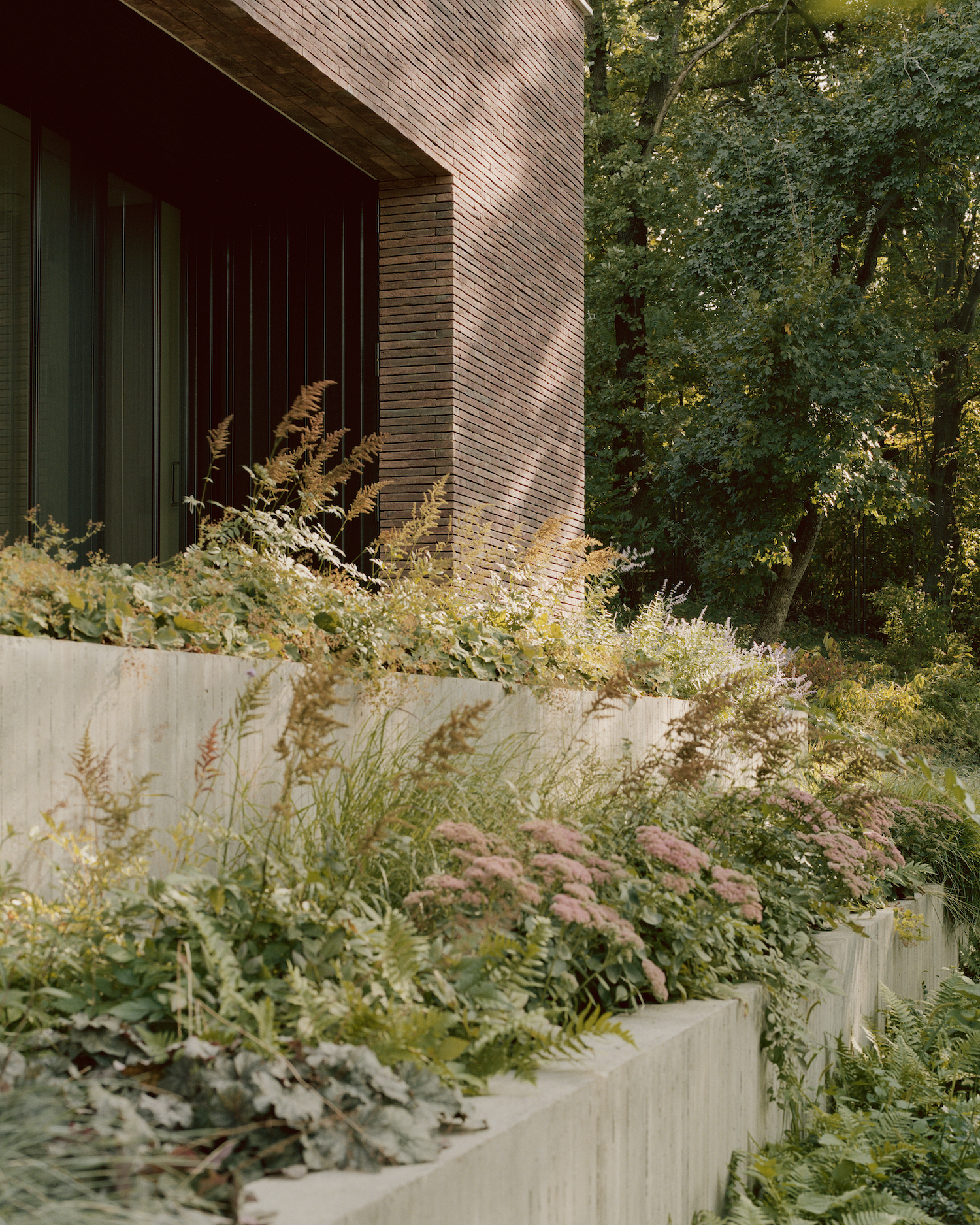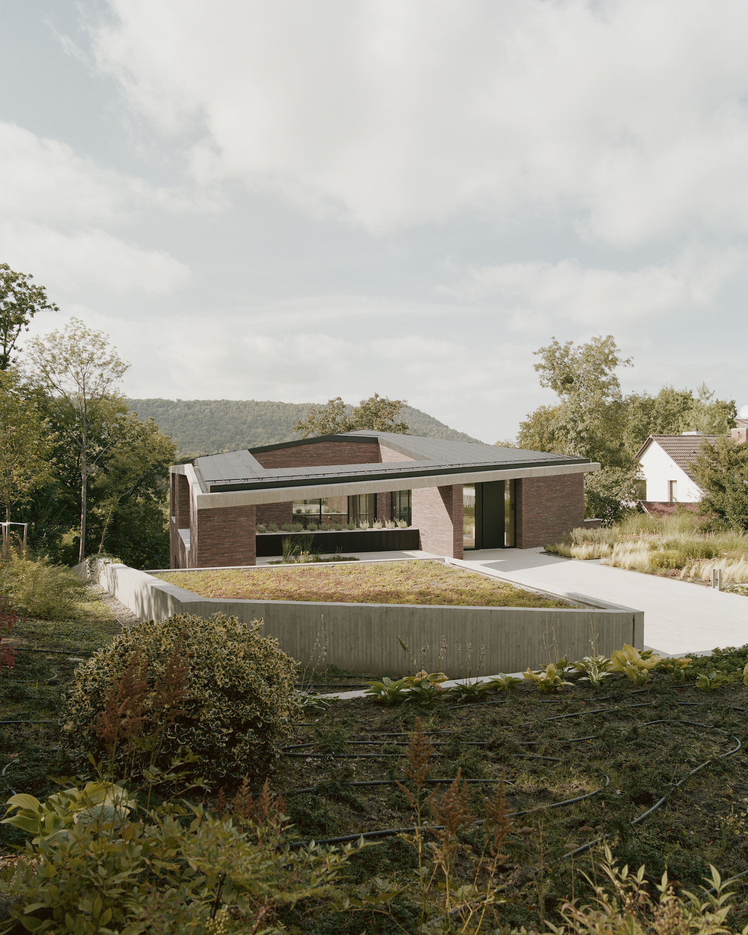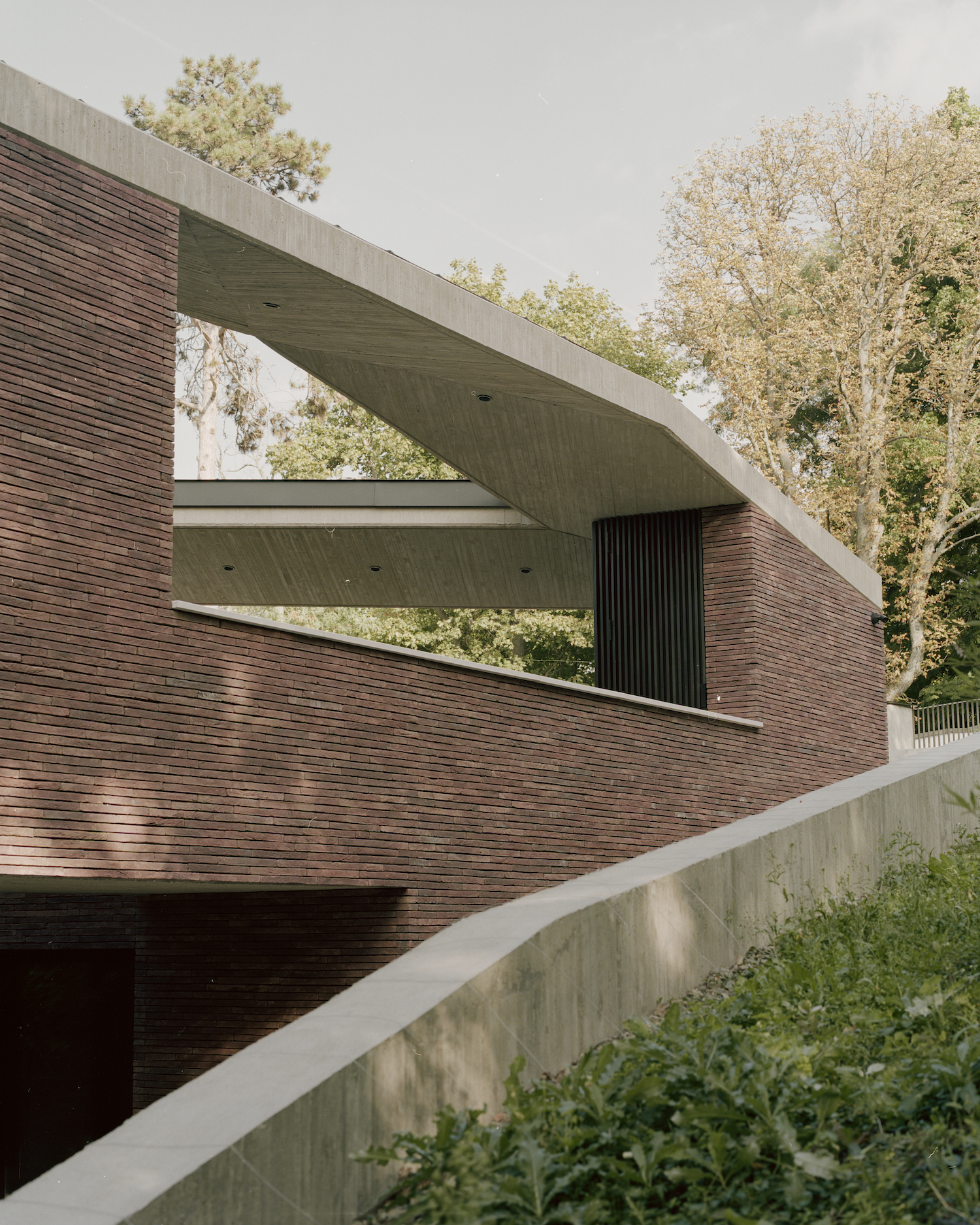The façade juxtaposes the solidity of structural concrete with elongated, rust colored brick cladding that’s ventilated for durability. Complementary black-painted wood paneling adorns the retracted surfaces near the green roofing, while black aluminum is chosen for doors and windows. The roof itself is finished with dark gray sheet metal. Internally, the design continues the theme of material duality, with exposed concrete beams and the wooden roof structure defining the space, allowing for minimalistic interior accents that enhance the architectural features. The design is orchestrated to create harmony between the interior and the exterior, with landscape vistas, internal gardens, and structural elements framed by large openings. The interior details are crafted to resonate with the exterior, fostering a subtle dialogue between the two.