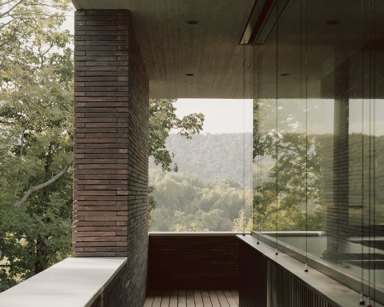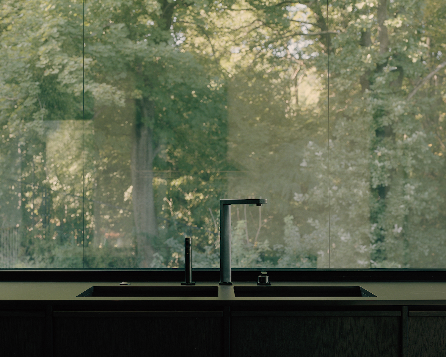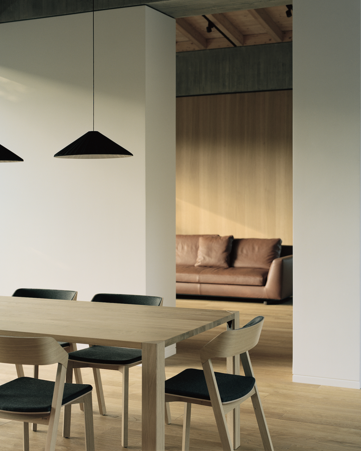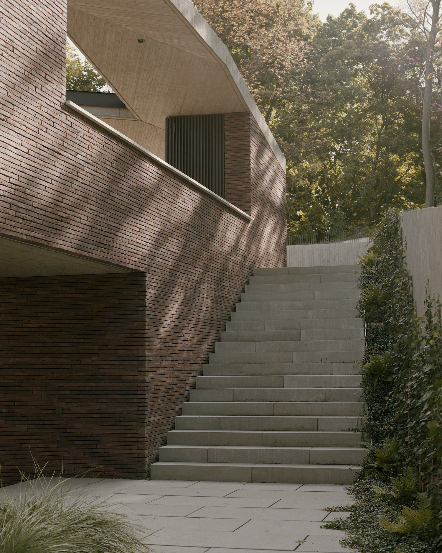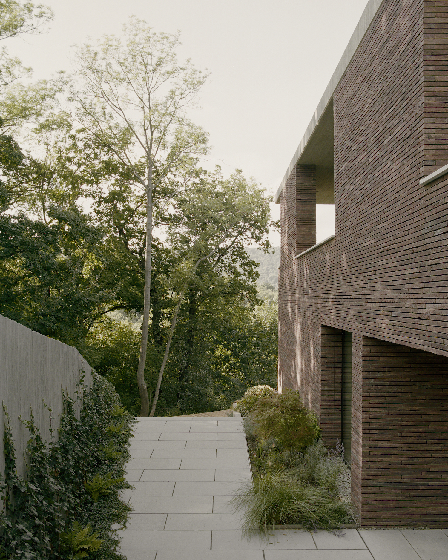 The façade juxtaposes the solidity of structural concrete with elongated, rust colored brick cladding that’s ventilated for durability. Complementary black-painted wood paneling adorns the retracted surfaces near the green roofing, while black aluminum is chosen for doors and windows. The roof itself is finished with dark gray sheet metal. Internally, the design continues the theme of material duality, with exposed concrete beams and the wooden roof structure defining the space, allowing for minimalistic interior accents that enhance the architectural features. The design is orchestrated to create harmony between the interior and the exterior, with landscape vistas, internal gardens, and structural elements framed by large openings. The interior details are crafted to resonate with the exterior, fostering a subtle dialogue between the two.