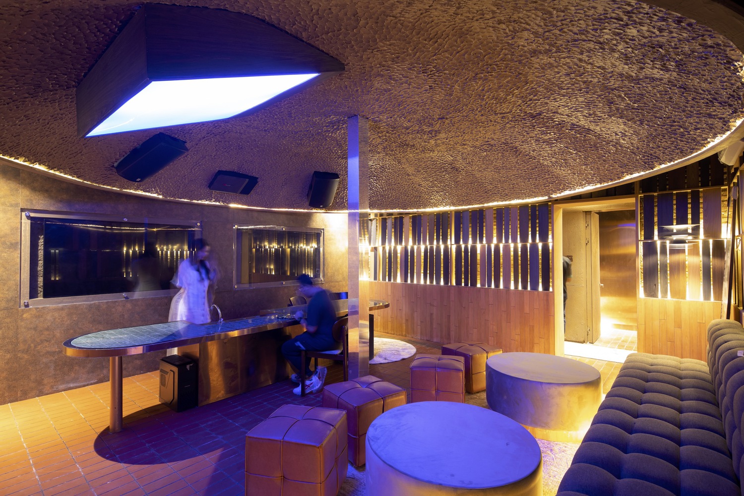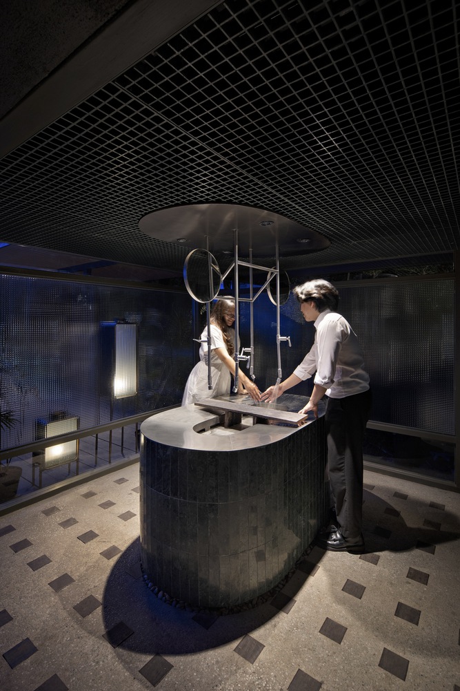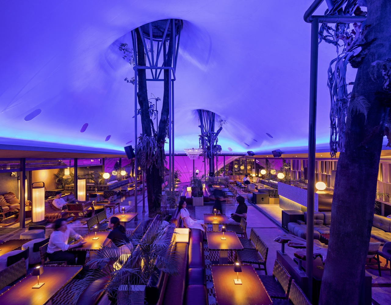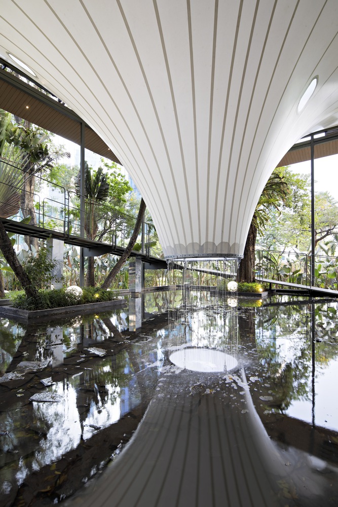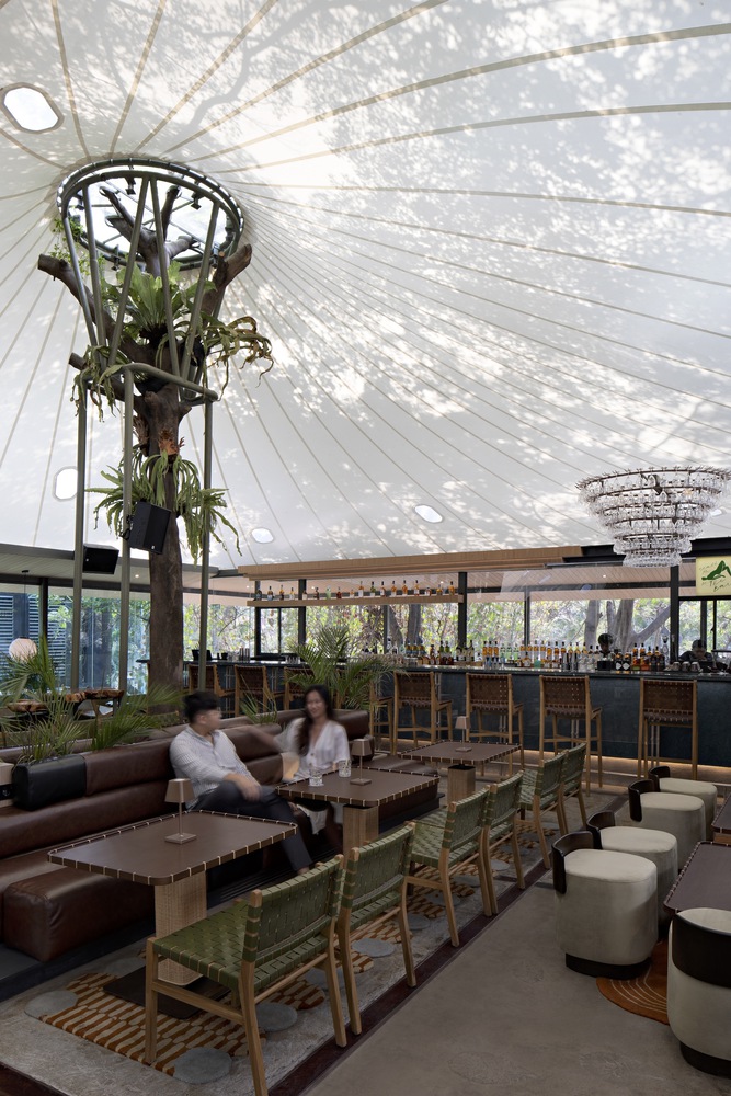 The entrance is hidden and scaled down in the ending of vertical plants; then, the restaurant visitors would be greeted and wait in a narrow foyer surrounded by greenery before being accompanied to the upper bar resto among the trees. This 750 sqm upper bar resto was framed by a light steel-timber thatch roof around it that provides not only shades for all the glass openings but also acts as the anchor for the parametric tensile in the middle. The roof, which acted as both a façade and a varied ceiling in the interior, also serves as a lantern that is part of cityscape entertainment during night time, enhancing multiple functions accustomed to the music inside.