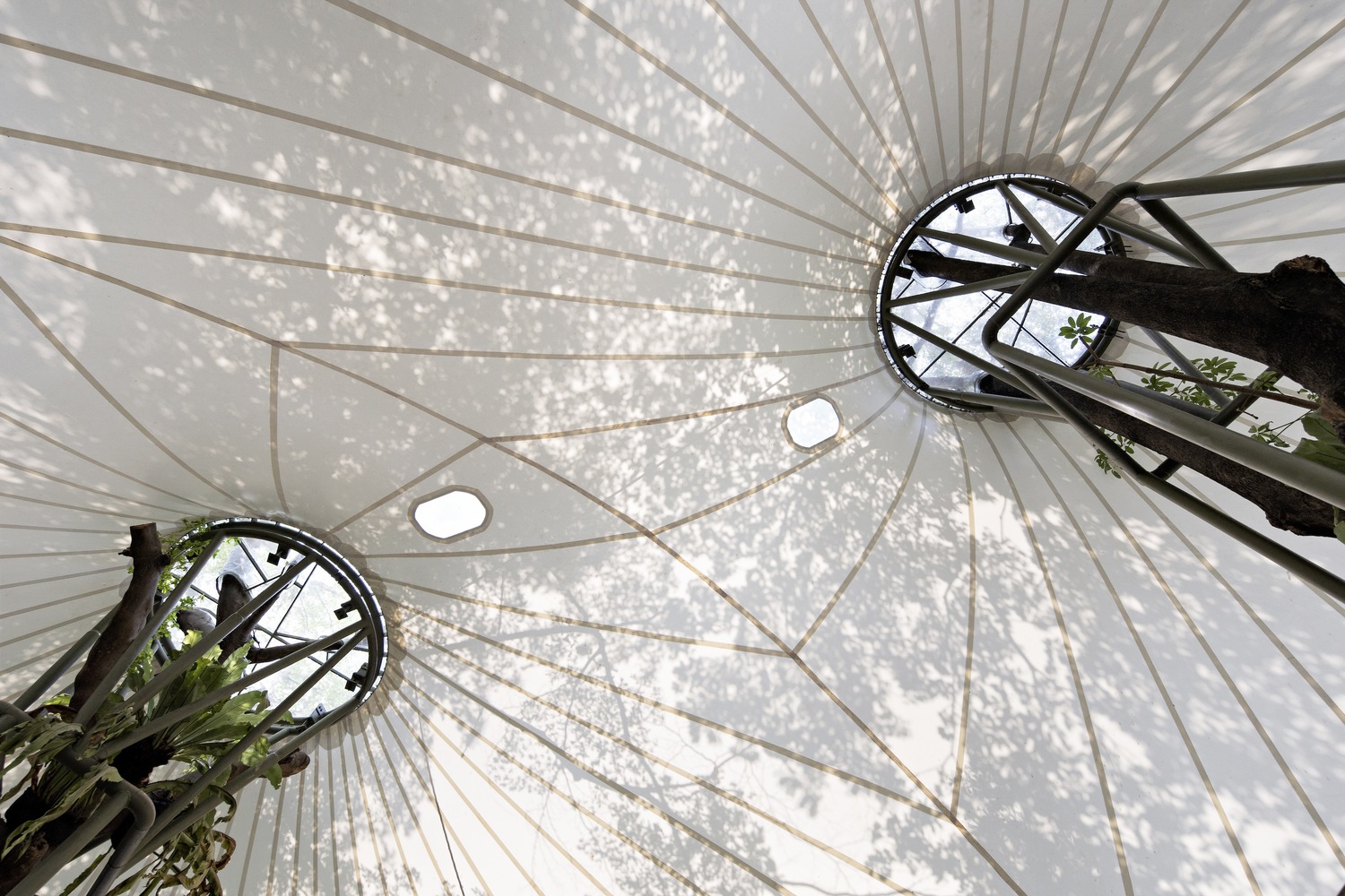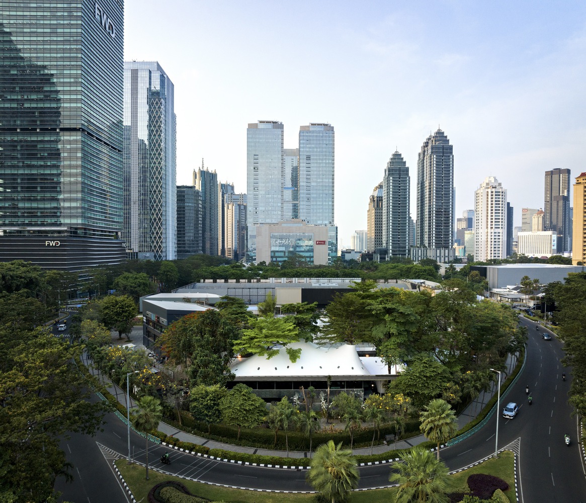 Stalk, the Tree Hugger is a project comprising five 30-meter tall existing trees in the heart of Jakarta’s busiest business district, being wrapped and clothed into a canvas of light and shadows that host multiple functions of commercial activities. The architect was to experiment with space creation by creating a simple architecture of a parametric cloth that hugs existing greeneries, creating many variations of closure enclosures of the space.