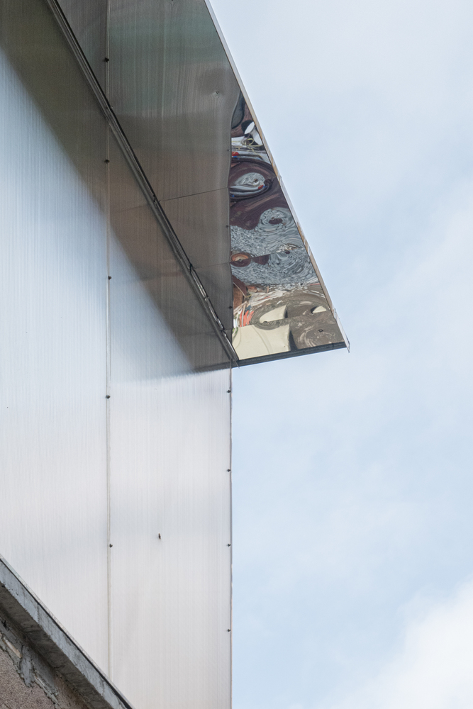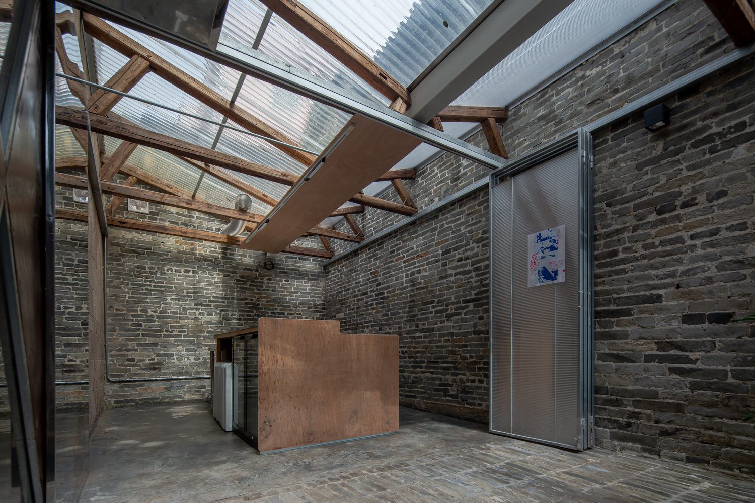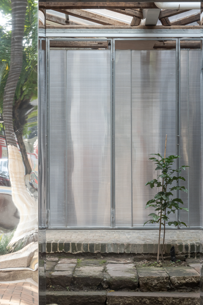 The low pavilions and scattered trees create a pleasant environment, making it the most popular gathering place. This has inspired us. For the outdoor area, we employed a simple approach to reshape the pawnshop's courtyard and the alley in front. We used leftover materials from the clearance process to create segmented steps connecting the park with the interior and exterior of the pawnshop. We also incorporated a newly made mirrored doorway, which reflected the surroundings, diminishing the perception of a deep doorway.