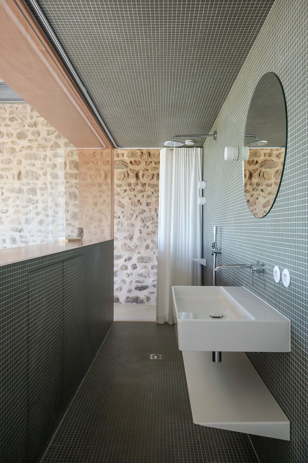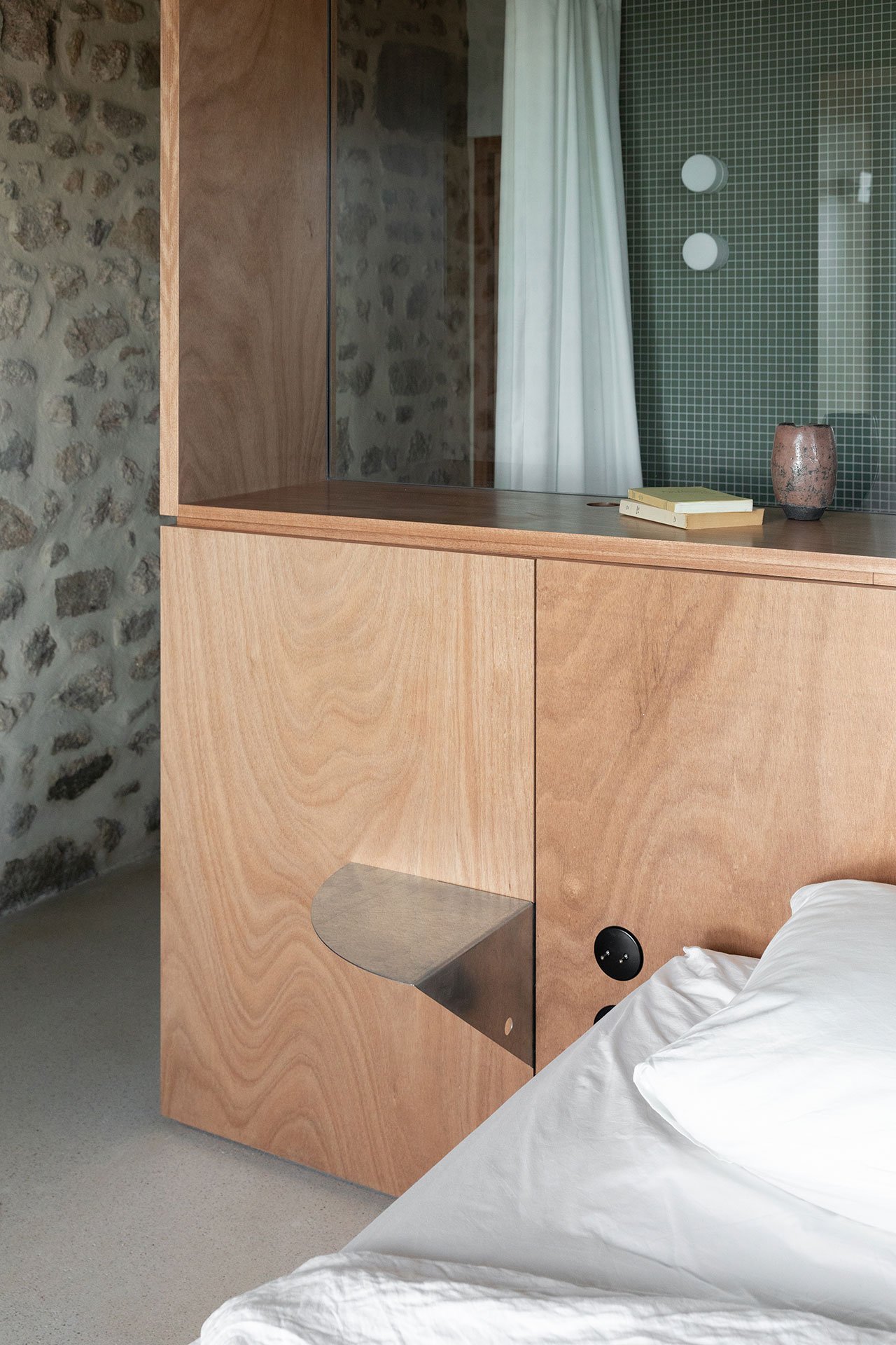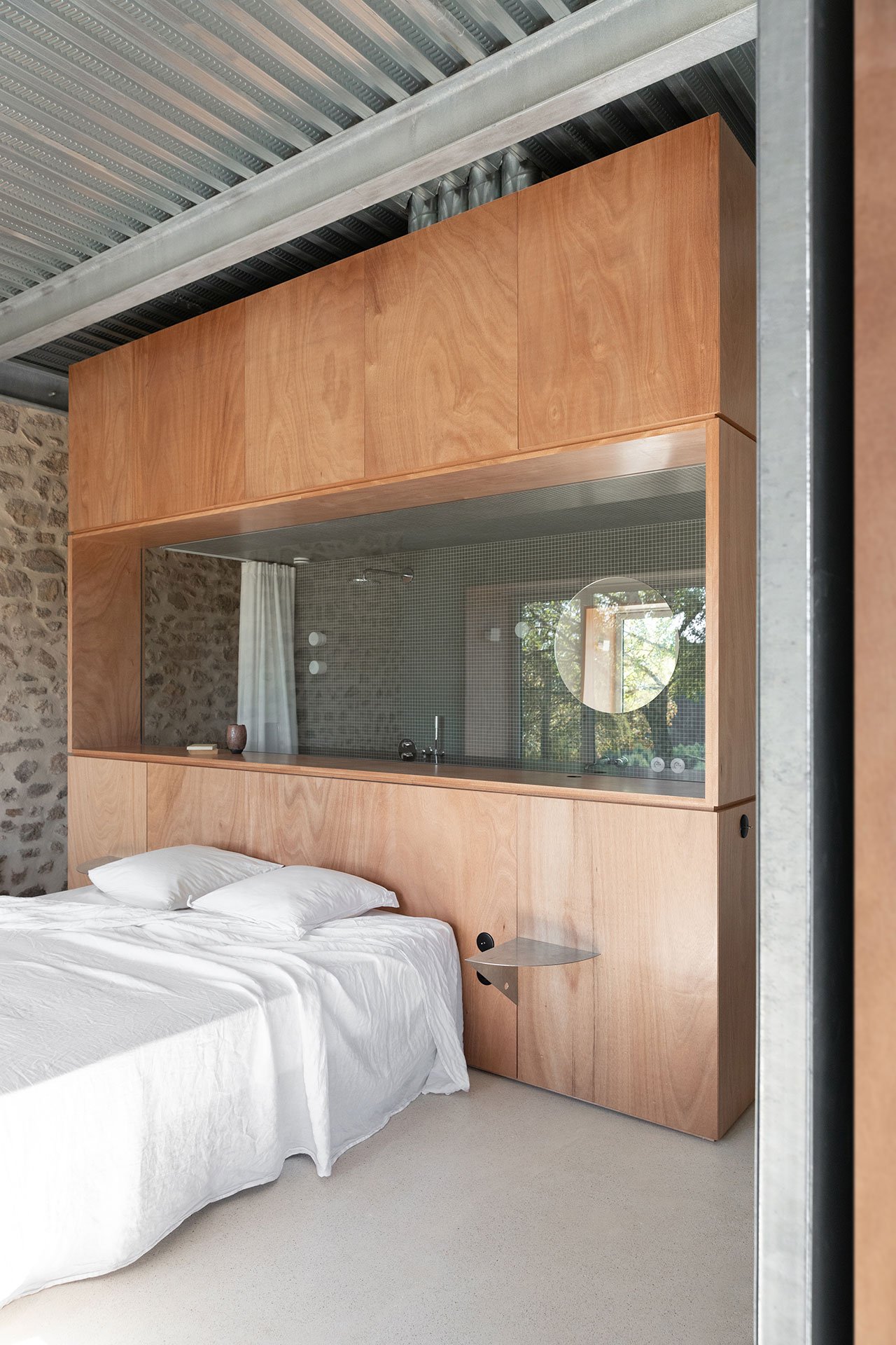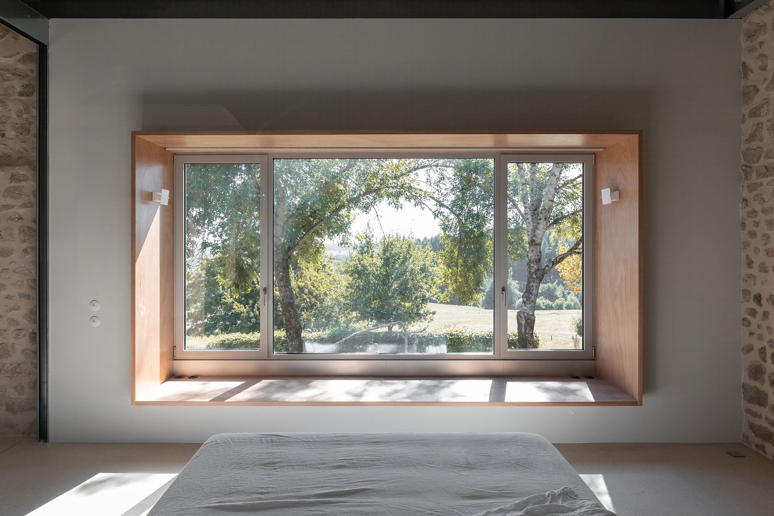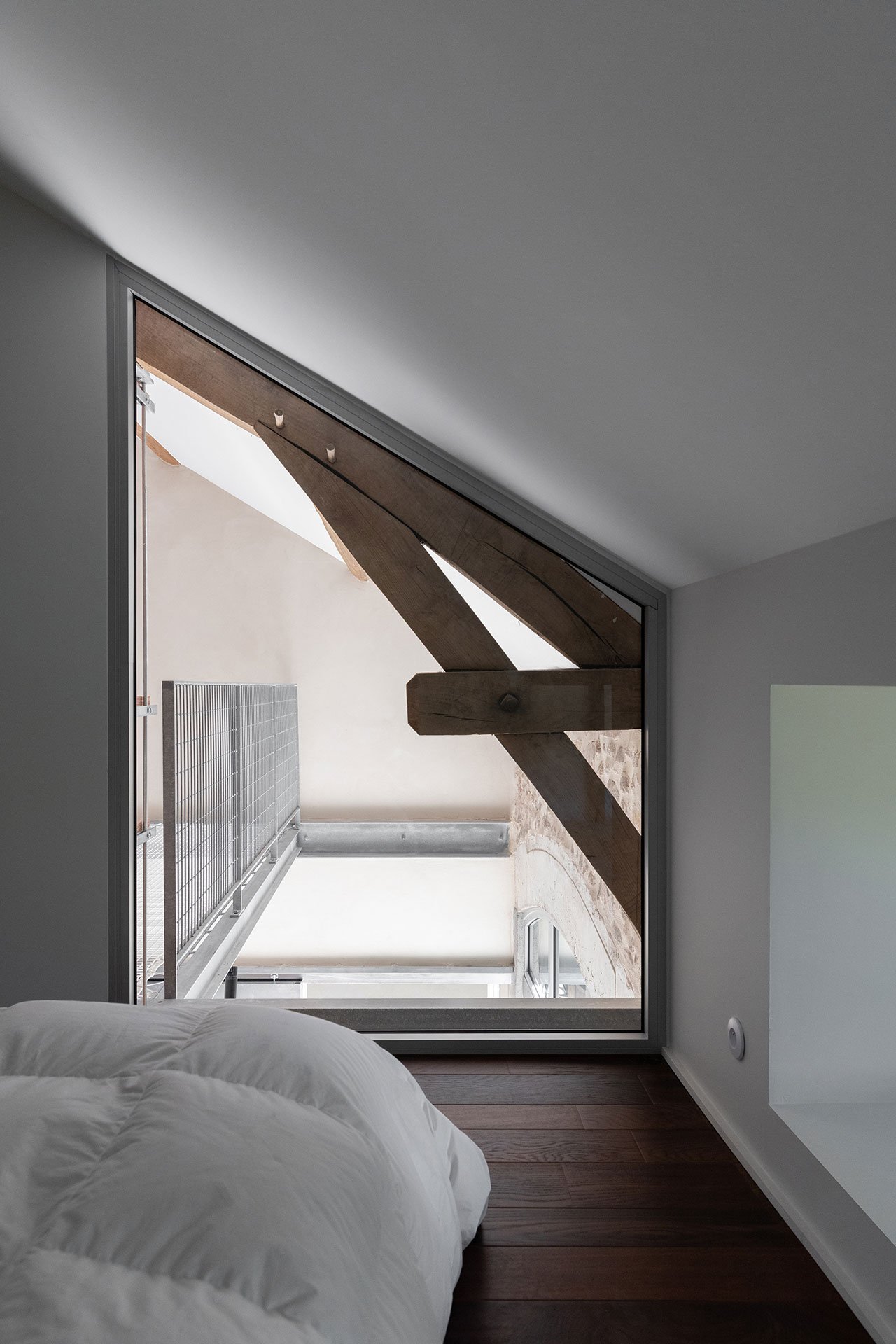 Large patio doors that open onto a newly constructed balcony usher plenty of natural light into the living room as well as frame an idyllic vista, as do the wide carriage doors, once fully open, across the space the latter a nod to the building’s agrarian past. Similarly, an expansive window, complete with a lengthy windowsill seat, introduces light and views into the main bedroom, all the way to the en-suite bathroom in the back. Housed in a wooden box fitted with a frameless glass opening, the bathroom is yet one more example of minuit’s detail-oriented, technically-sophisticated design approach.