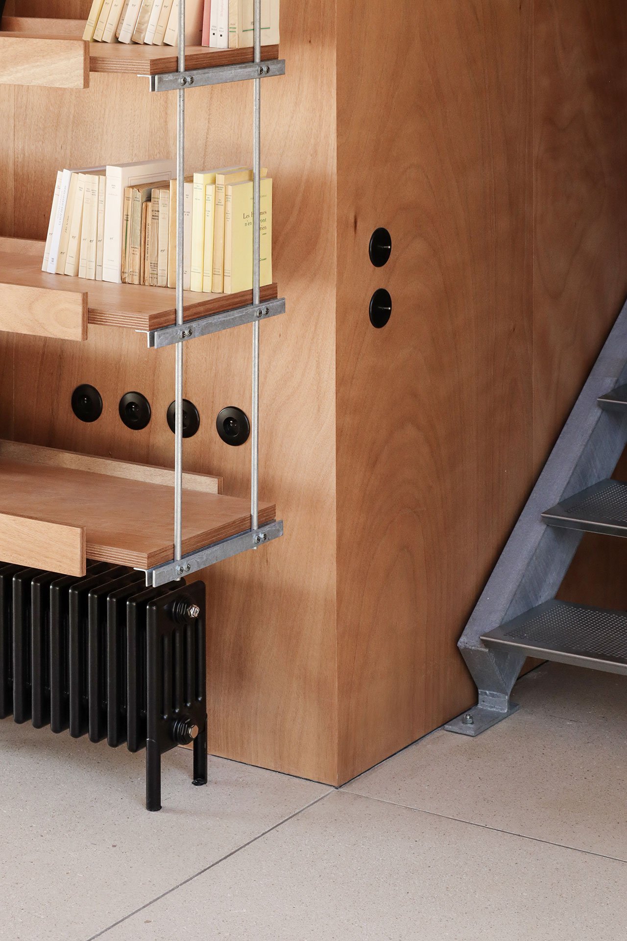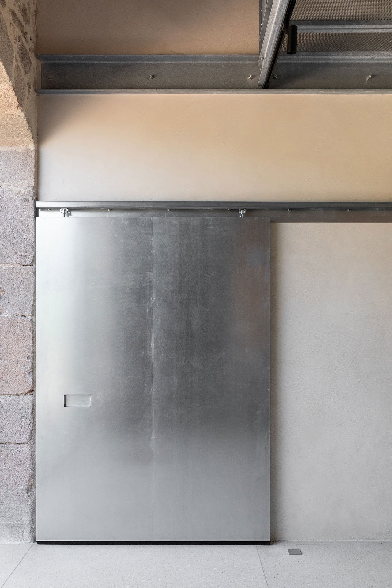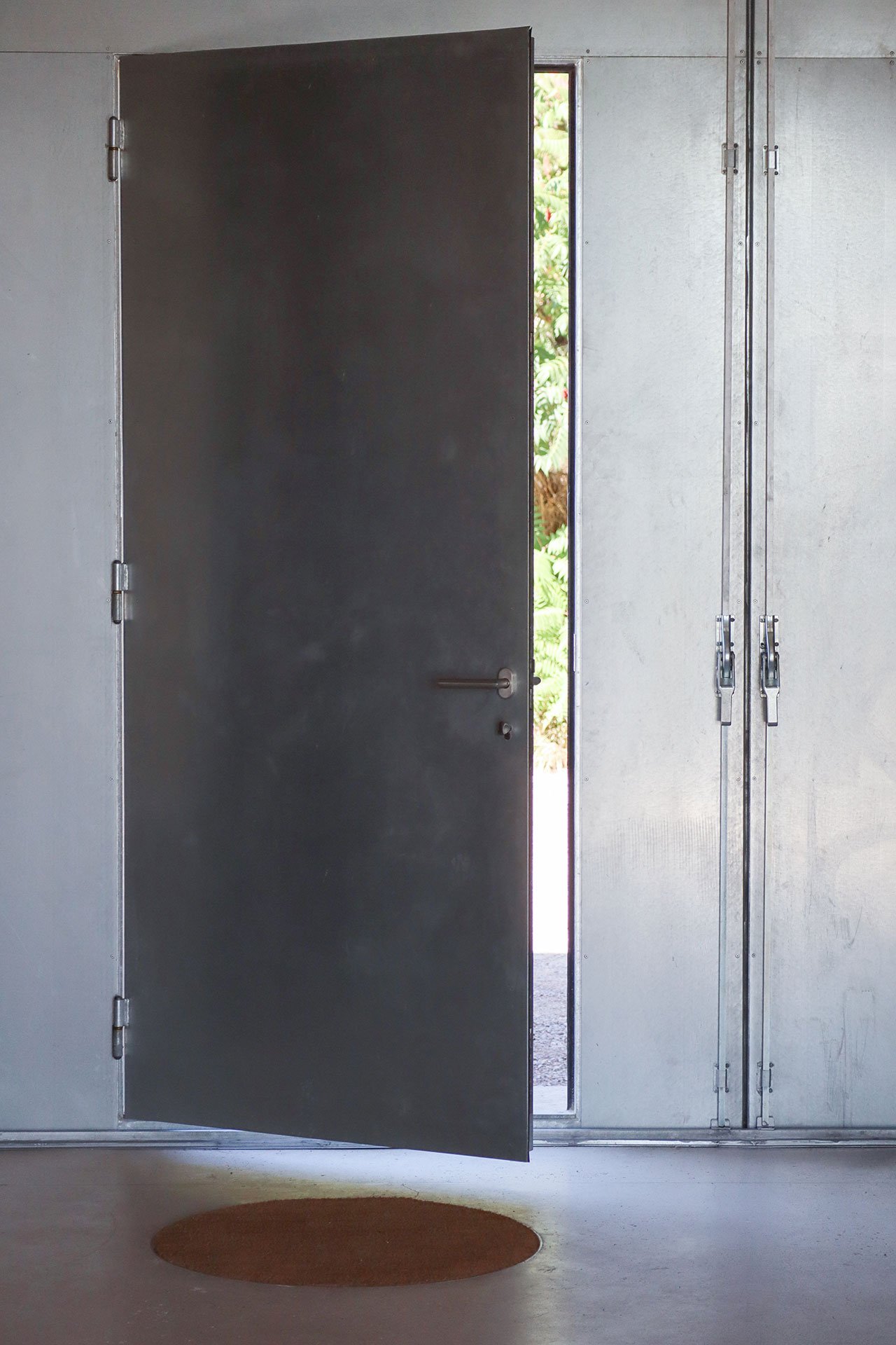 Structural beams, floor decking and door panels made from galvanised steel, a material chosen for its visual lightness and structural efficiency, add industrial touches while the use of Okoumé timber, an African wood with a warm, mahogany-like, red brown appearance, imbues the spaces with warmness, also complementing the exposed masonry wall construction.