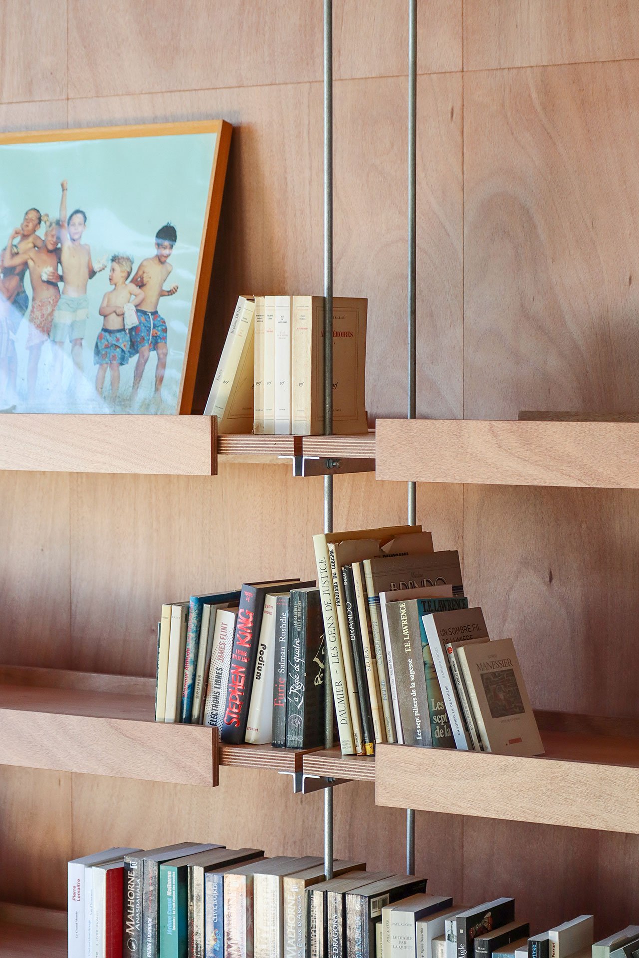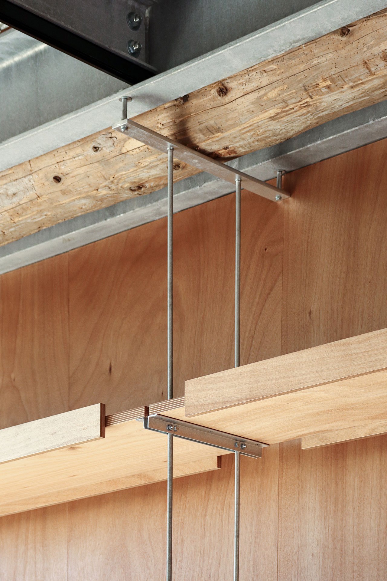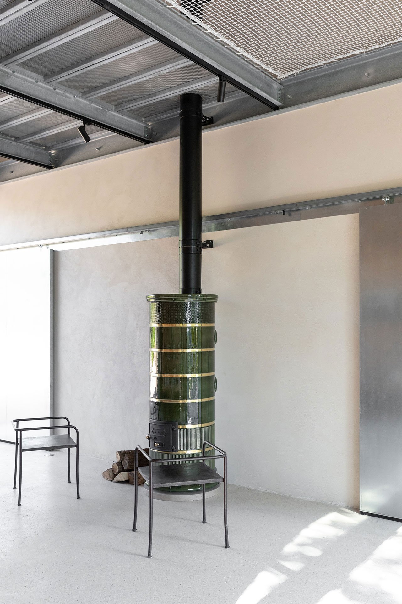 Structural beams, floor decking and door panels made from galvanised steel, a material chosen for its visual lightness and structural efficiency, add industrial touches while the use of Okoumé timber, an African wood with a warm, mahogany-like, red brown appearance, imbues the spaces with warmness, also complementing the exposed masonry wall construction.