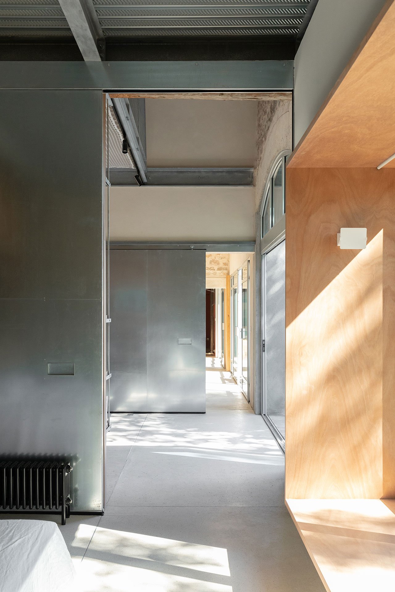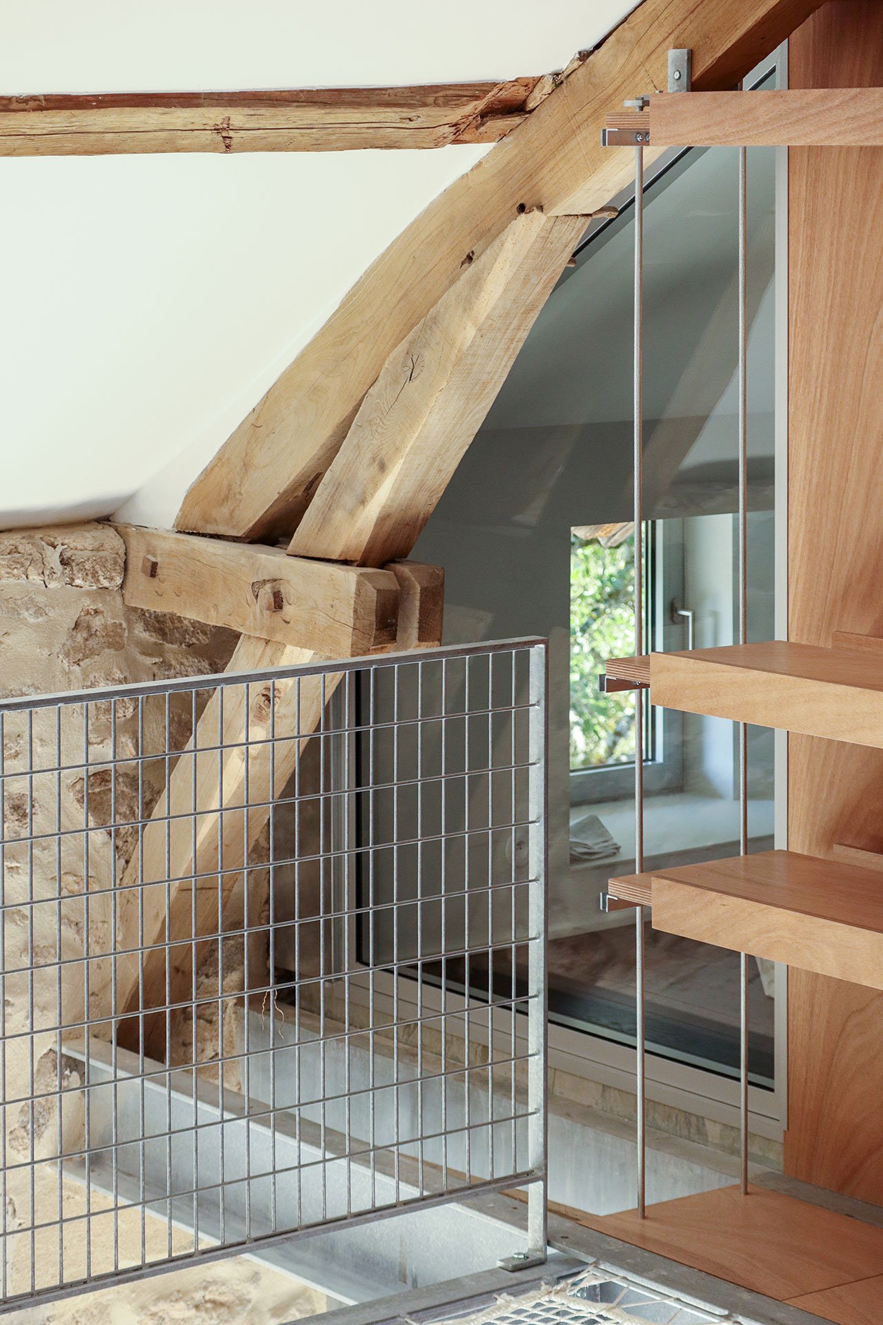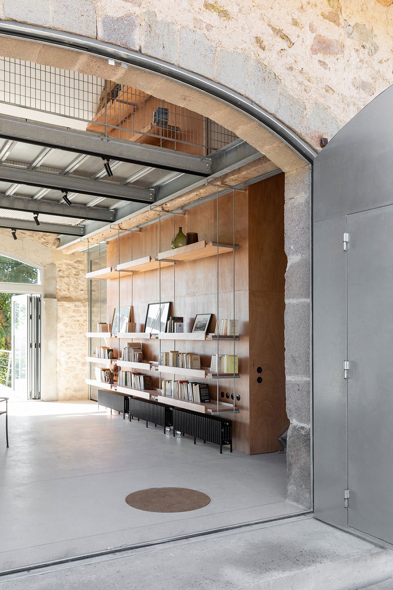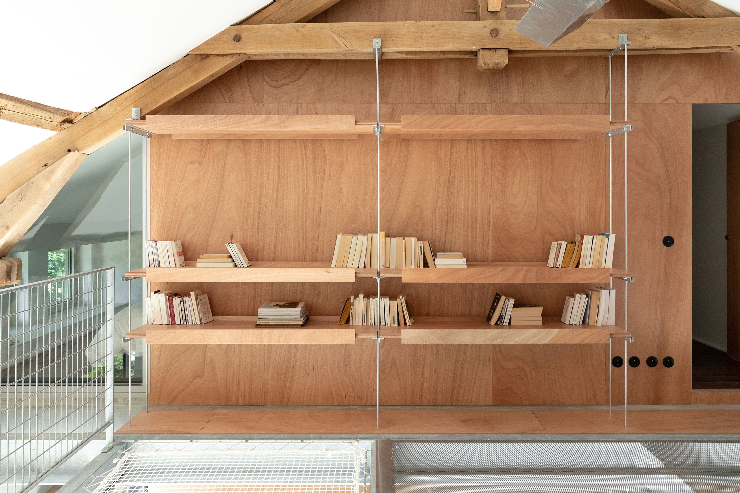 At the heart of the renovation is a metal and wood structure that has been surgically inserted into the building in such a way as to not disturb the original masonry walls and timber beams. The structure divides the space into a generous living room and a private area with two bedrooms on two levels, while also functioning as a support framework for an array of furnishings such as suspended shelves, luminaires, railings, sliding doors and even a hanging net suspended above the living room.