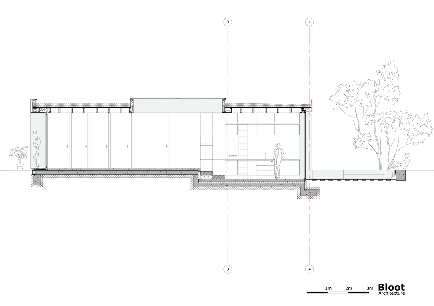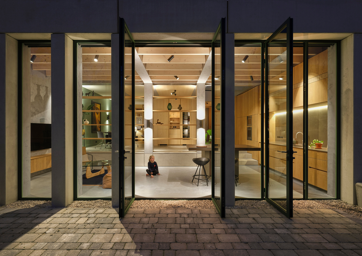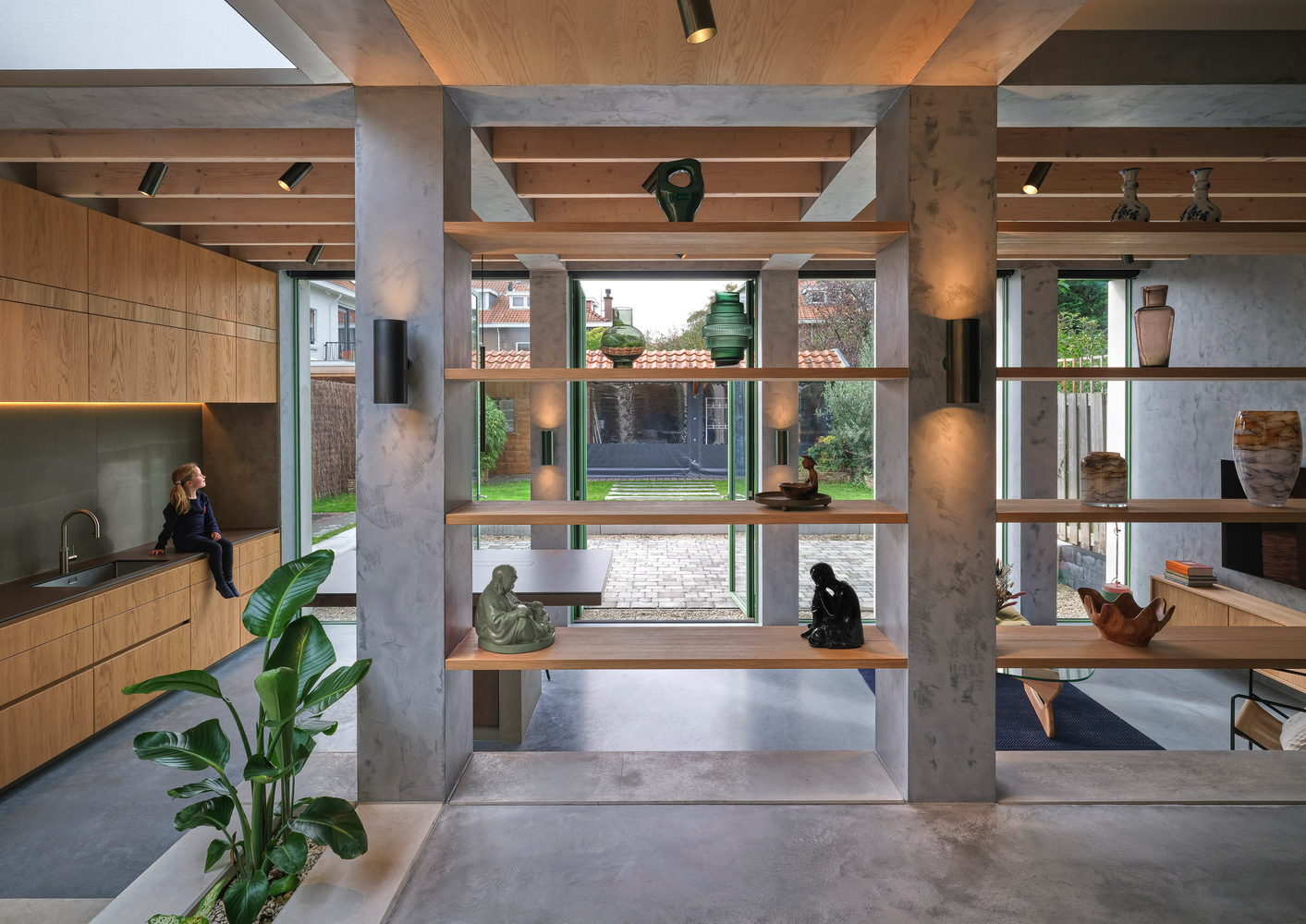 The corner house has been dissected and has become part of a spatial plan in which functions overlap and are interchangeable. Only the kitchen, which is spread over 3 elements in the room, is fixed. The material palette consists of wood, concrete, and steel, but there are different types and textures of each material. This rich pallet gives warmth, depth, and diversity to the design.