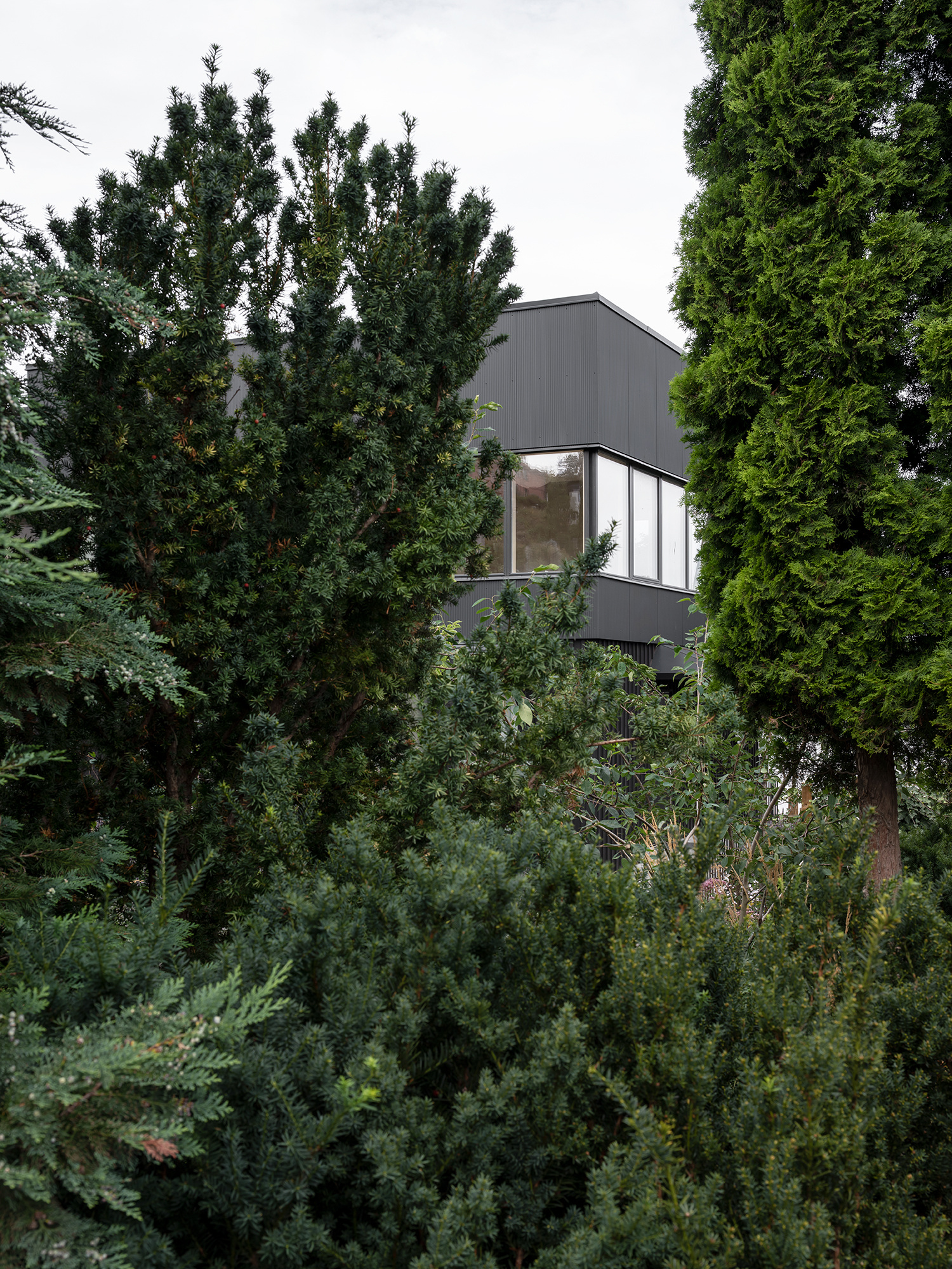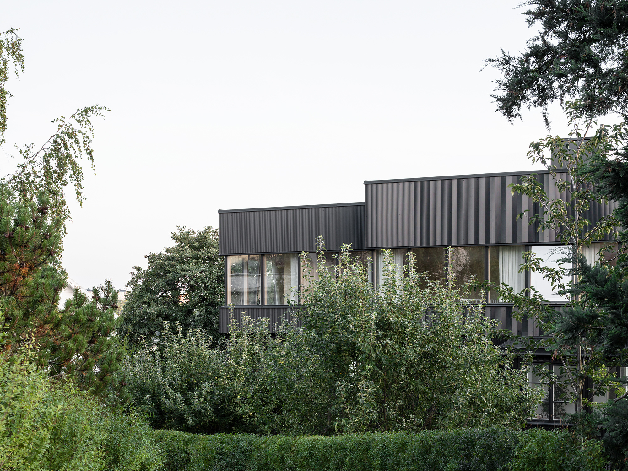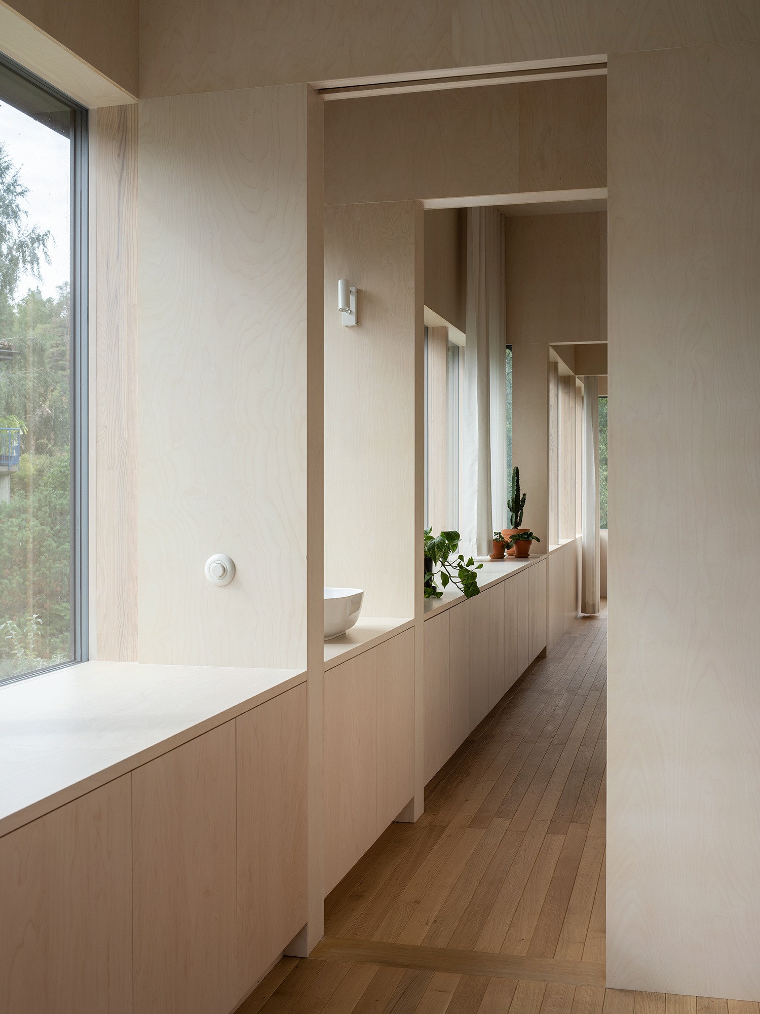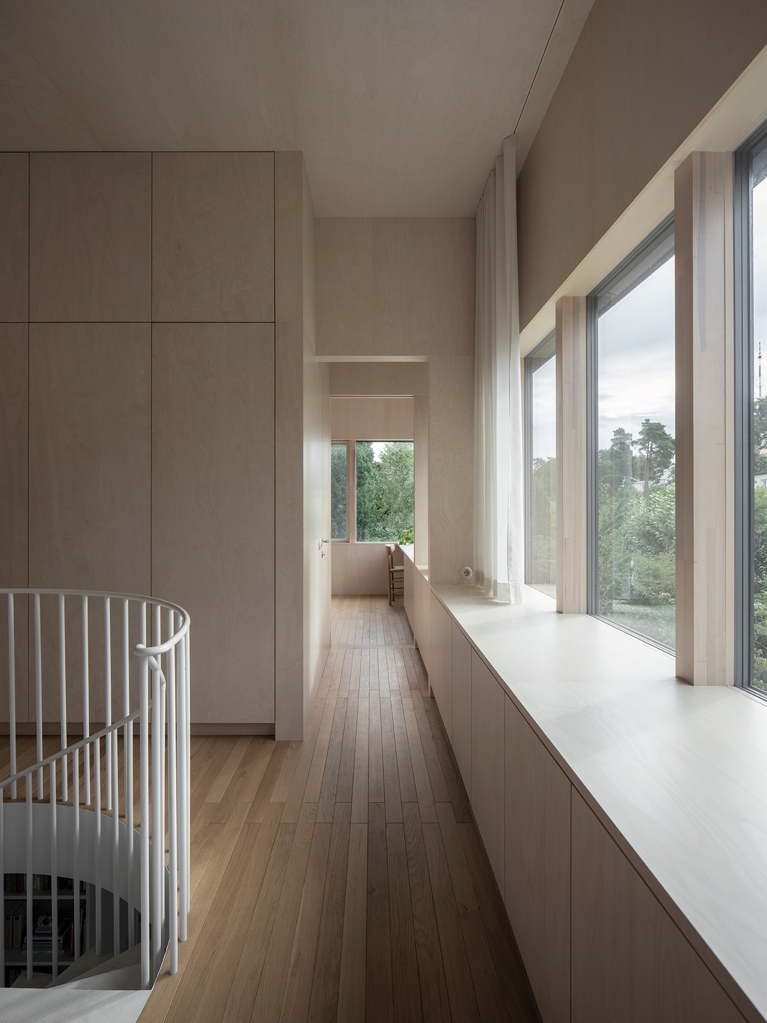 The basement underwent a significant transformation, with its ceiling height increased to accommodate a multifunctional space featuring a laundry room, gym, steam sauna, and spa. The first floor was entirely reimagined as a sleek, rectangular structure, distinguished by ribbon windows and a subtle corrugated sheet metal exterior, reflecting a modern addition to the house’s evolving story. The interior journey is designed to maintain a constant visual connection with the landscape, with rooms arranged along the building’s perimeter. Birch plywood is used extensively for walls, ceilings, doors, and built-in furniture, creating a cohesive and custom monochromatic aesthetic.