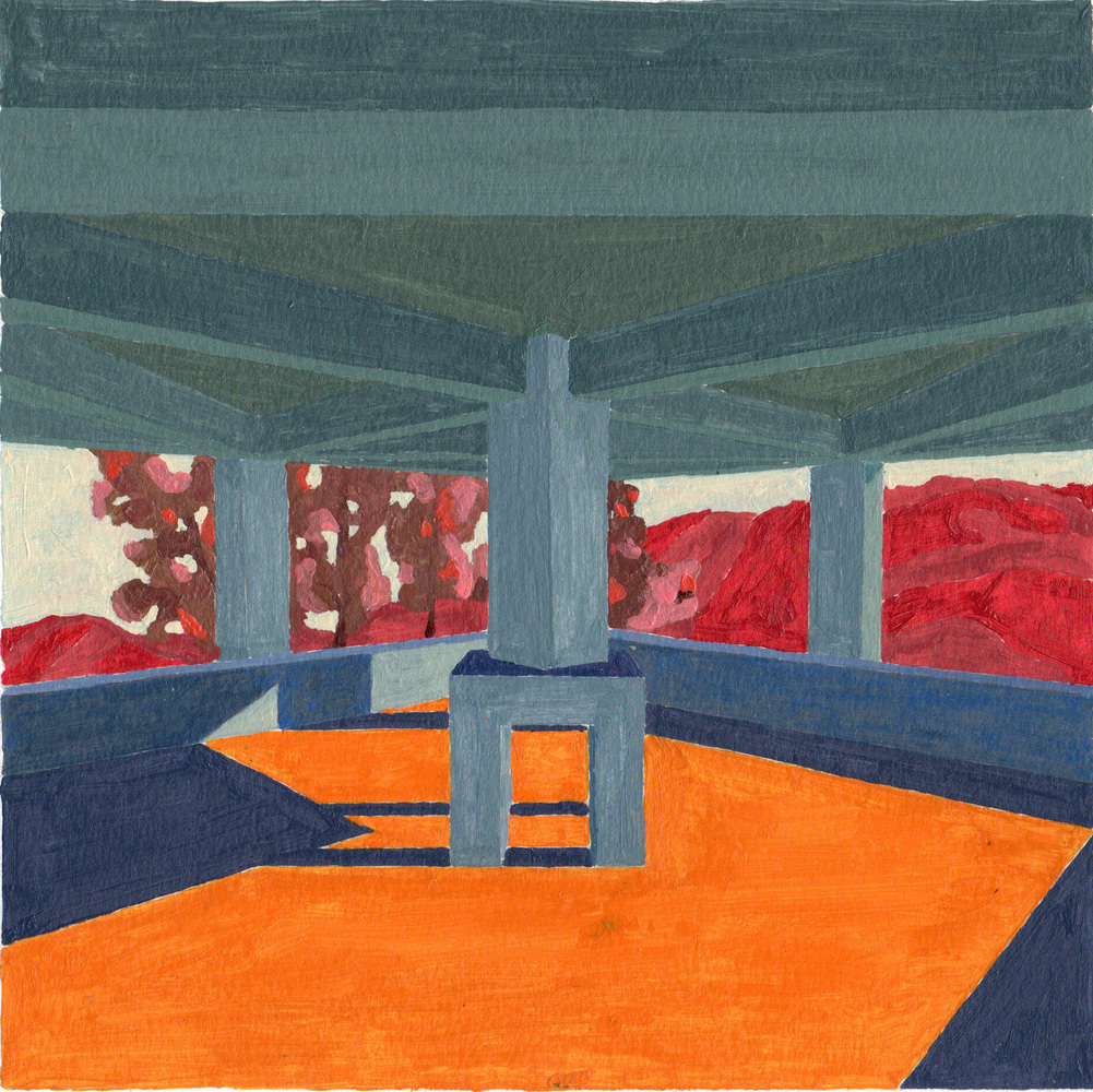 The floor and ceiling are a horizontal slab projected halfway up the elevation, a thin cantilevered plane that extends towards the four cardinal points, with the difficult function of containing a shallow rainwater pond.