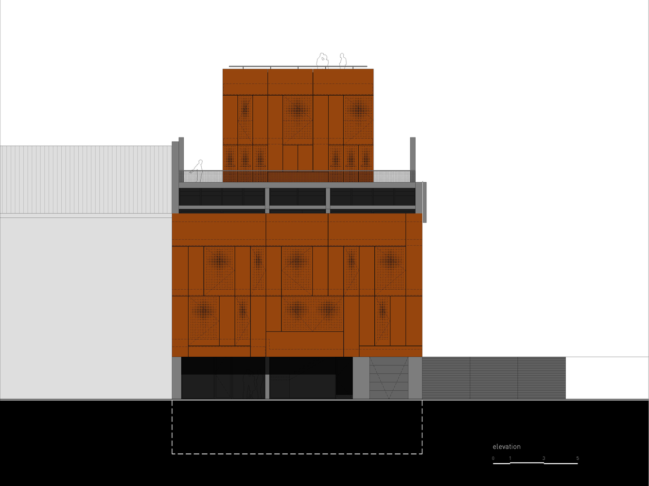 내후성강판이 적용된 외관은 시장생활의 역동적인 모습을 오래시간동안 담는 바탕의 이미지로 제안되었다.