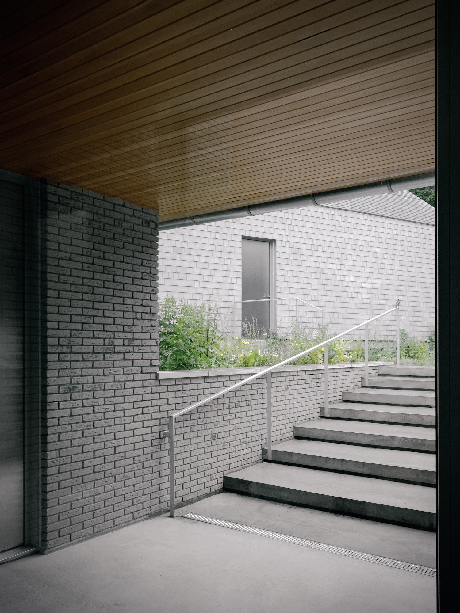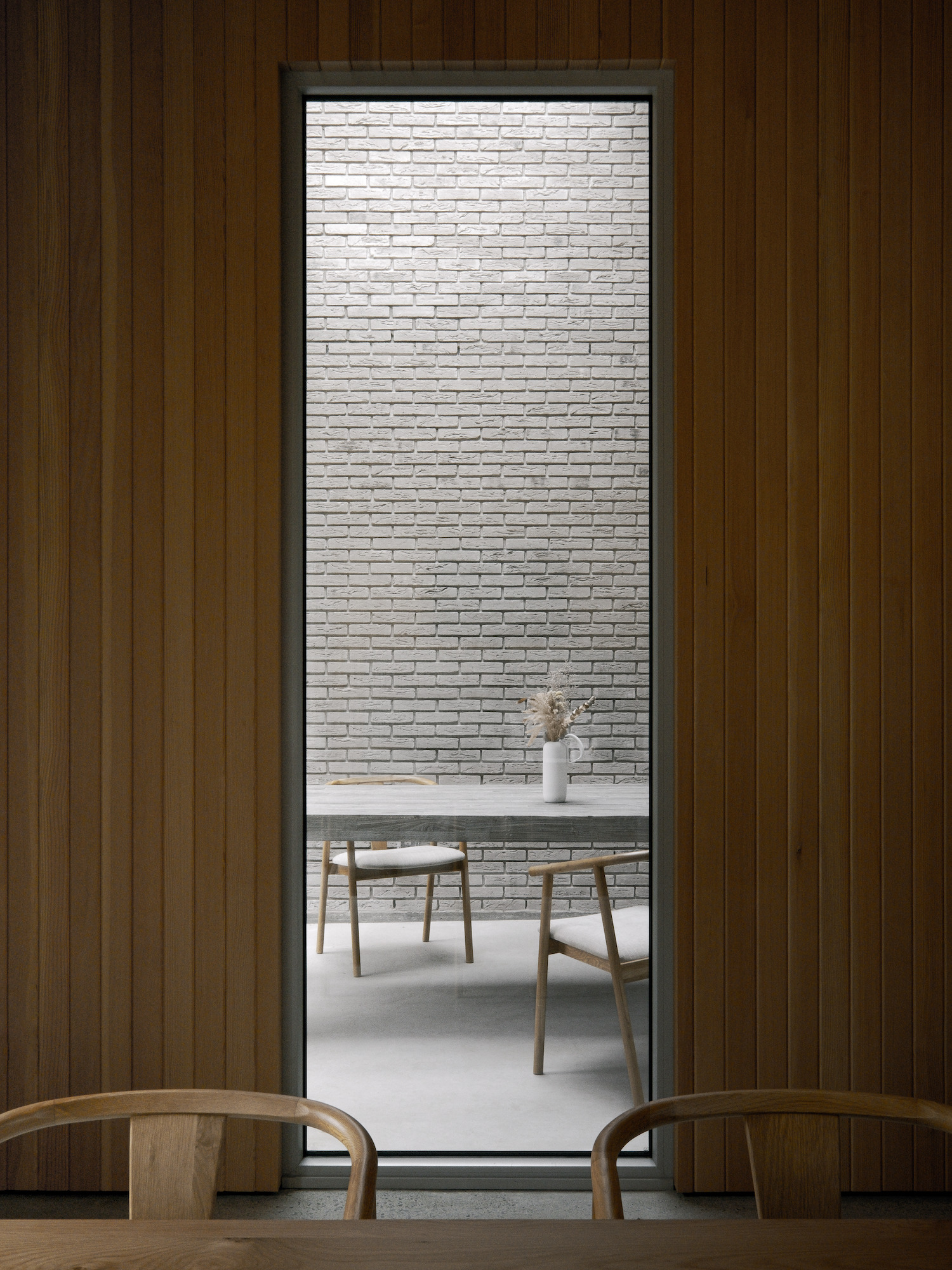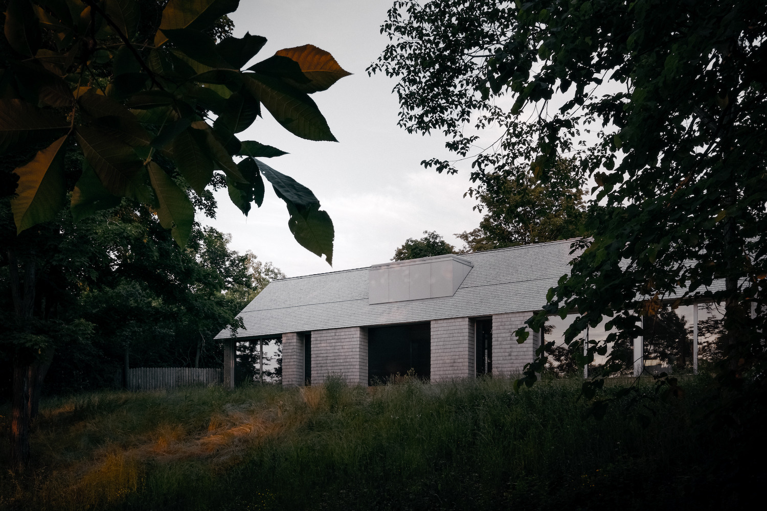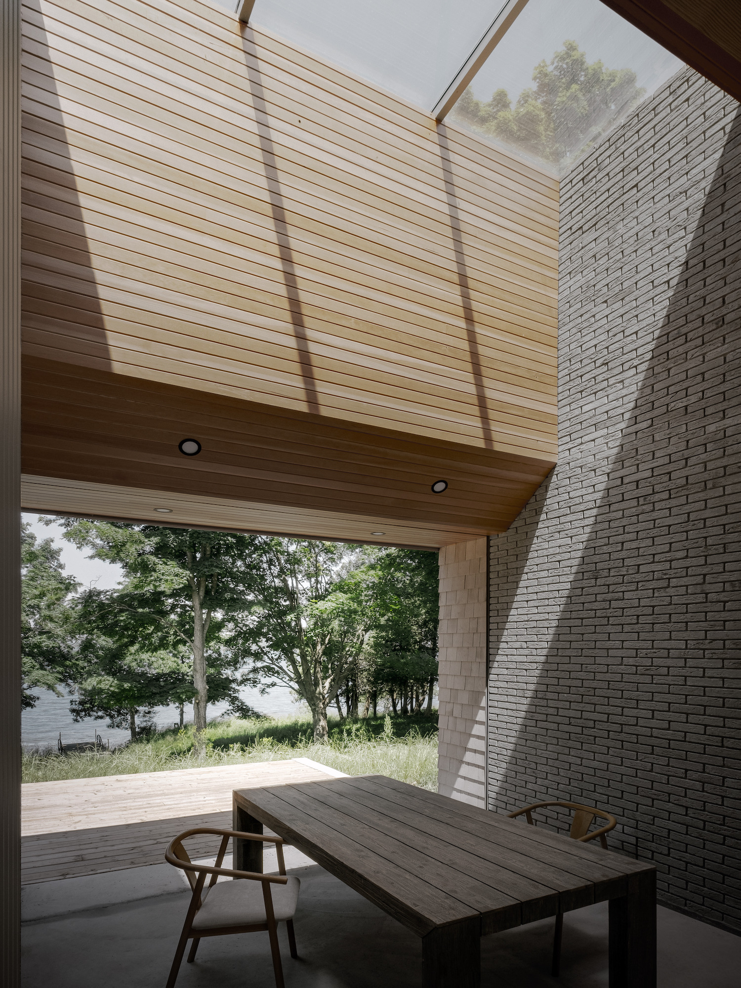 These windows provide an immersive view of the surrounding nature, from the ground up to the sky. The design also includes larger dormers that enhance natural light, replicating the effect of sunlight filtering through tree canopies. The architectural style and materials of Cherry Valley draw on the local agrarian architecture. The use of brick and cedar reflects the dual nature of the site: brick forms the solid wall against the hillside, while cedar extends down the facade facing the water, complementing the surrounding trees. Inside, the walls and surfaces are clad in Douglas fir, with brick elements that echo the exterior design. This blend of materials and the strategic siting of the house create a dialogue between the building and its natural surroundings, making Cherry Valley a notable example of contemporary residential architecture that respects and enhances its setting.