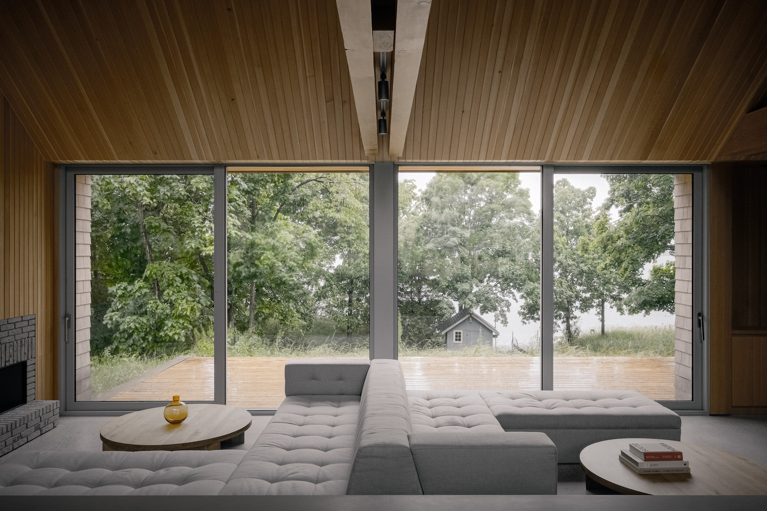 Cherry Valley is a minimal house located in Prince Edward County, Canada, designed by StudioAC. This area is renowned for its complex coastline and emerging wine industry, with a landscape that primarily features fields and shorelines. Cherry Valley is positioned on a site that encompasses both a meadow like plateau at its entrance and a ridge leading down to the lakeshore. The house is strategically placed just below the tree canopy, on a natural ridge offering shelter from the wind and views of the lake, framed by trees. The design of the residence integrates it into the ridge, with the rear protected and the front offering views from beneath the tree line. The house features large windows facing the lake, and ground-level panoramic windows overlooking the meadow.