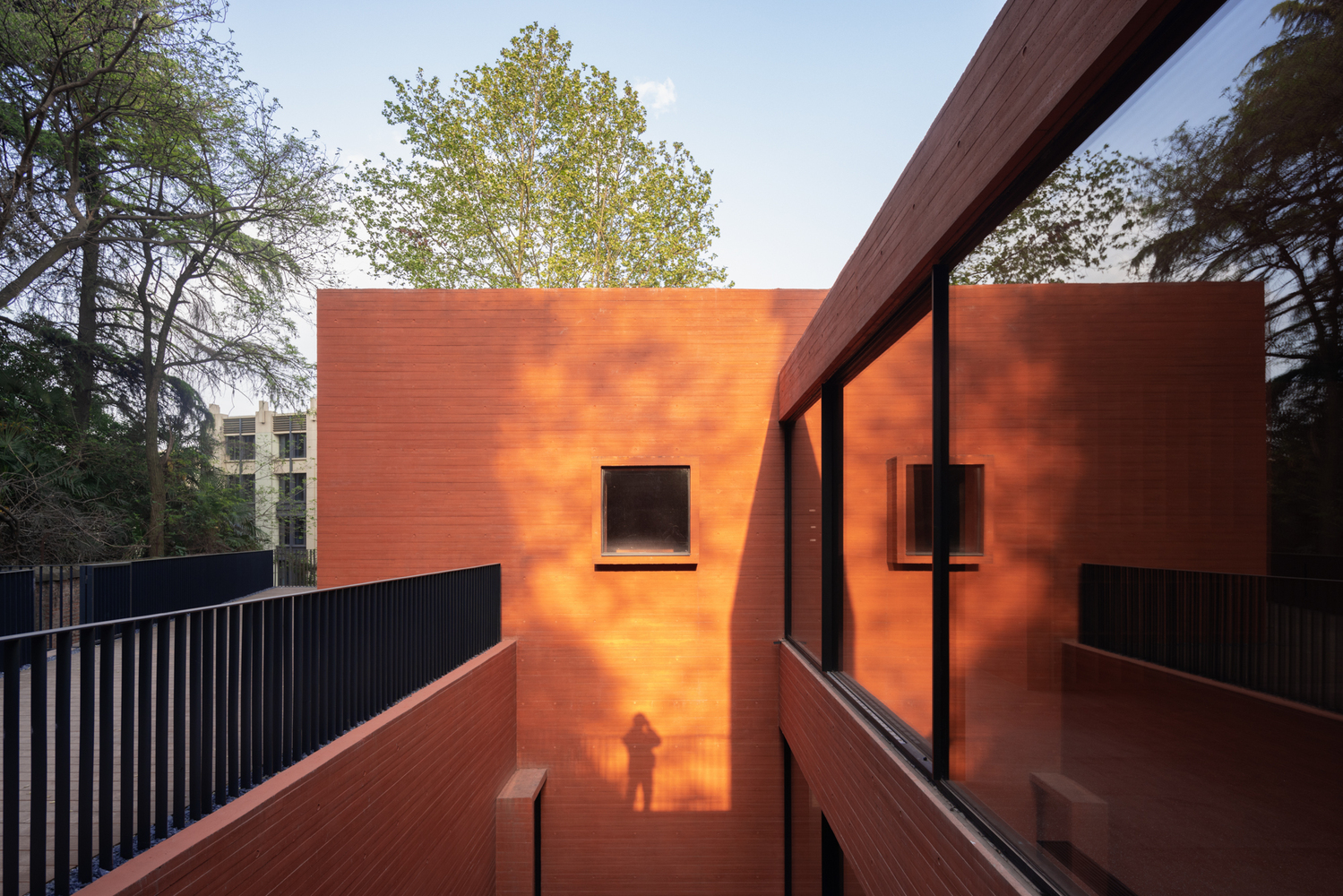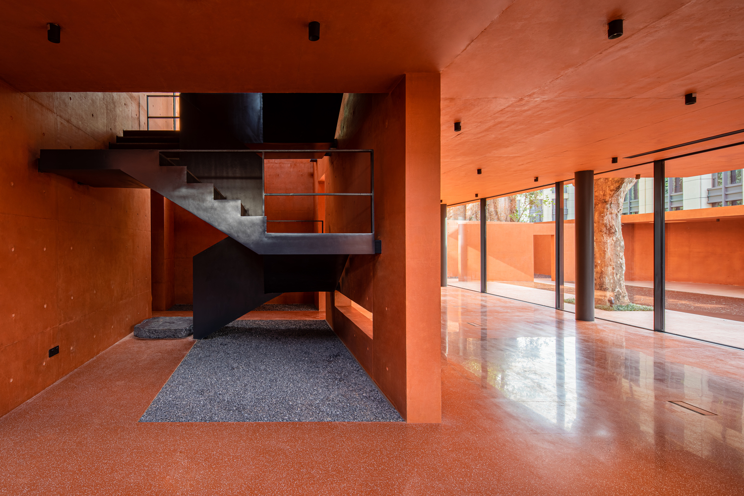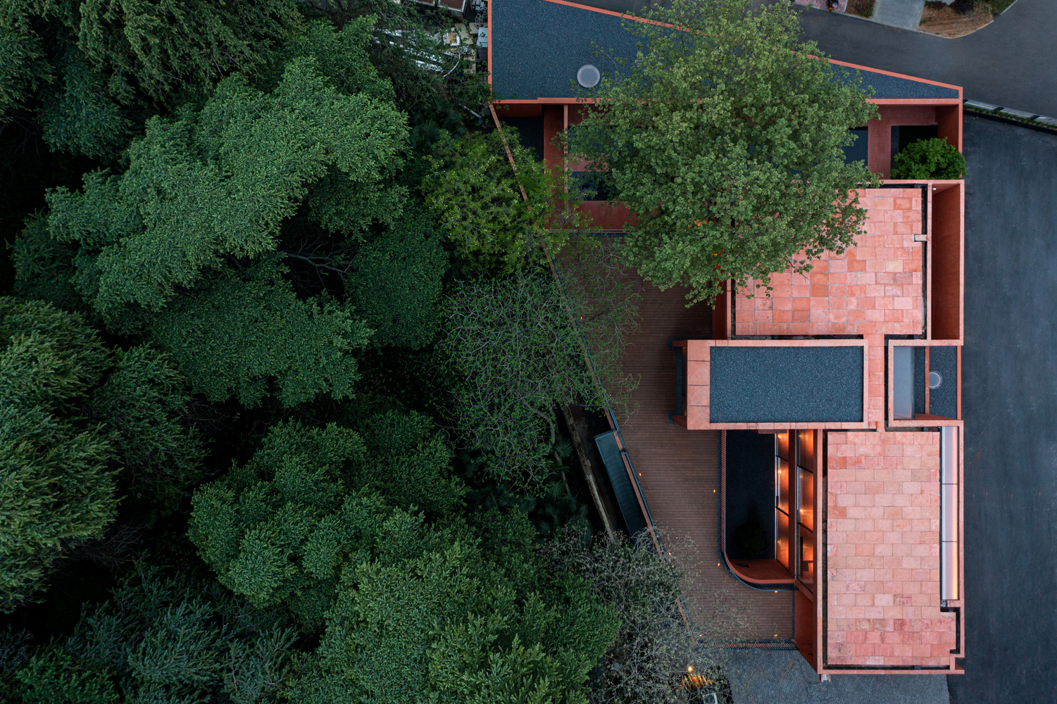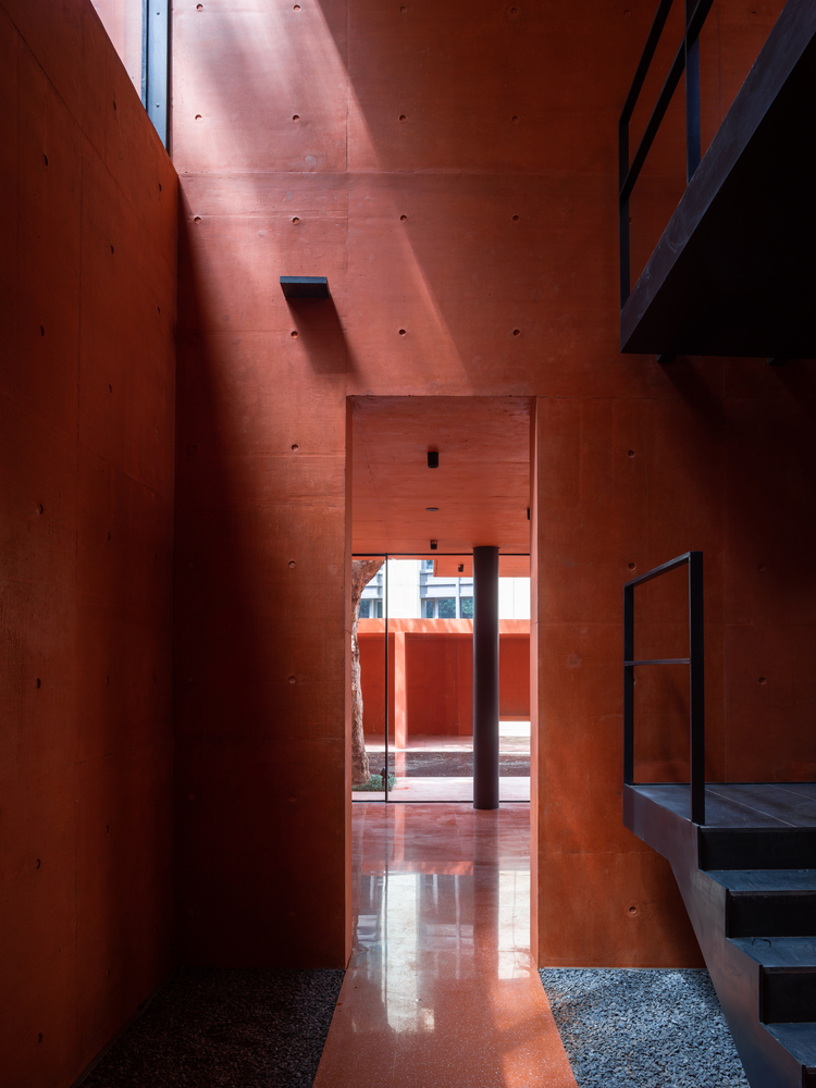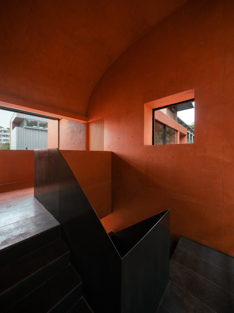 The Red Box is located at the foot of Red mountain, Naning, which is also in the Hongchuang park designed by Mix architecture. With the forest surrounding Red mountain, the sculptural volume of the Red Box makes it unique. The Red Box is made up of red concrete. "Red" responds to the environment, which has three different meanings. First, the Red Box responds to the "red" of chronological memory. Hongchuang PARK, which is formerly known as Nanjing Combat Machinery Factory. Nanjing Combat Machinery Factory was founded in the 1950s and has experienced vigorous development since the founding of New China. The "red" memory has accompanied the growth of several generations. Secondly, in response to the "red" of the original red brick building of the Hongchuang PARK factory area, Mix Architecture decided to make the Red Box a unique building with the same rhythm as the factory.