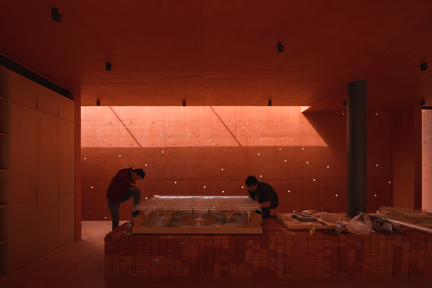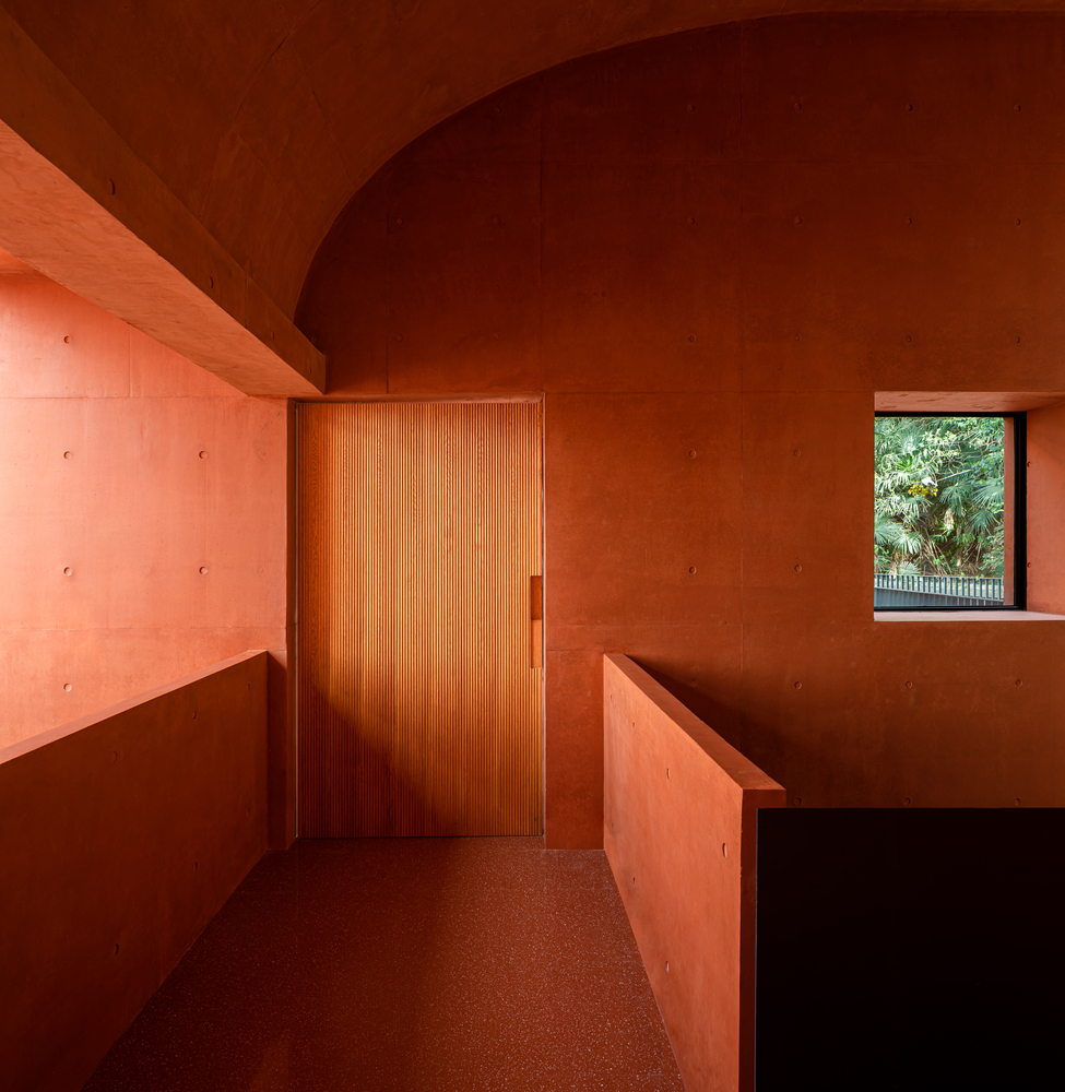 The building is located on the south side of the entrance plaza of the park, it is like a red stone lying quietly at the foot of the lush Red Mountain. Entering deeper, people quickly become aware of the unfolding of a red spatial experience different from their daily routine. The entrance to the building resembles a small angle cut from the bottom of a reclining stone. It’s not prominent, dominated with darkness, ups and downs, twists and turns, as if entering a dimly red cave. A wooden door, along with the wood texture and the vertical corrugated texture on the surface, next to the curved wall into the deep space, smoothly adds a touch of softness to the cave. With subtle light from a circular hole at the top of the cave, the gentle light penetrates through the circular hole on the wooden door, indicating that people can enter. Reaching into the circular hole of the red and dimly lit space, grasping the black metal handle standing in the soft light, and pushing open the wooden door, soft light spills out, captivating those who enter.