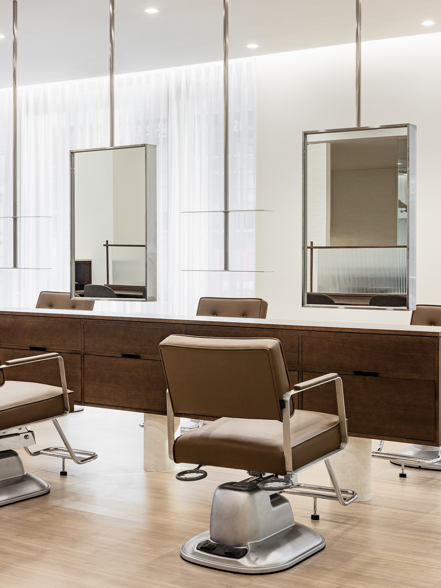 More on Shinnonhyeon is a minimalist salon located in Seoul, South Korea, designed by Orosy Studio. More On Hair Shop introduces a welcoming and elegant environment centered around the motto “A space that enhances everyday happiness.” The primary design element employed is wood, a material that exudes warmth and approachability. Notably, the dressing table furniture redefines the conventional salon setup, prioritizing customer comfort and convenience in assessing their style. A noteworthy addition to the space is the mirror, skillfully crafted from a combination of sleek metal and wood. The variety of furnishings showcased at More On Hair Shop exemplifies its role as more than just a typical hair salon; it serves as a destination that offers a contemporary lifestyle experience. The shampoo room, designed with an atrium like feel, takes a central location with dual access points. Each shelf in the shampoo room boasts a unique shape, and the open design of the hallway’s shelf-type furniture is particularly striking, ensuring a spacious and uncluttered ambiance.