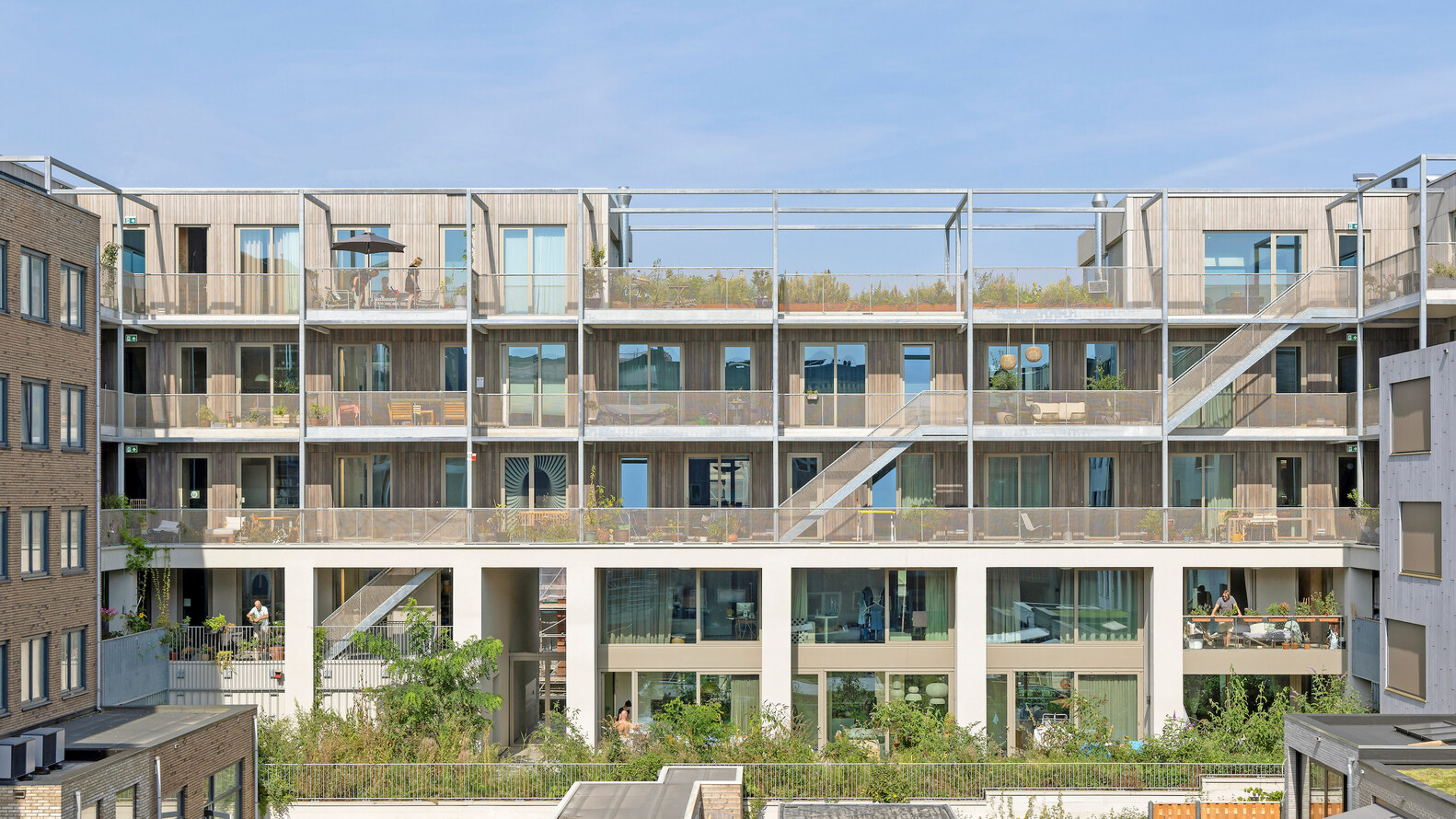 Residents had the option to select from a variety of housing types, such as garden maisonette, panoramic apartment, or live work studio, to accommodate the diverse households that make up wij_land. The residents gave individual expression to the dimensions of the window frames, coarse or fine ridges in the aluminium facade, planters on the balconies, and the layout of the floor plan. This resulted in homes as varied as the residents themselves.