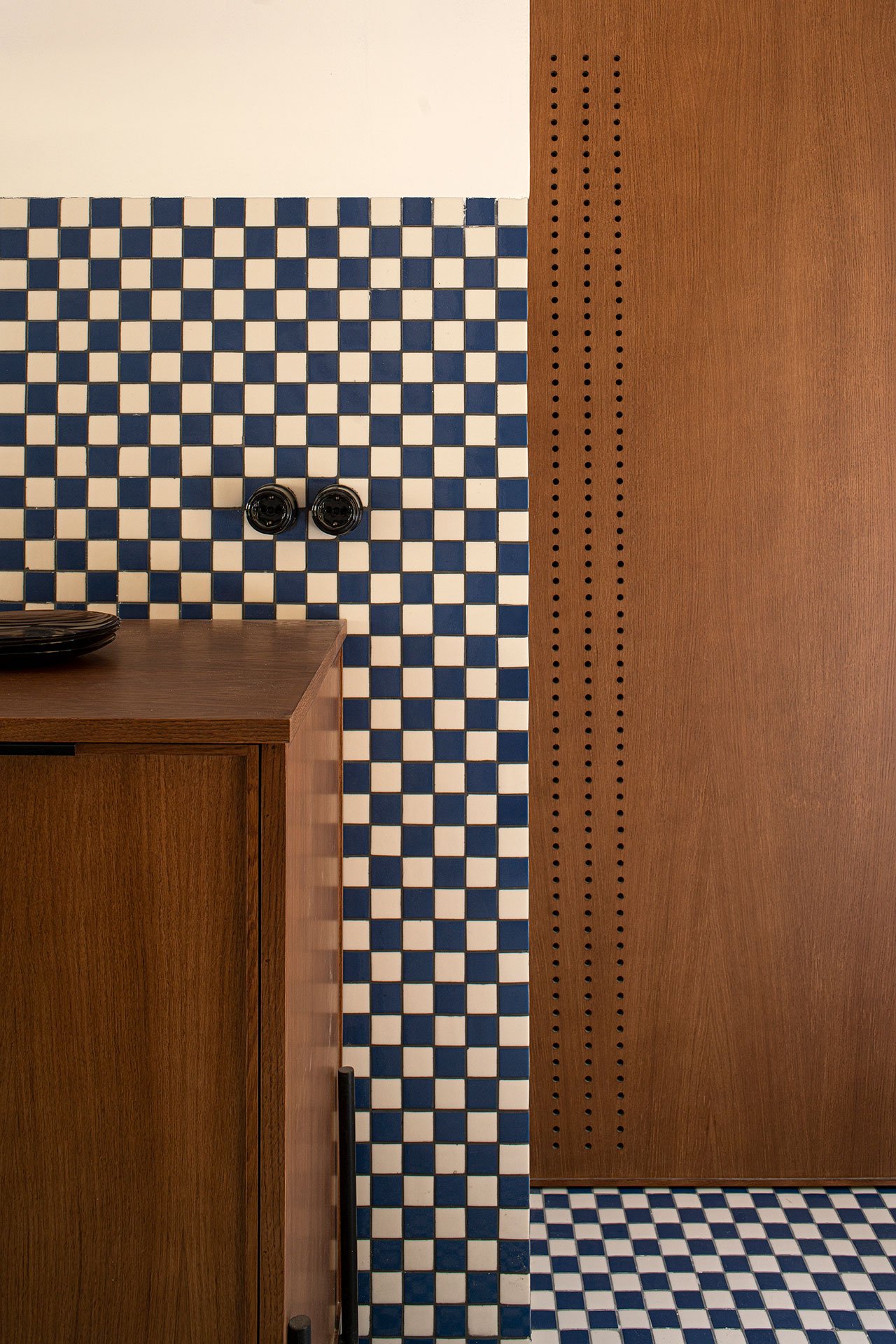 Built in 1946, the two storey house had been left abandoned for numerous years, to the detriment of its building fabric. Stripped down to its core, the property’s original masonry walls have been partly left exposed, while its decorative mouldings have been meticulously refurbished, a testament to the team’s background in architectural heritage conservation. The weathered brickwork is contrasted with the white and blue checkerboard tiling, which the team also applied across the floors and part of the walls. Moderately modern in sensibility, the graphic tile design is a nod to the neighbourhood’s centuries-old local tradition of covering building facades with brightly coloured tiles, usually in maritime shades like blue, green and white, often featuring zigzag or checkerboard patterns. Timber furnishings, which include salvaged carpentry such as doors that have been stripped and waxed, along with new elements rendered in the same finish, serve to bring everything harmoniously together.