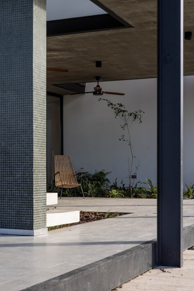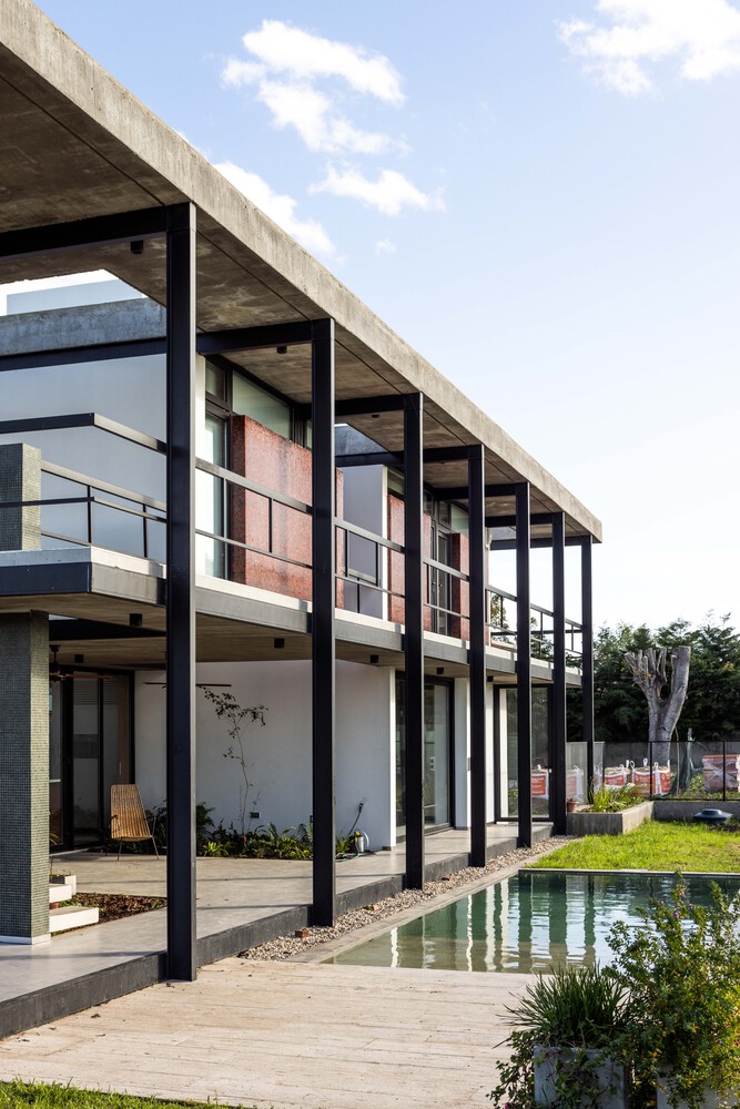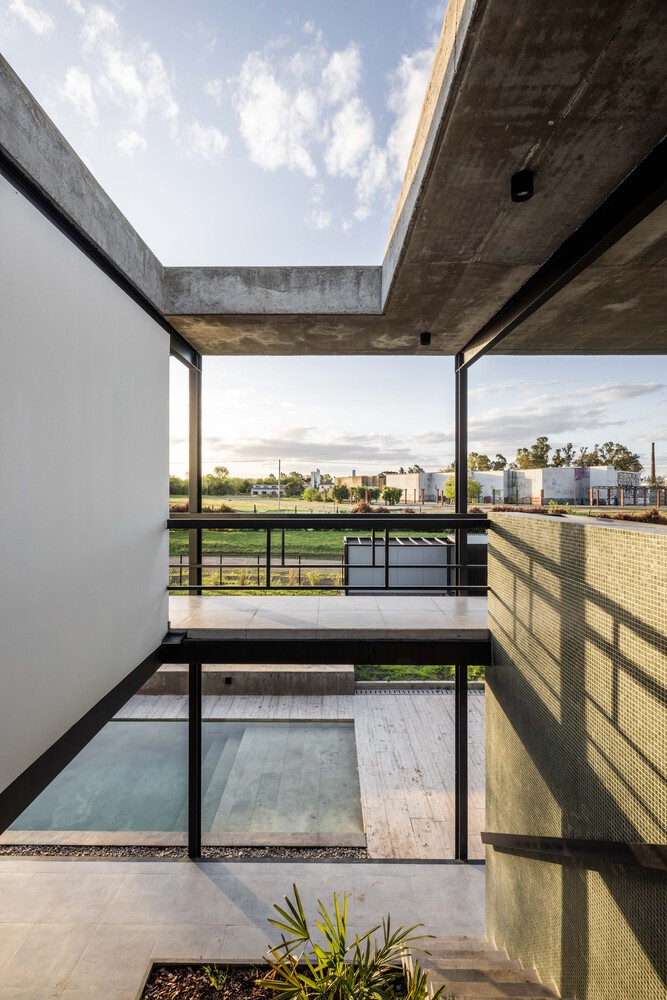 The house is conceived as a prism leaning against the south side of a square corner lot of approximately 30m on each side, releasing a large void towards good orientation. The absence of pre existing vegetation, a condition of new private urbanizations in the periphery, made it necessary to design a "porous" house that includes a large number of intermediate shaded spaces.