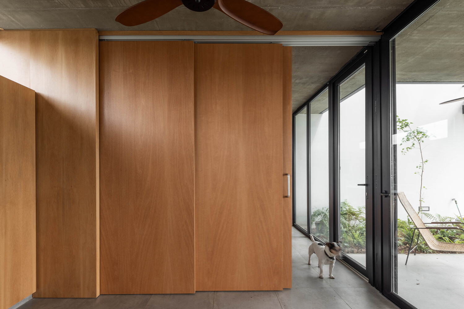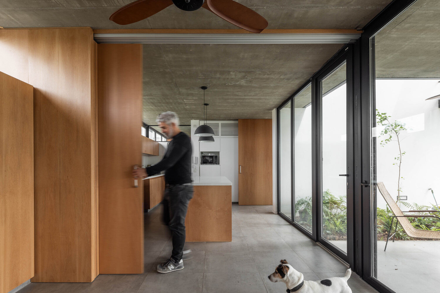 The south face, blinder, capitalizes on the mandatory perimeter withdrawal from upper continuous windows that guarantee cross ventilation in both the social ground floor and the first floor, where the private areas are located.