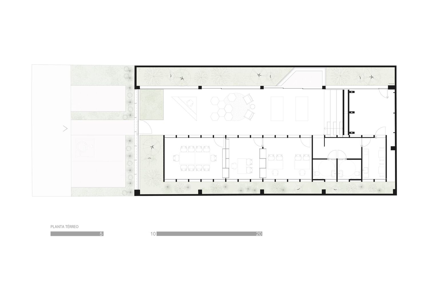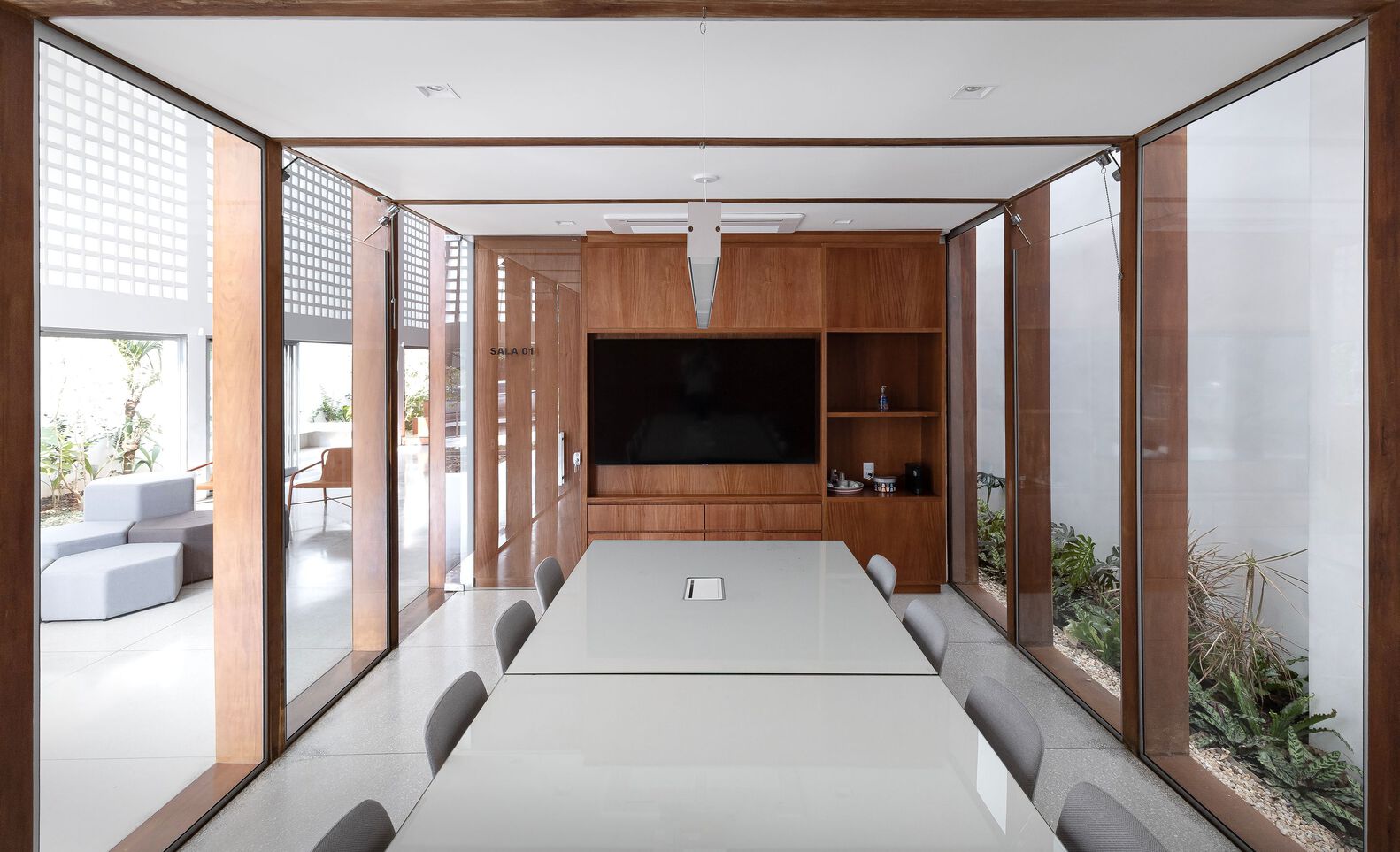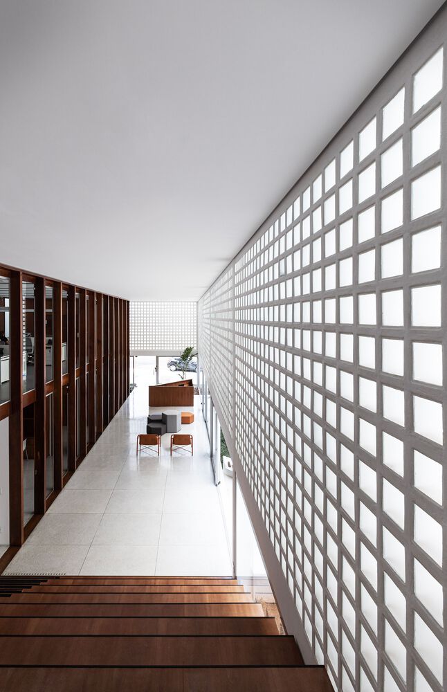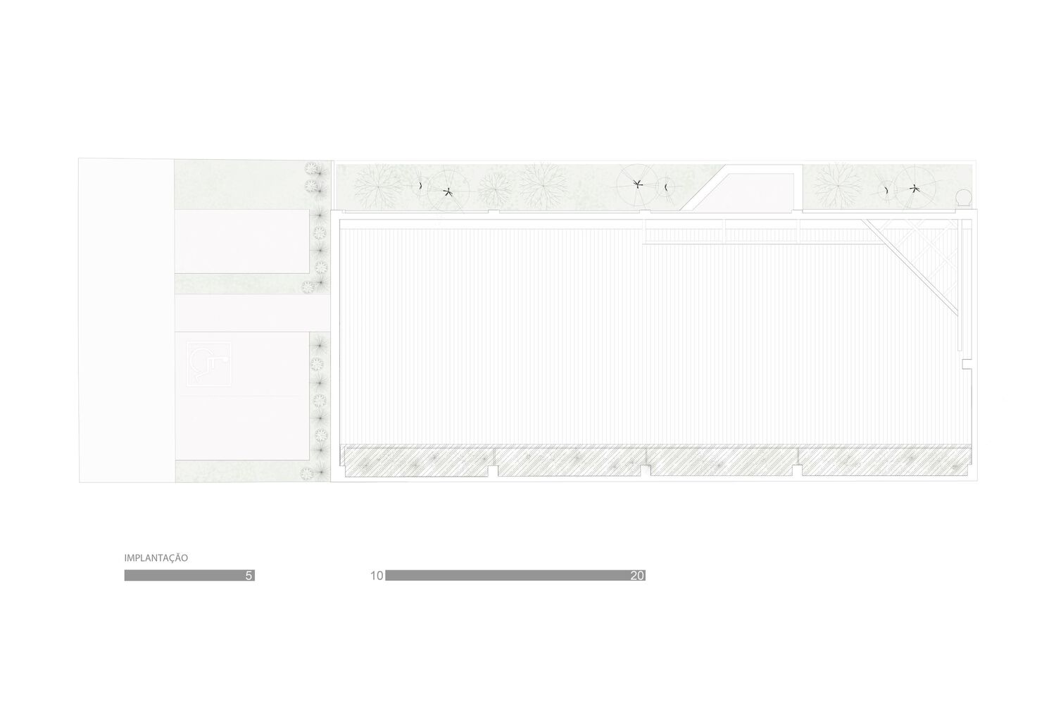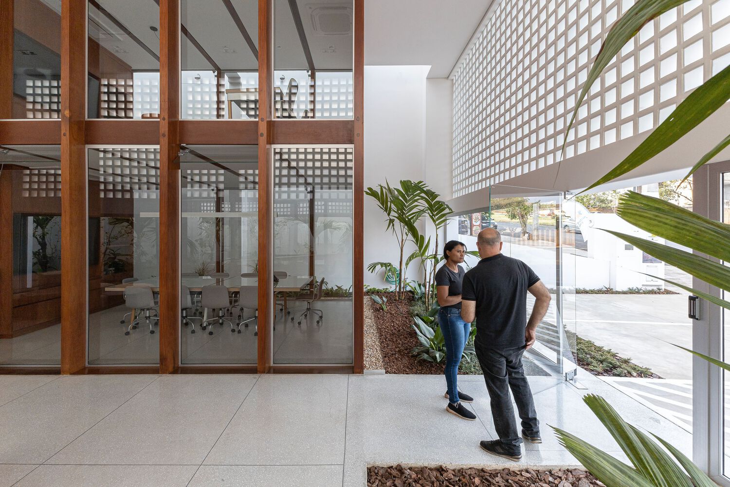 The redesign of the existing warehouse to house the Newe company headquarters stands out for the introduction of a new volume that encompasses all scheduled activities. It is a box inserted inside another, providing a unique spatial dynamic, characterized by a longitudinal format. This internal layout creates an environment of arrival, welcome and interaction. The architectural proposal incorporates the strategic use of translucent tiles on the roof, in addition to front and side panels made of cobogós. These elements are used with the aim of maximizing the entry of natural light onto the two main surfaces of the external box. This approach not only promotes natural lighting, but also facilitates connection with the adjacent gardens, present on the borders of the space.