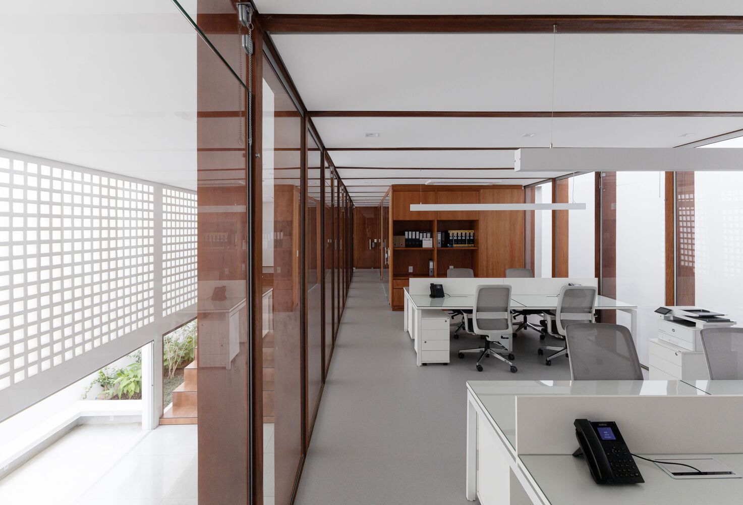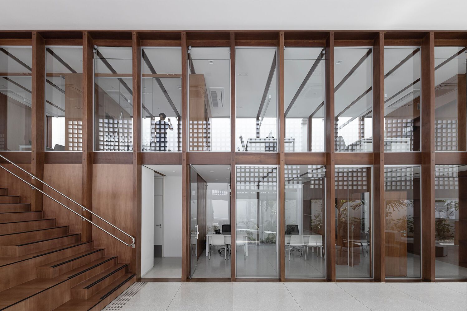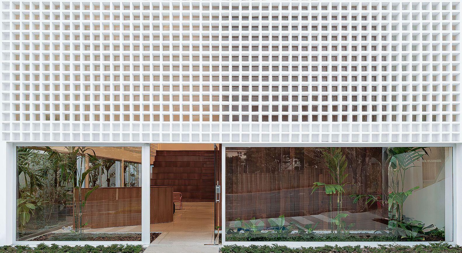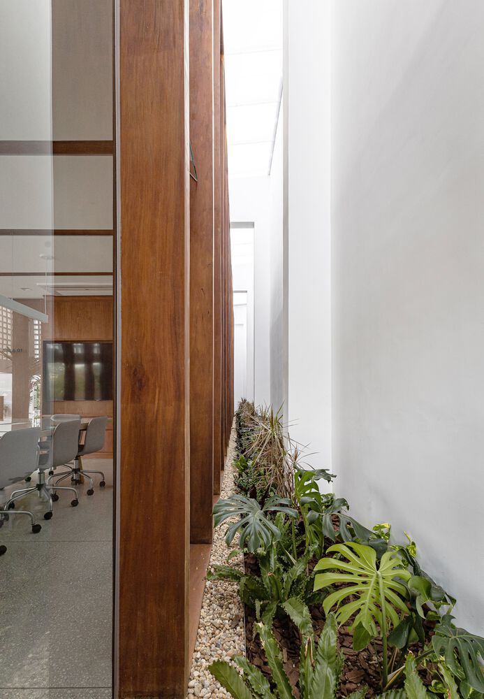 The redesign of the existing warehouse to house the Newe company headquarters stands out for the introduction of a new volume that encompasses all scheduled activities. It is a box inserted inside another, providing a unique spatial dynamic, characterized by a longitudinal format. This internal layout creates an environment of arrival, welcome and interaction. The architectural proposal incorporates the strategic use of translucent tiles on the roof, in addition to front and side panels made of cobogós. These elements are used with the aim of maximizing the entry of natural light onto the two main surfaces of the external box. This approach not only promotes natural lighting, but also facilitates connection with the adjacent gardens, present on the borders of the space.