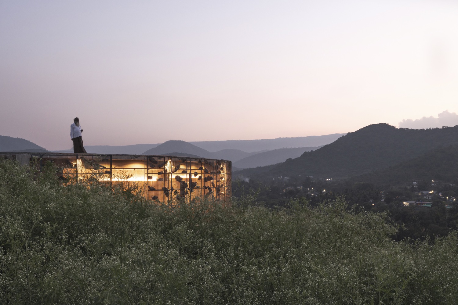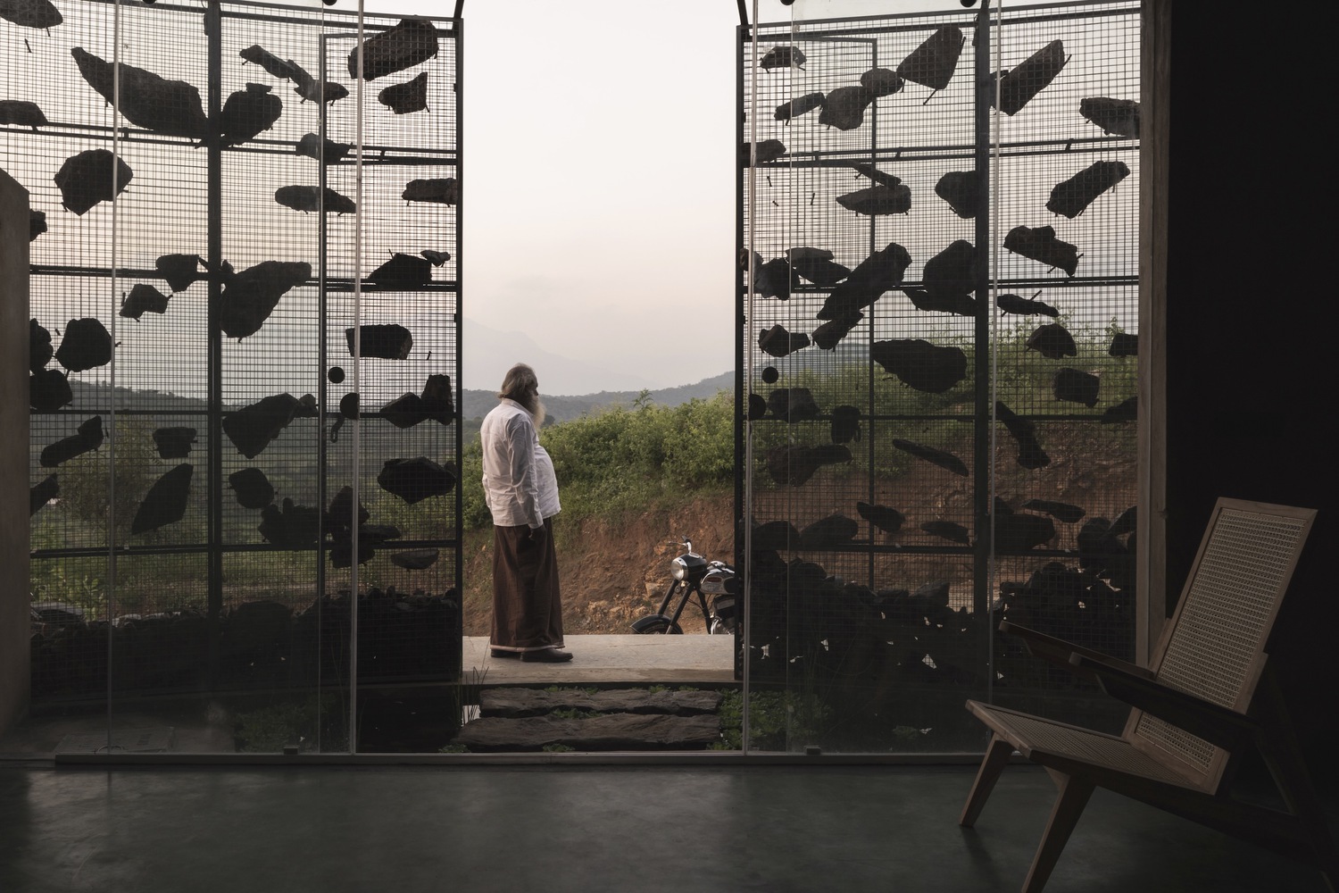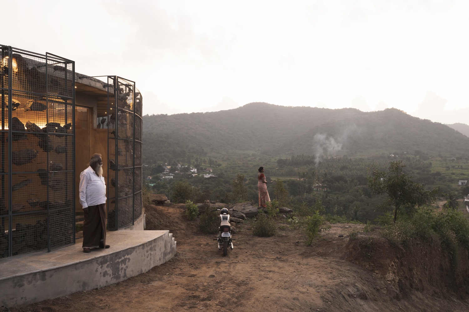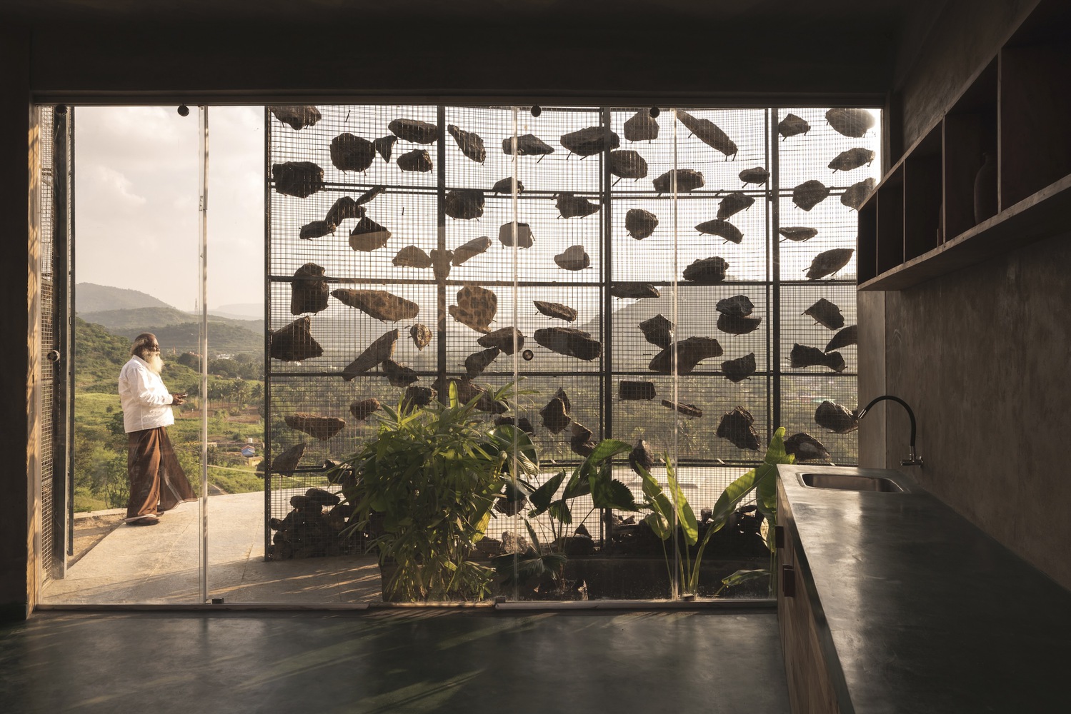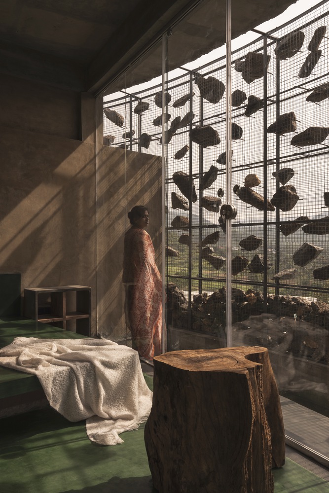 All the rocks used in the gabion wall are collected from the site. There is always a difference between viewing directly and viewing indirectly at a sight. The indirect look always gives an interesting factor and increases the urge to find out about the space. This is also a major factor for this gabion wall, where we look through the series of mountains from various perspectives. The walls in between the spaces are poured earth walls where the mud used in the walls is from the site, which made it easier for the construction. The Floor finish is made of green oxide, which helps keep the spaces inside cooler than the outside temperature.