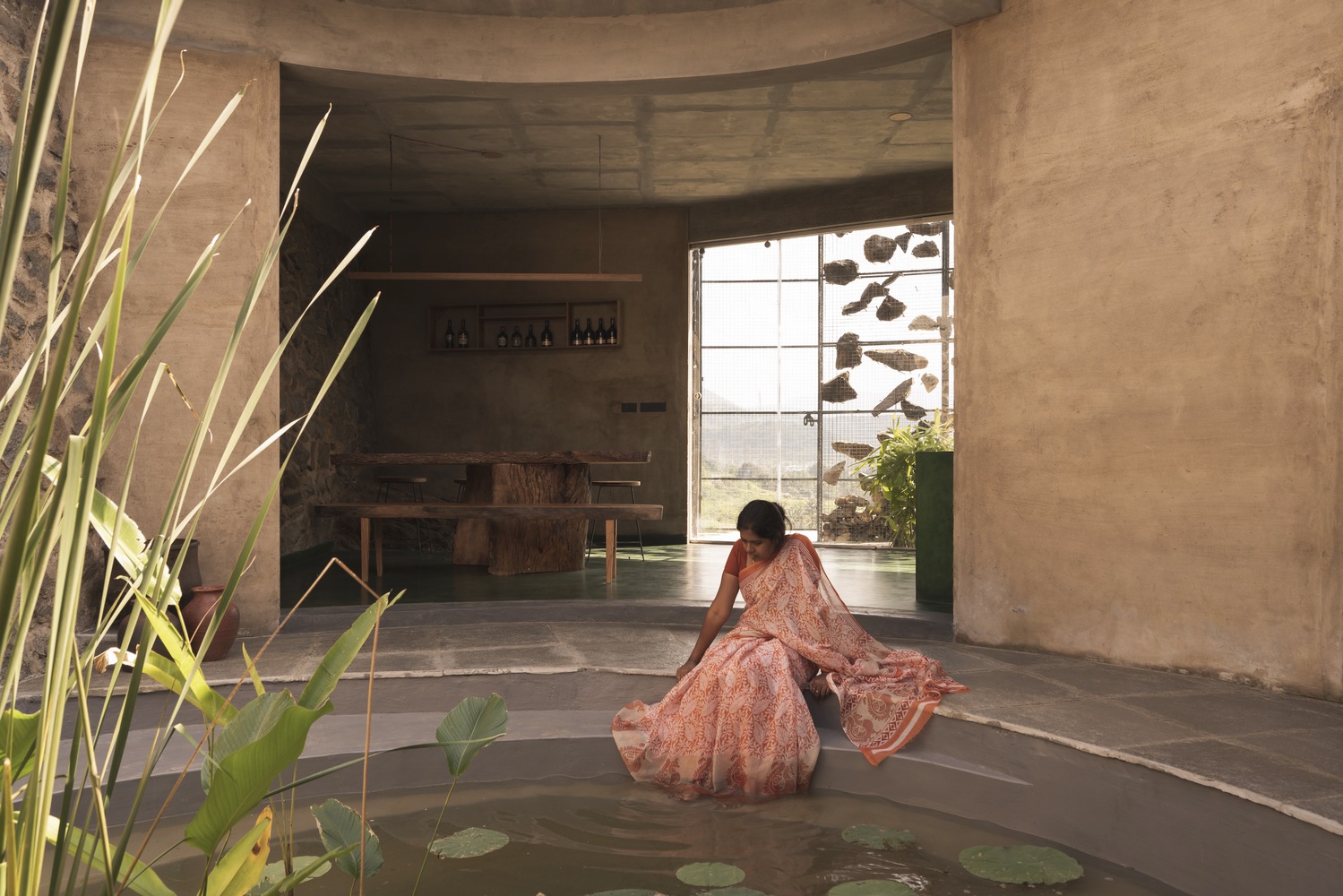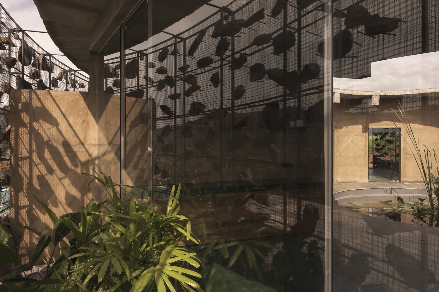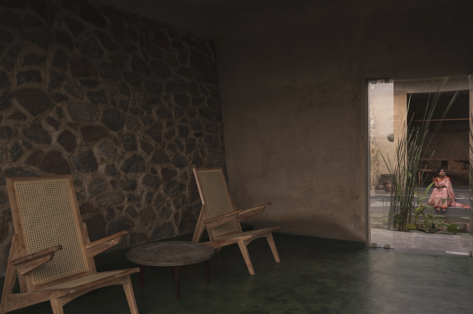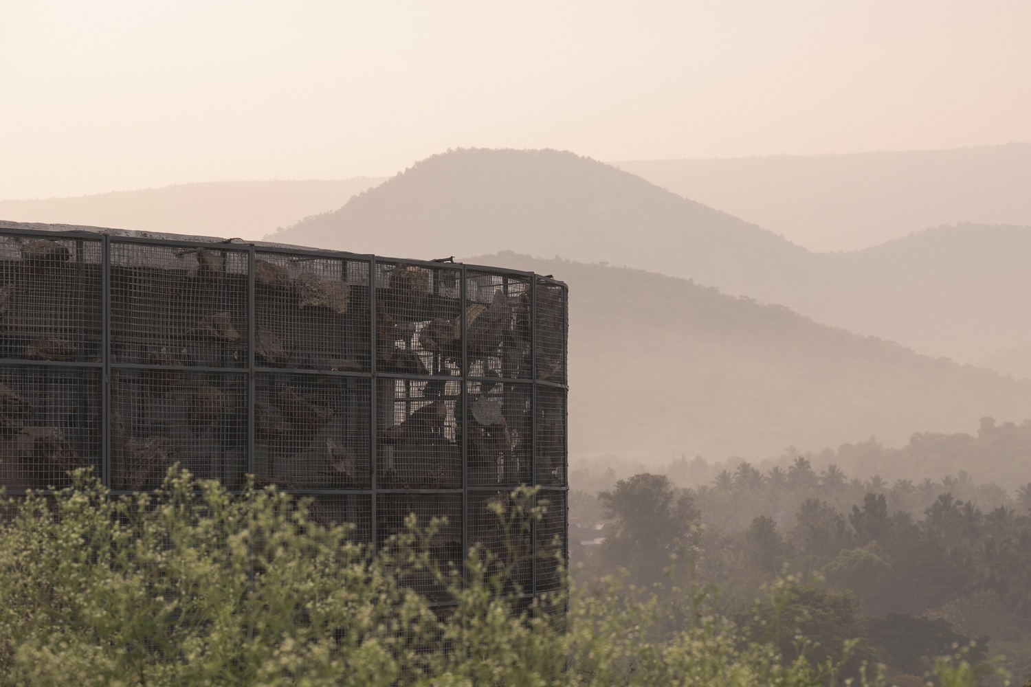 All the rocks used in the gabion wall are collected from the site. There is always a difference between viewing directly and viewing indirectly at a sight. The indirect look always gives an interesting factor and increases the urge to find out about the space. This is also a major factor for this gabion wall, where we look through the series of mountains from various perspectives. The walls in between the spaces are poured earth walls where the mud used in the walls is from the site, which made it easier for the construction. The Floor finish is made of green oxide, which helps keep the spaces inside cooler than the outside temperature.
