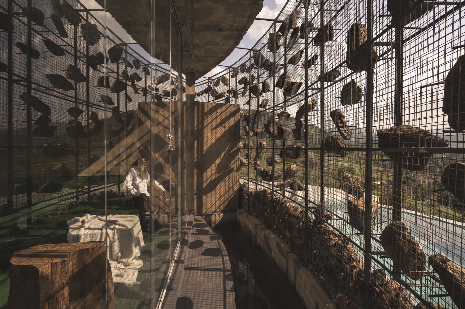 이 사이트는 산맥 한가운데에 위치하고 있습니다. 앞에는 깊은 계곡이 있고 아름다운 산들이 180도 시야에 들어옵니다. 대지에는 천연 암반이 있고 건축가로서 우리는 자연 지형을 방해하고 싶지 않았습니다. 또한 처음 방문했을 때 이미 6m 깊이로 땅을 깎아놓은 상태였습니다. 우리는 그 지형을 이용해 계곡을 바라보는 구조물을 만들었습니다. 또한 부지 전체에 평균 2~4m 깊이의 경사 차이가 있는 바위가 많았습니다. 계곡을 향해 공간을 배치하고 중간에 중정을 두어 건물 내부에 자연 채광과 환기가 잘 되도록 했습니다. 부지의 특성상 바람의 흐름이 심해 유리 칸막이가 어려울 수 있고, 직접 노출되면 소음이 심하게 발생한다는 단점이 있었습니다. 여기서 가장 큰 문제는 멋진 전망을 원하면서도 바람의 직접적인 흐름을 원하지 않았다는 것입니다. 그래서 공간 내부의 인체공학적 활동에 따라 바위를 배치한 돌망태 벽을 통해 계곡을 바라볼 수 있도록 했습니다.translate by DeepL